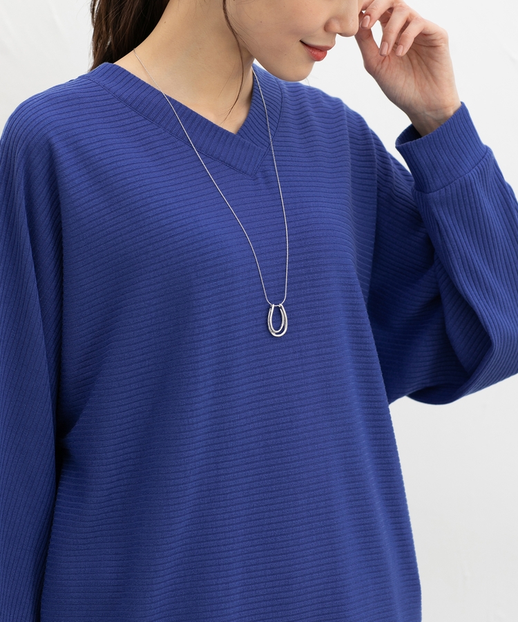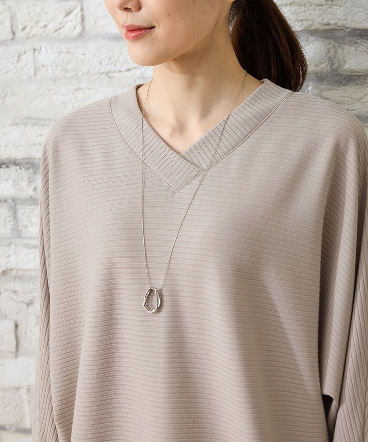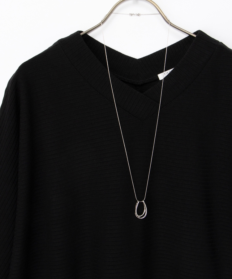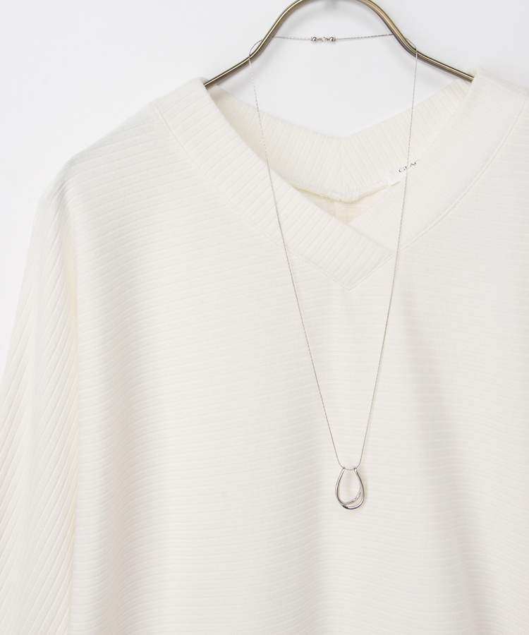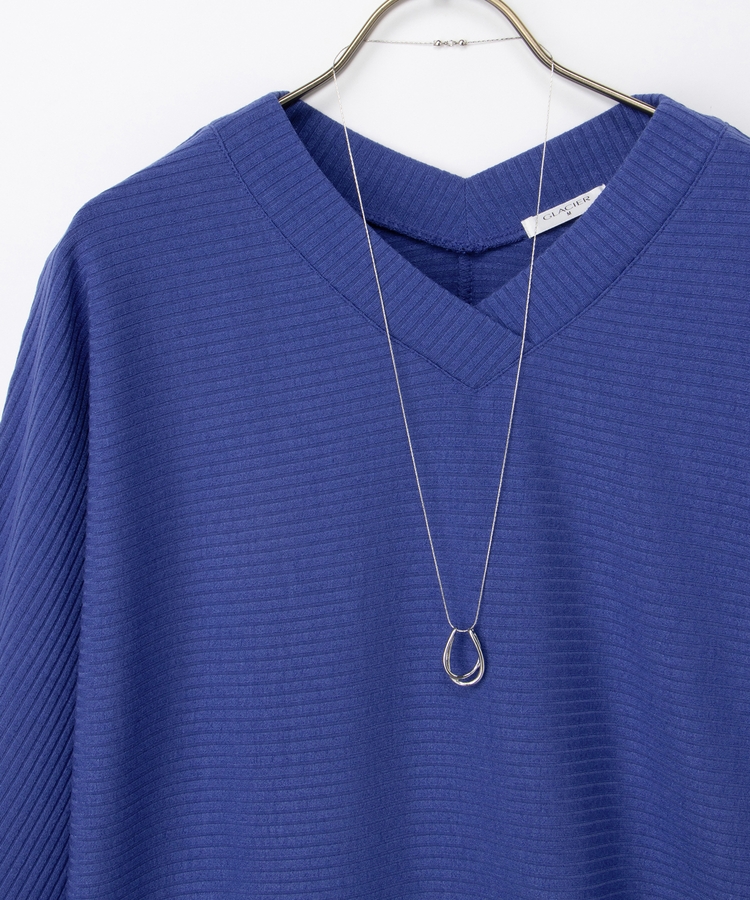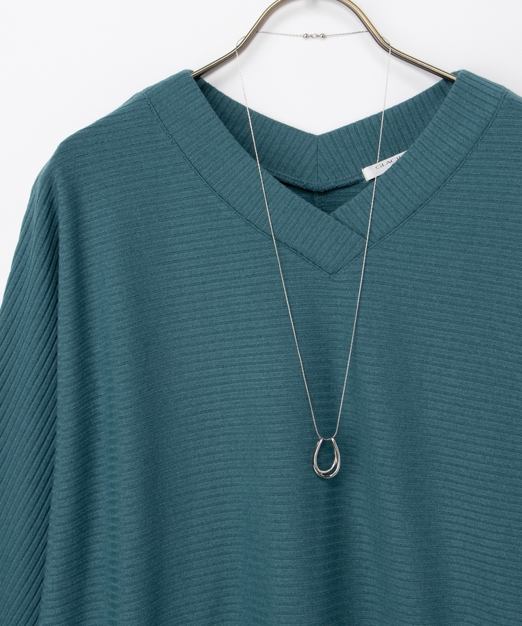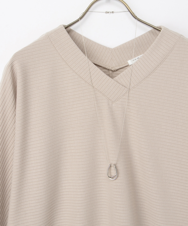 顔まわりをすっきり見せるVネックのシンプルデザインに映えるアクセサリー付き。