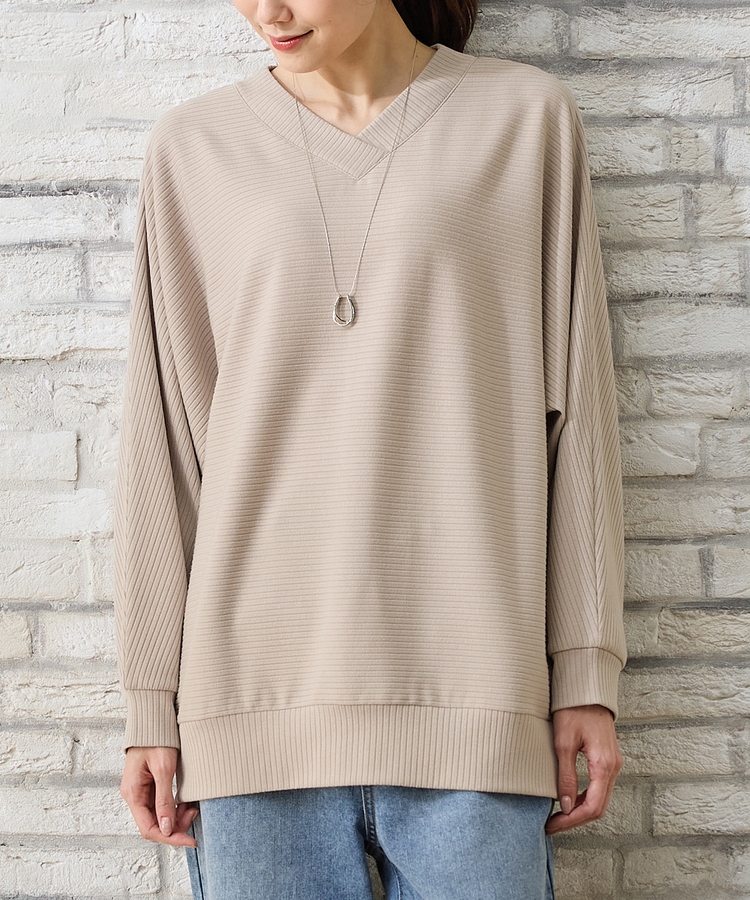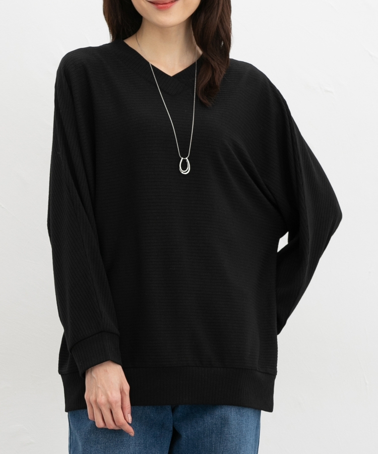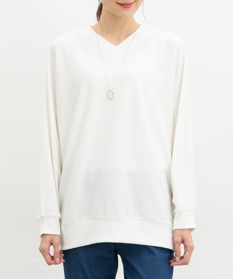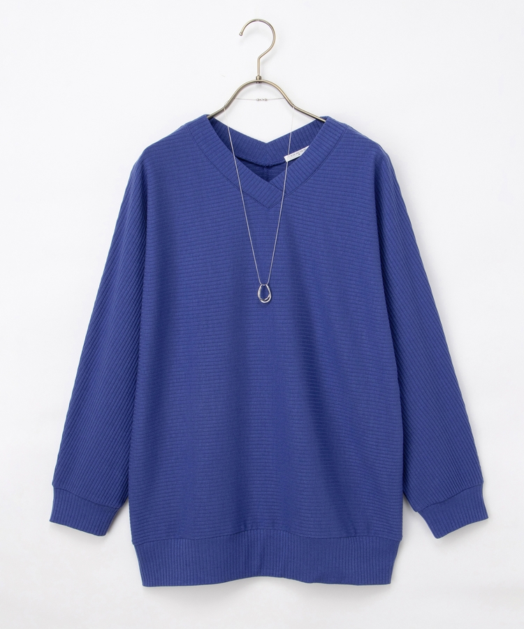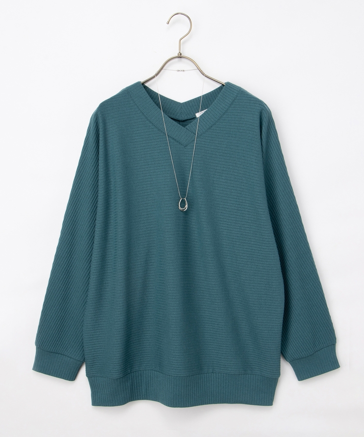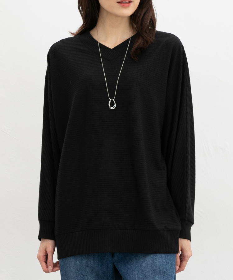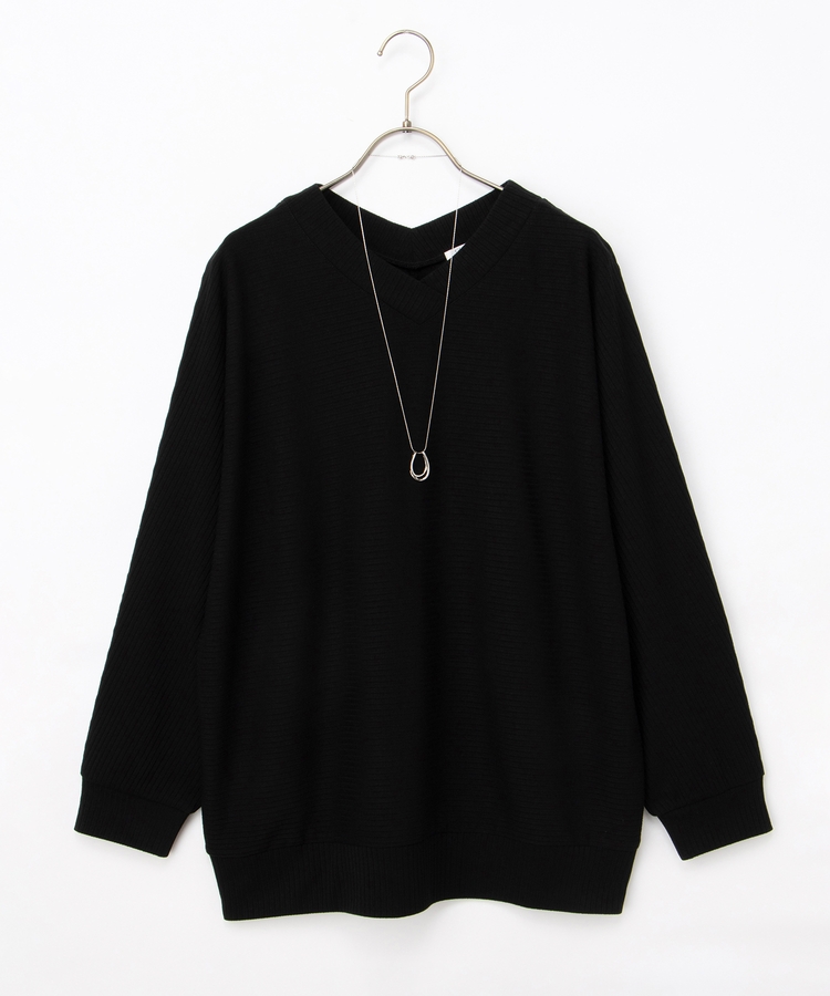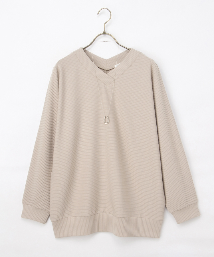 顔まわりをすっきり見せるVネックのシンプルデザインに映えるアクセサリー付き。