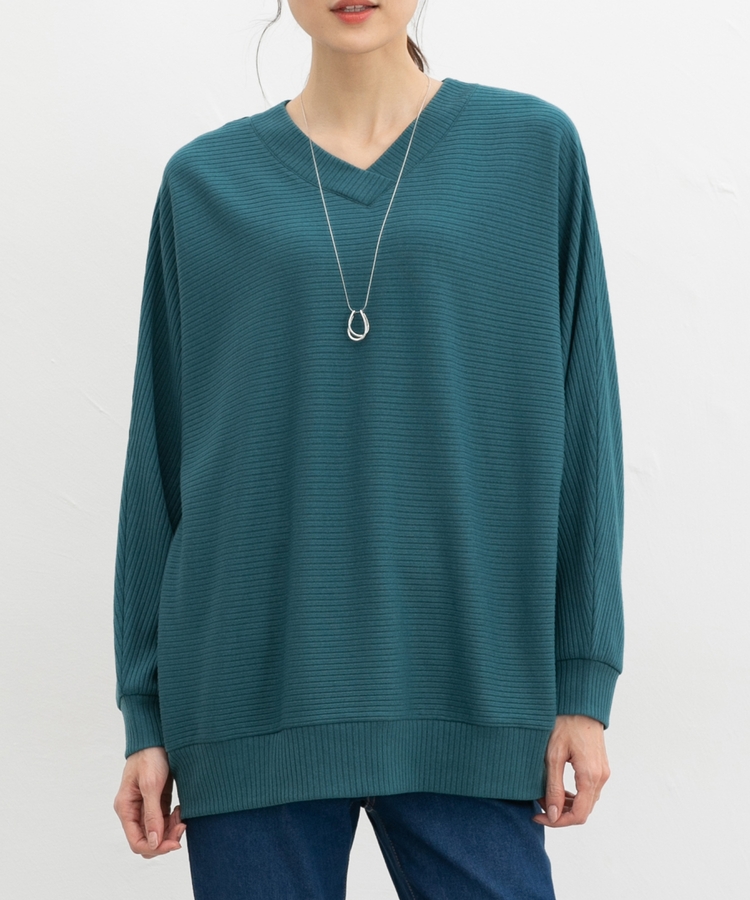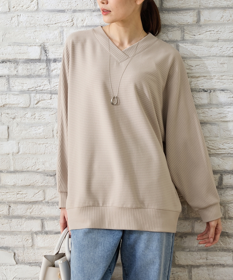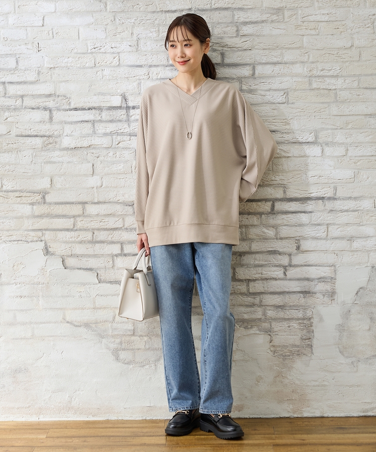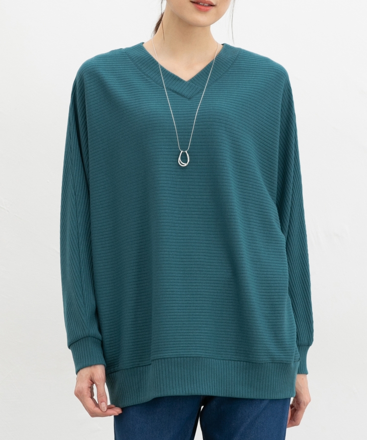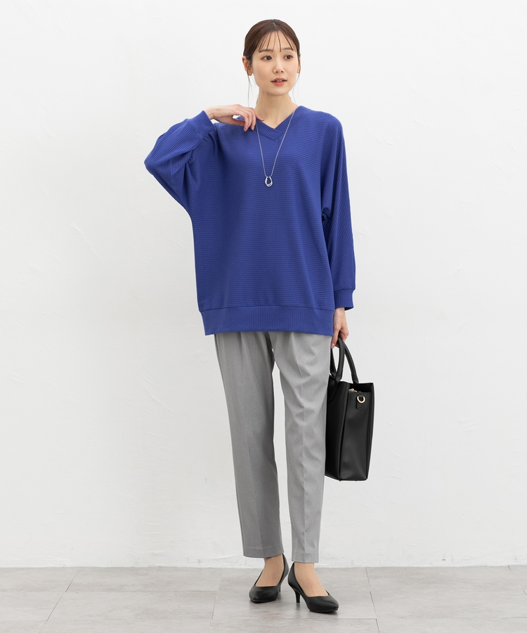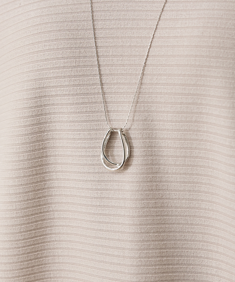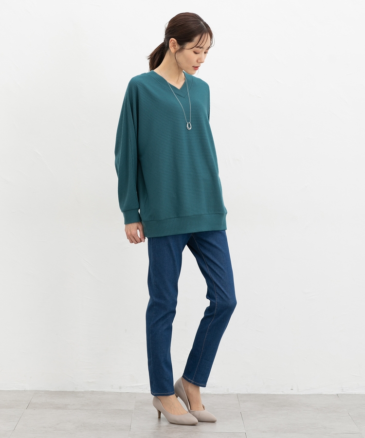 顔まわりをすっきり見せるVネックのシンプルデザインに映えるアクセサリー付き。