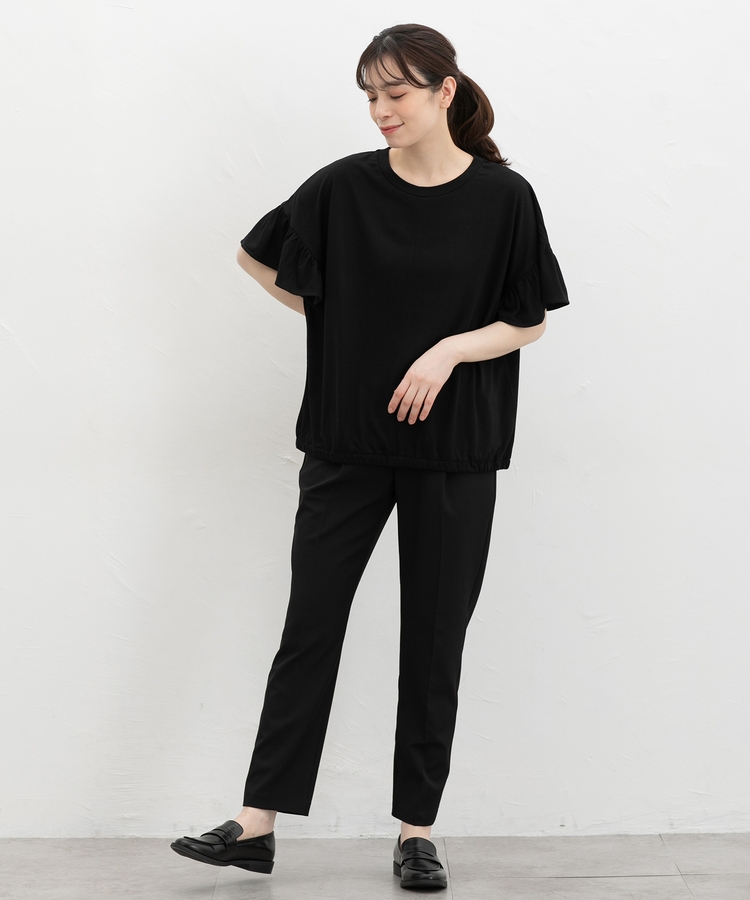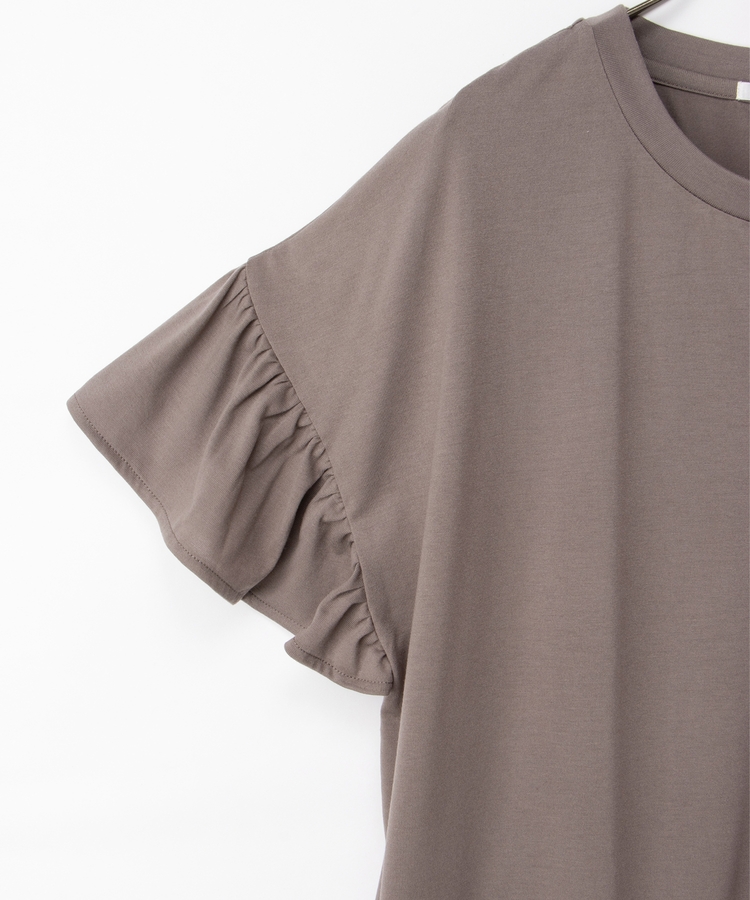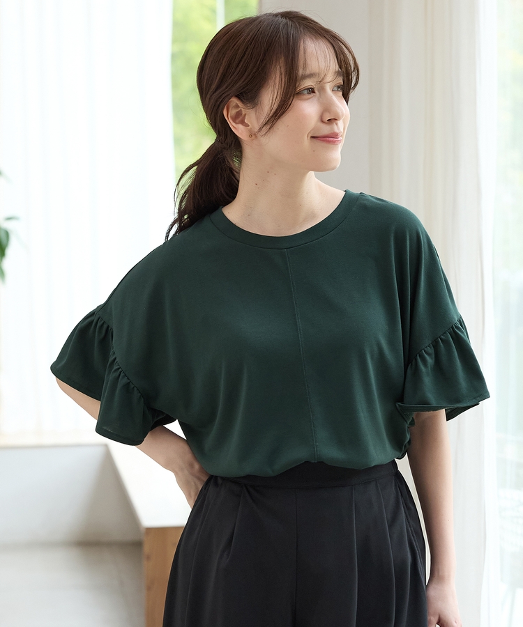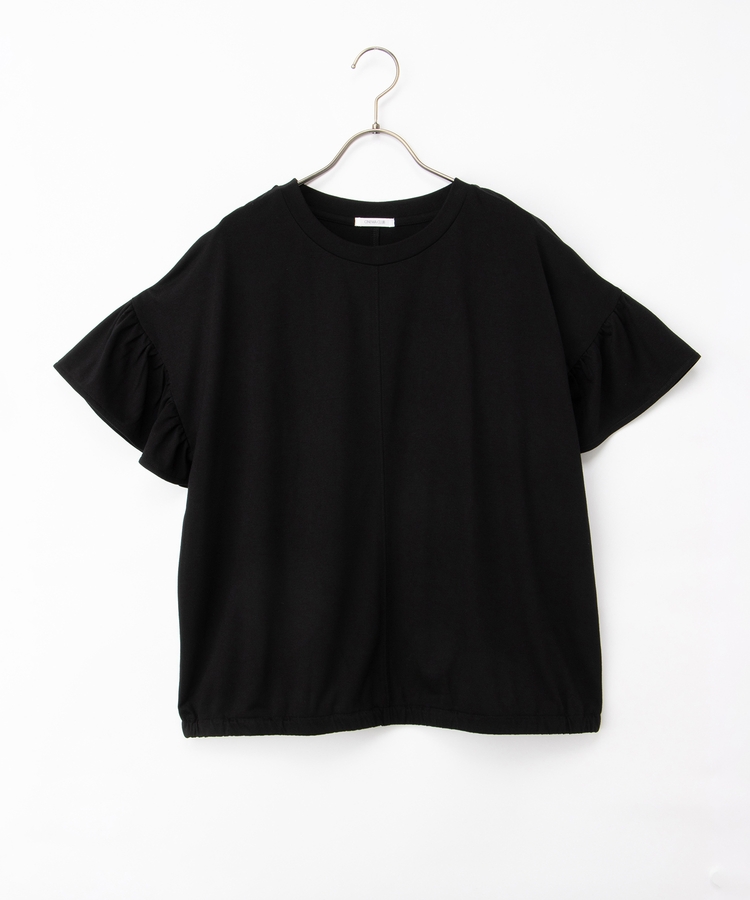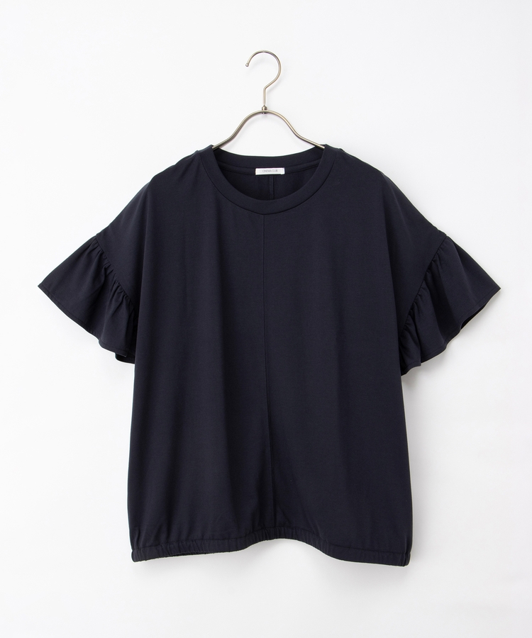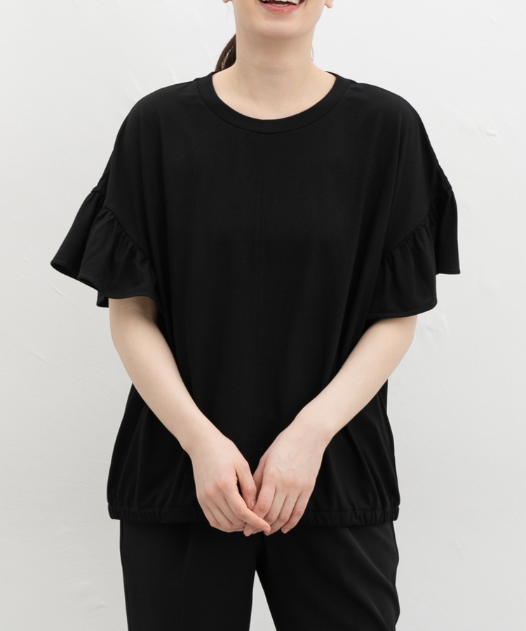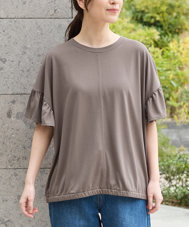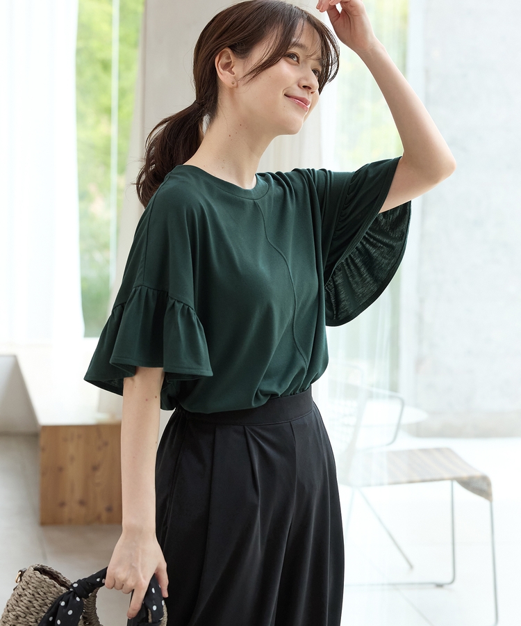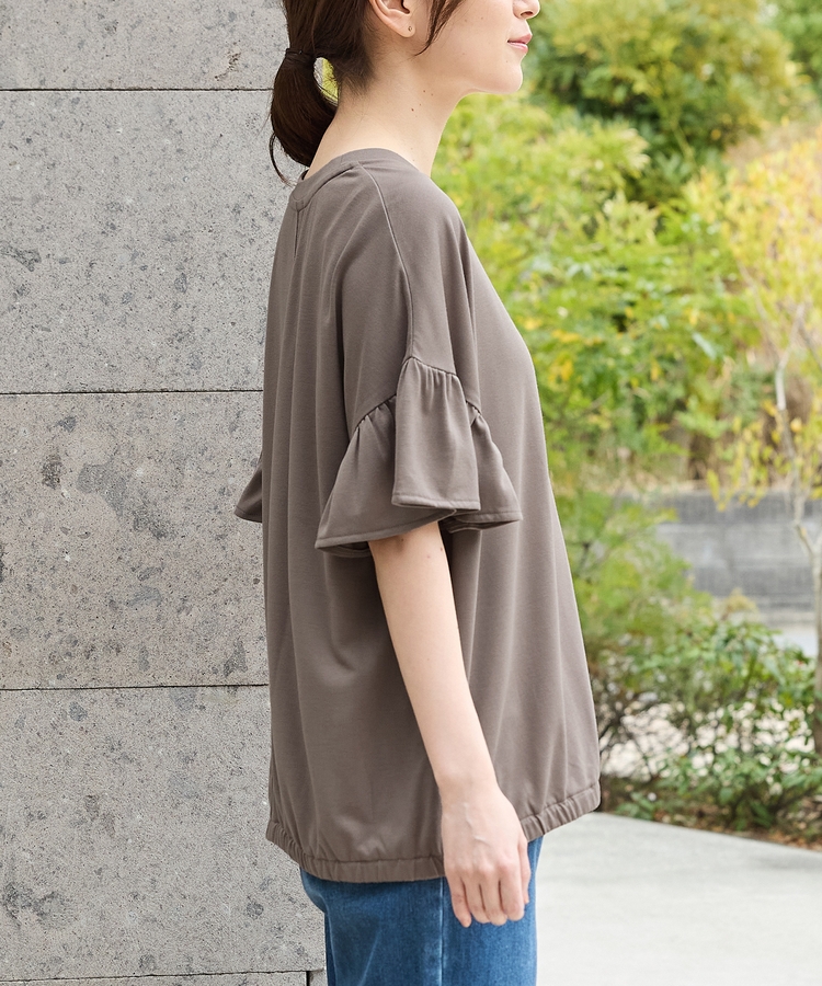 二の腕を華奢に見せるフレア袖と裾のバルーン感がおしゃれなデザイン。
