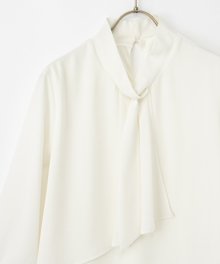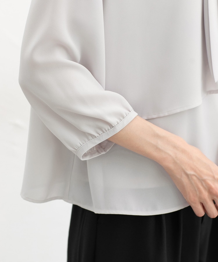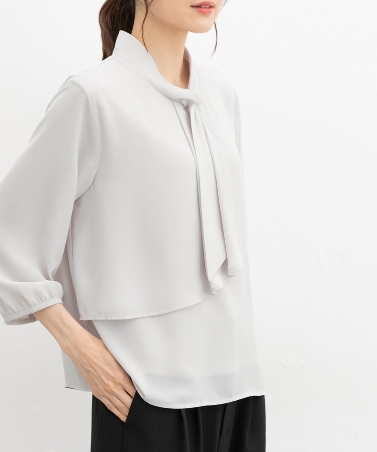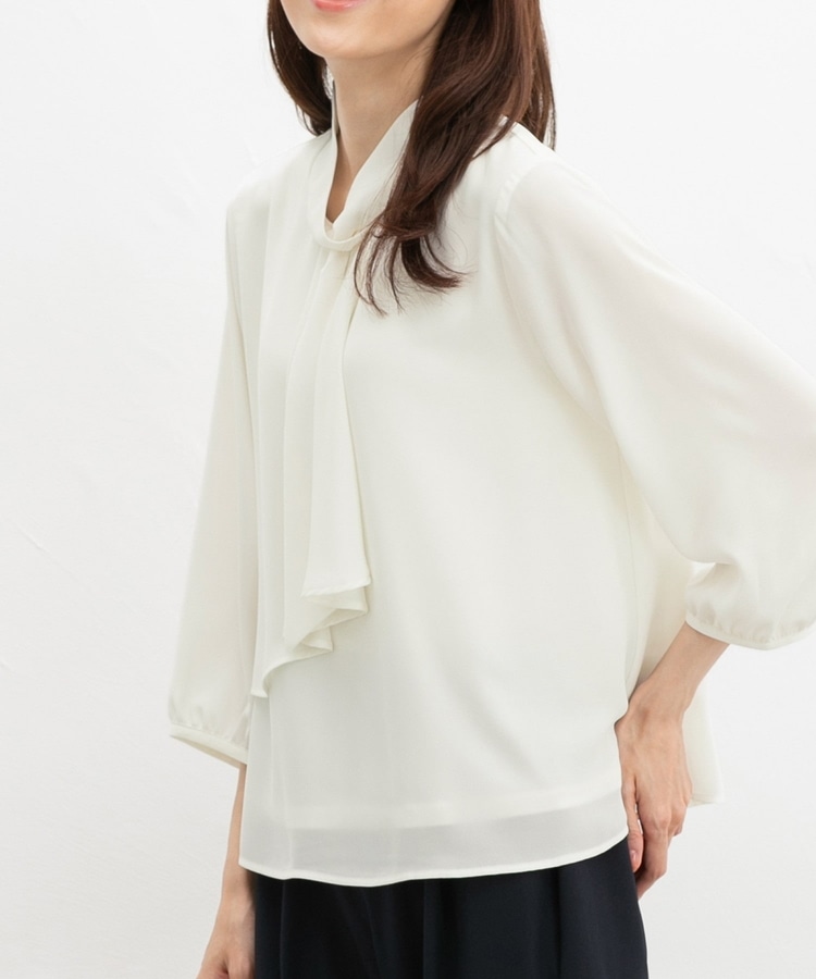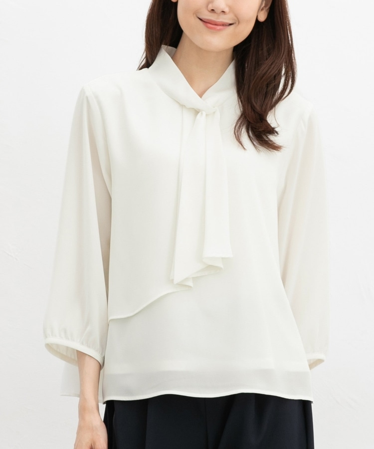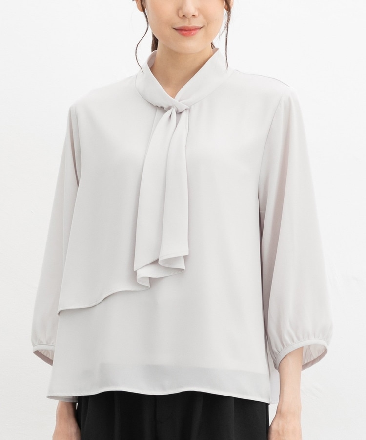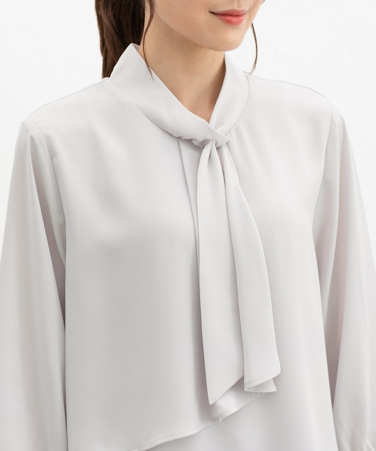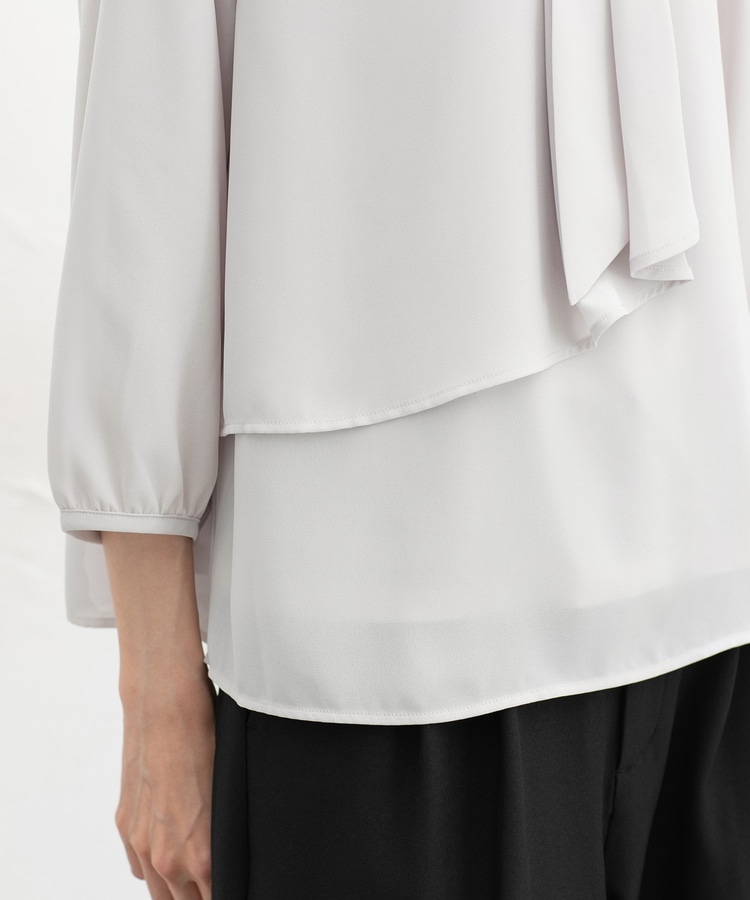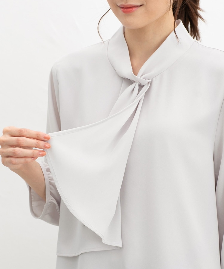 リボンを結ぶ必要のない、流れるようなドレープのボウタイとアシンメトリーなケープデザインが顔回りをさりげなく華やかに演出。