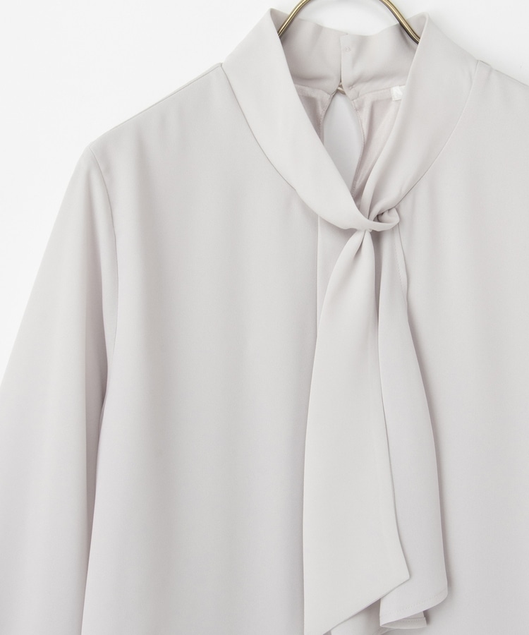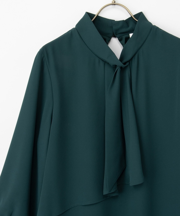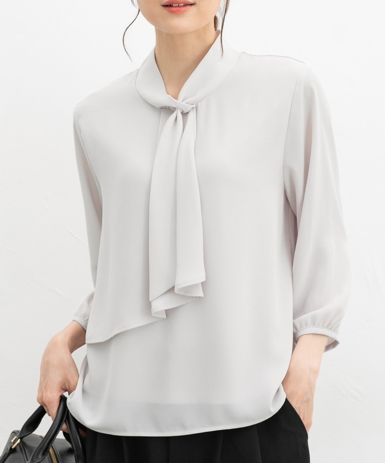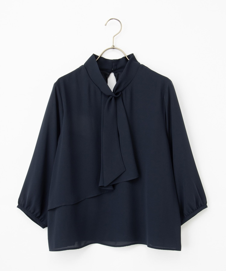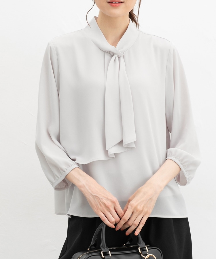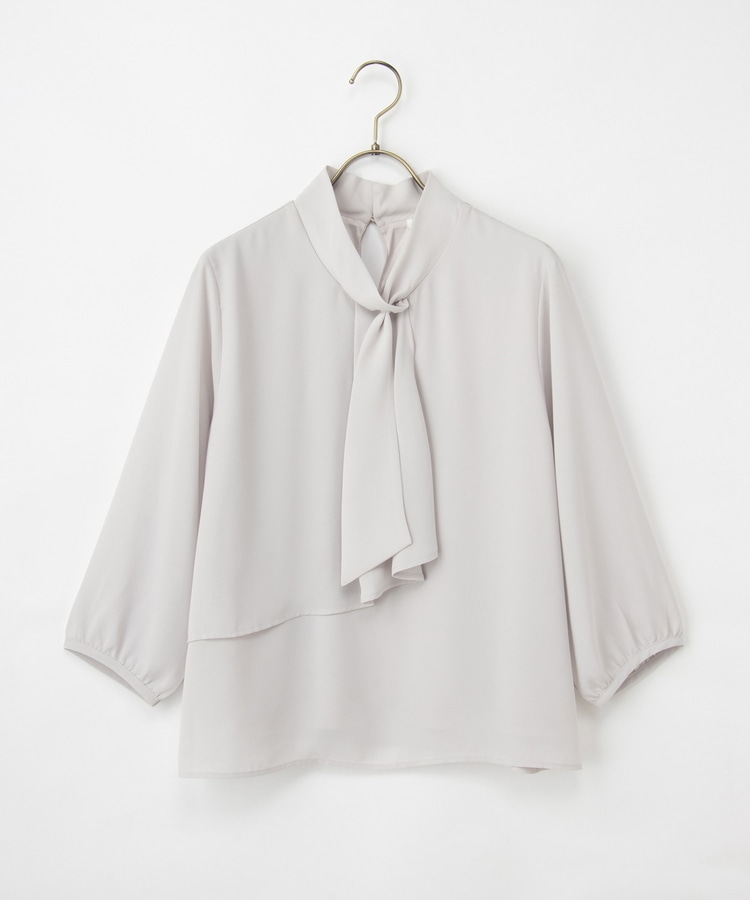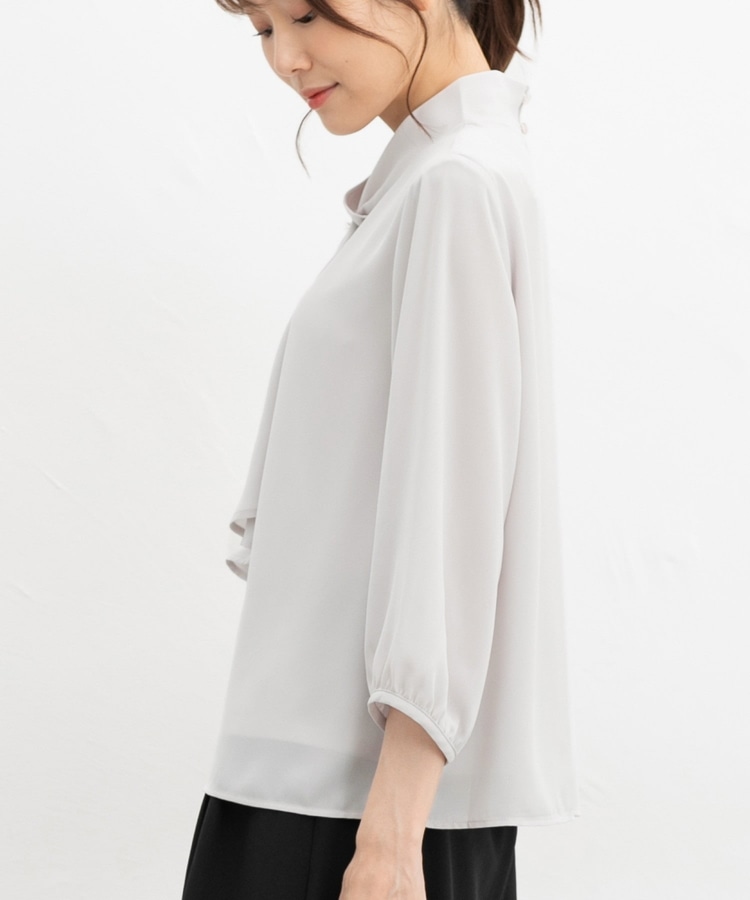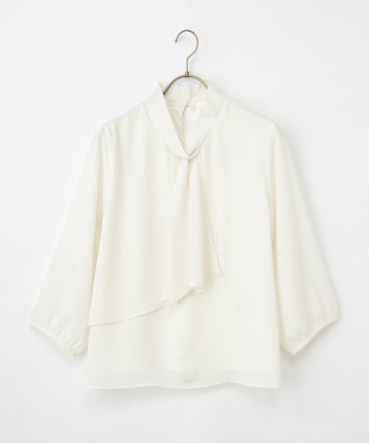 リボンを結ぶ必要のない、流れるようなドレープのボウタイとアシンメトリーなケープデザインが顔回りをさりげなく華やかに演出。