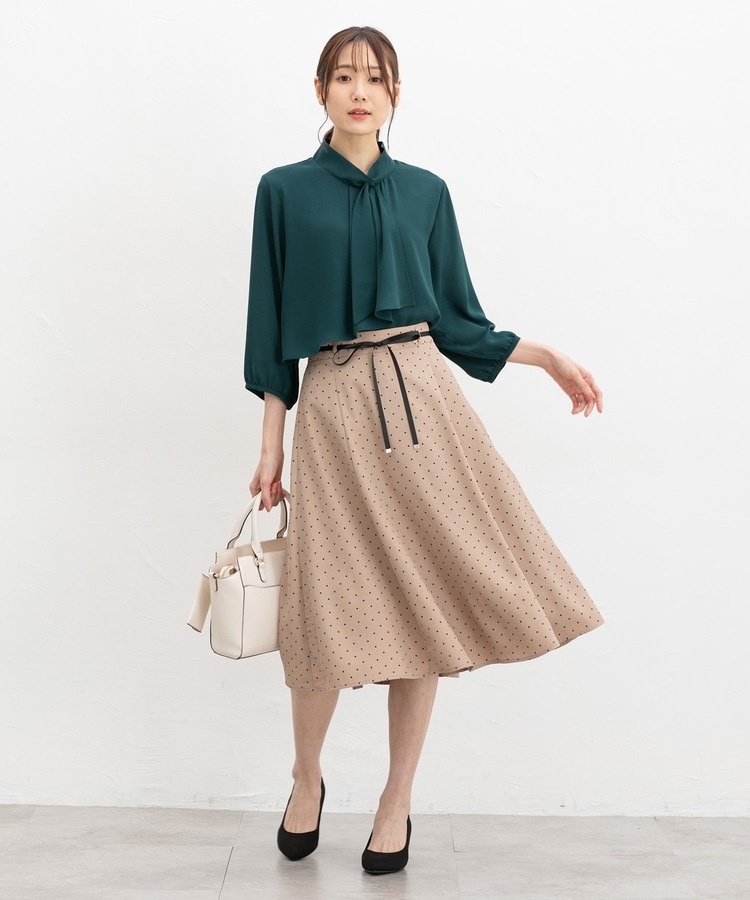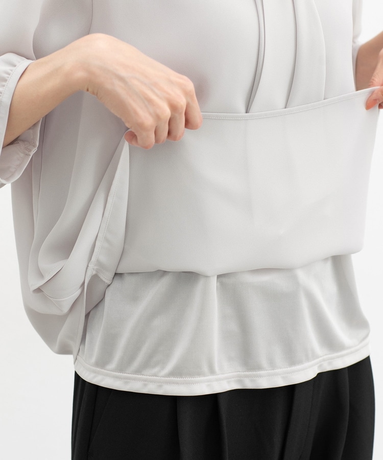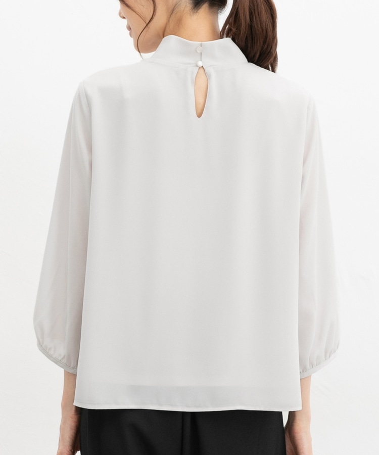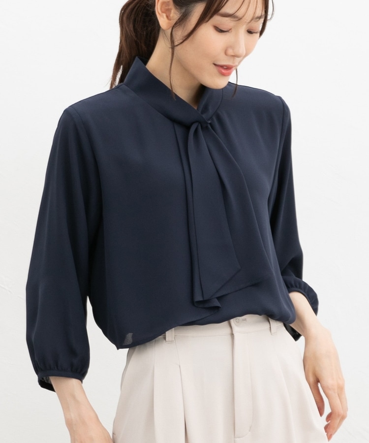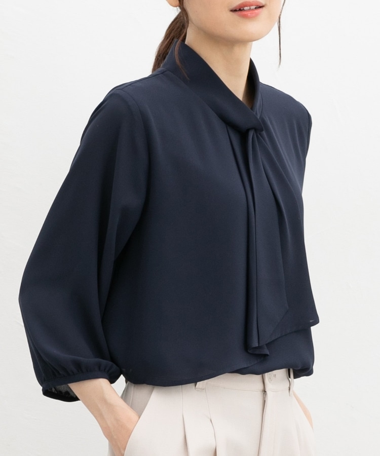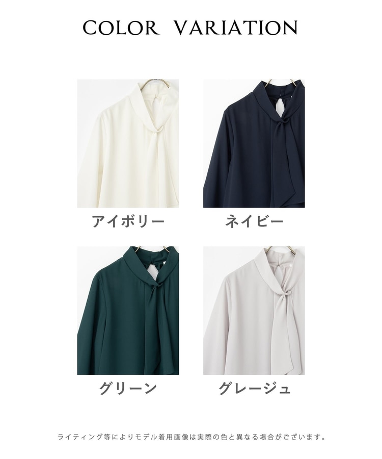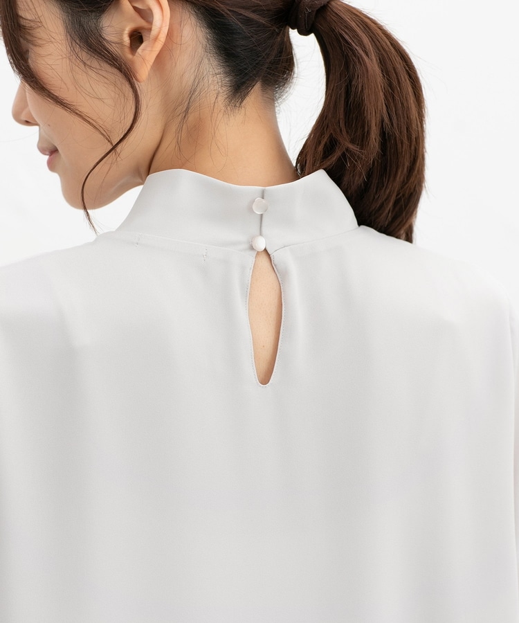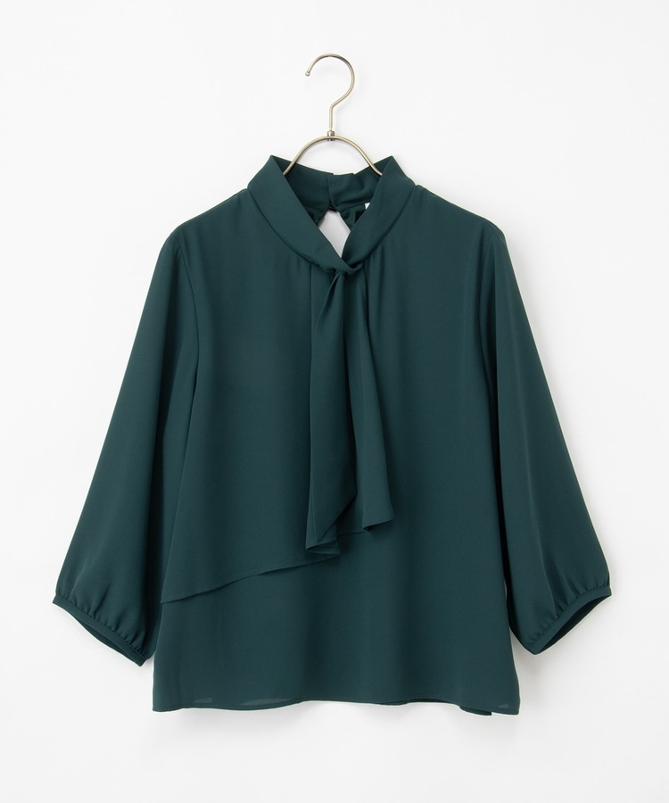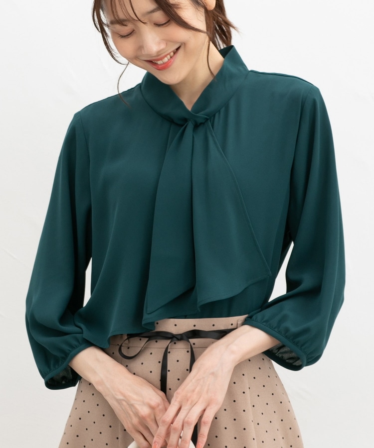 リボンを結ぶ必要のない、流れるようなドレープのボウタイとアシンメトリーなケープデザインが顔回りをさりげなく華やかに演出。