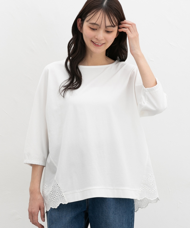 バックからサイドにかけてナチュラルなコットンレースで切り替えた大人可愛いデザイン。