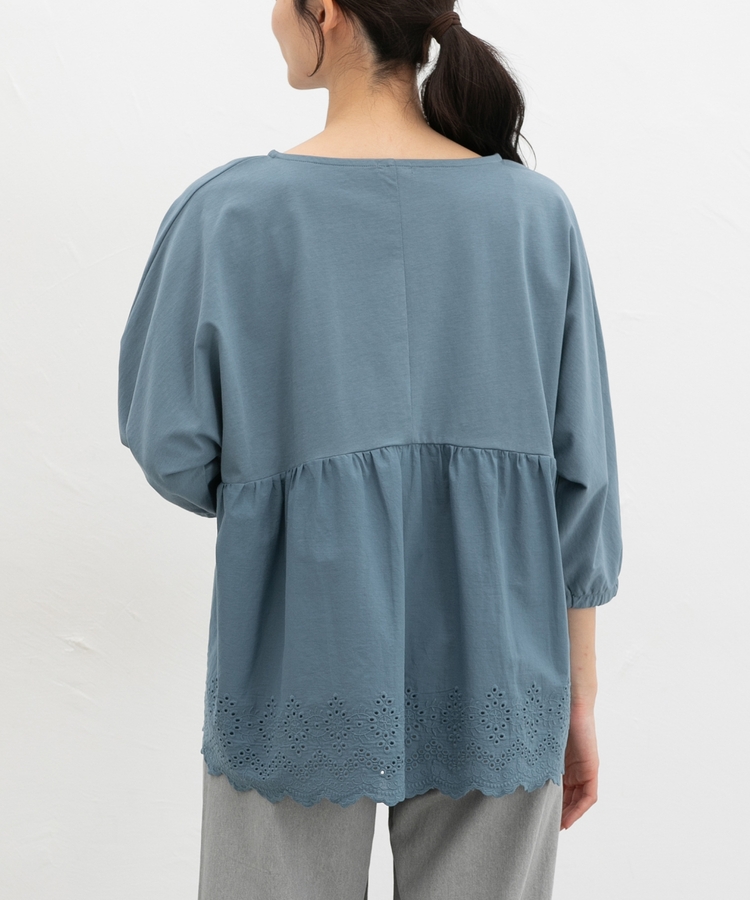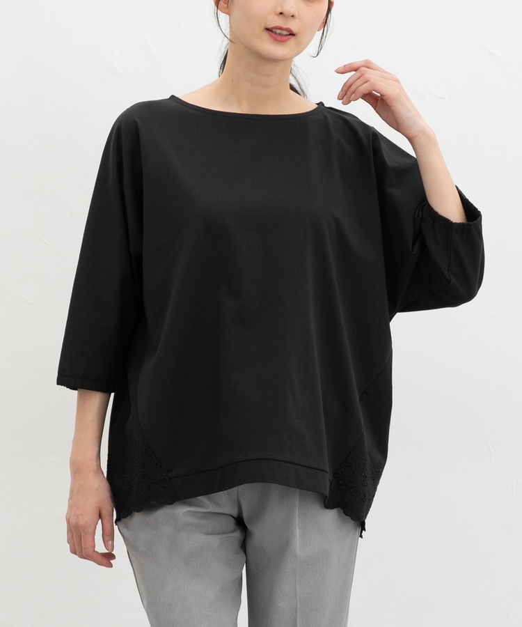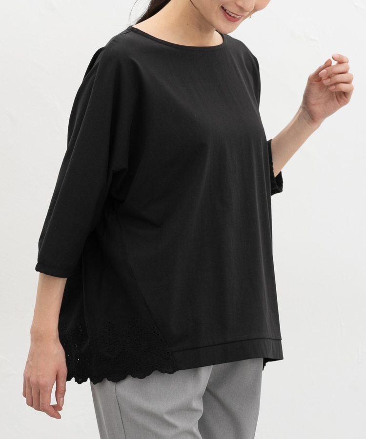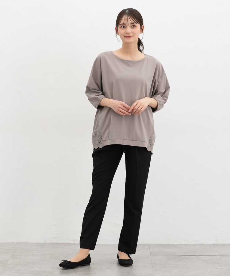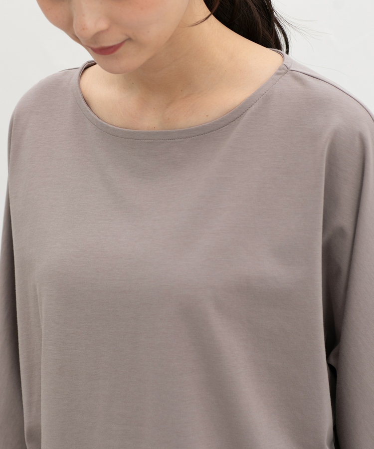 ゆったりした幅とヒップまで隠れる丈感、ドルマン袖でストレスフリーな着心地。