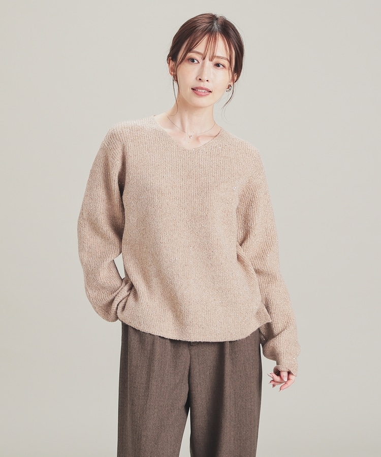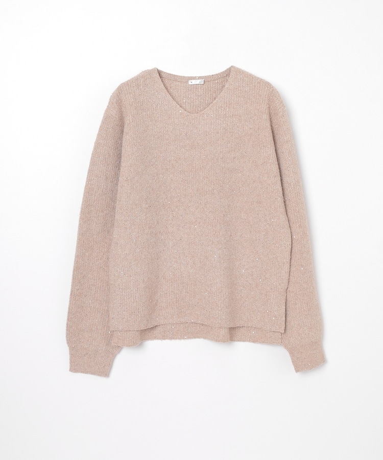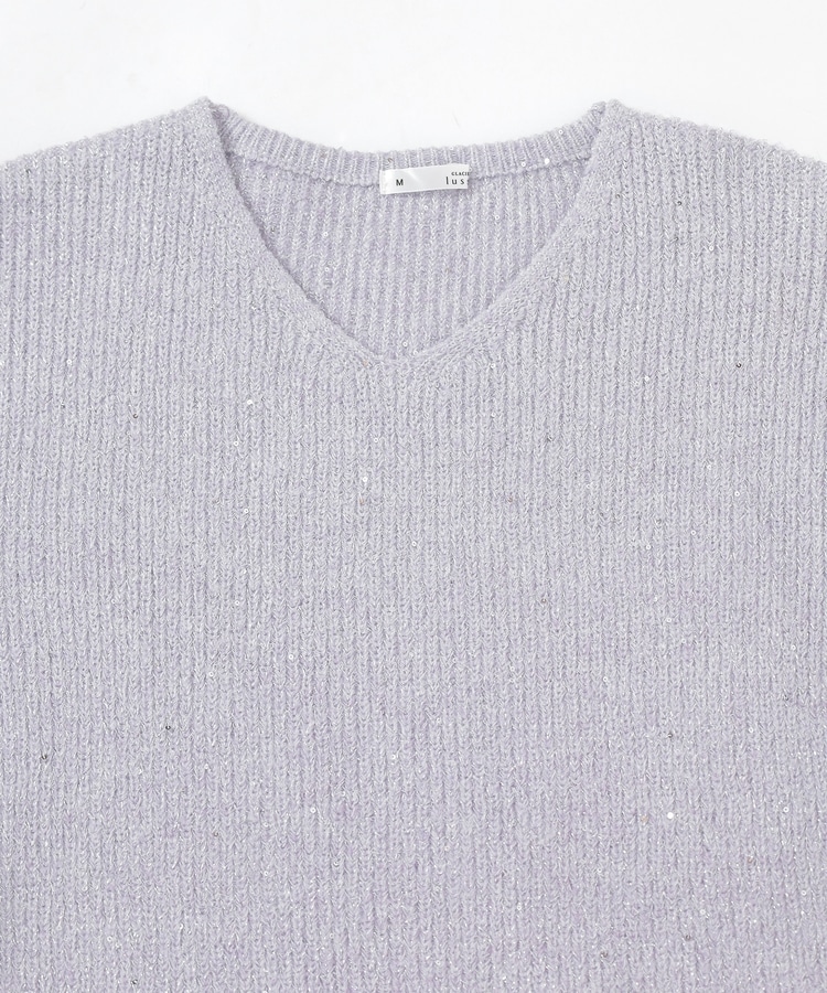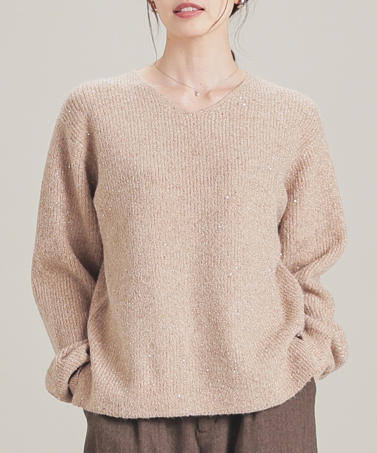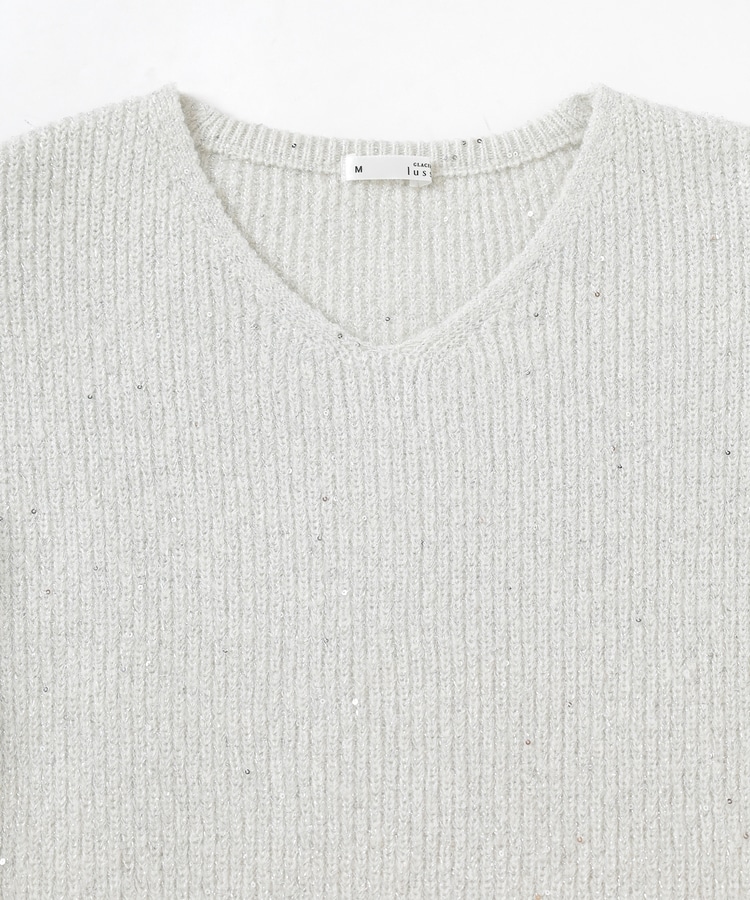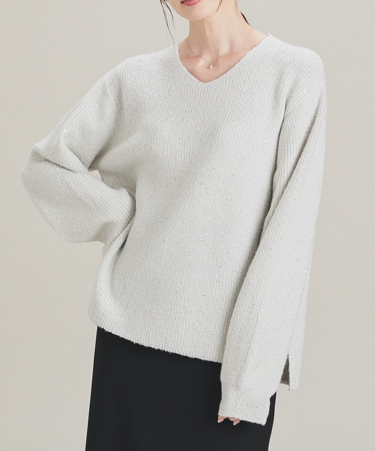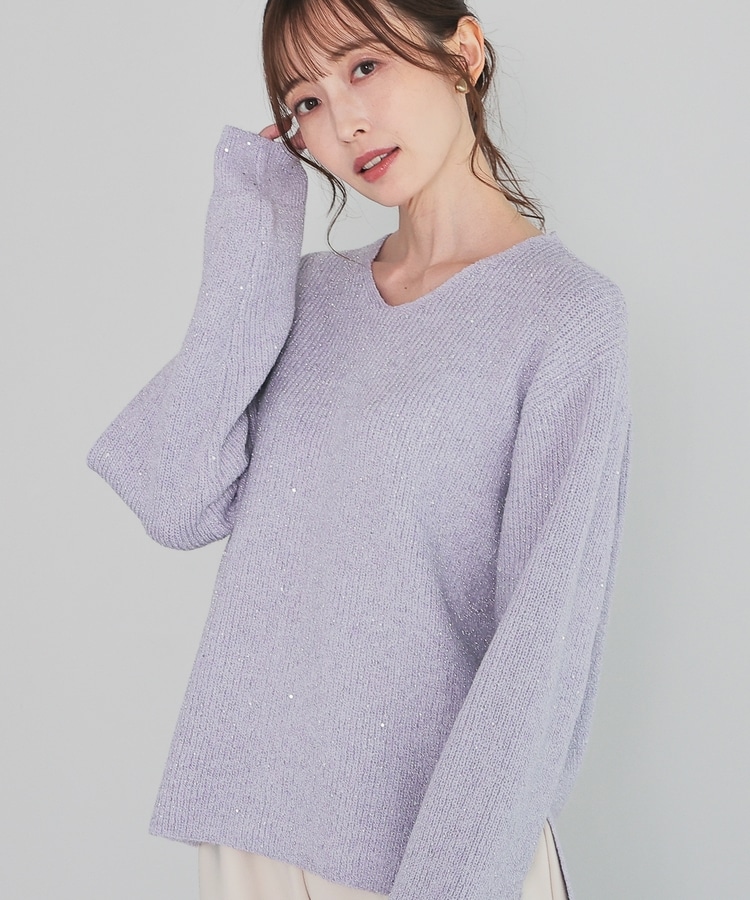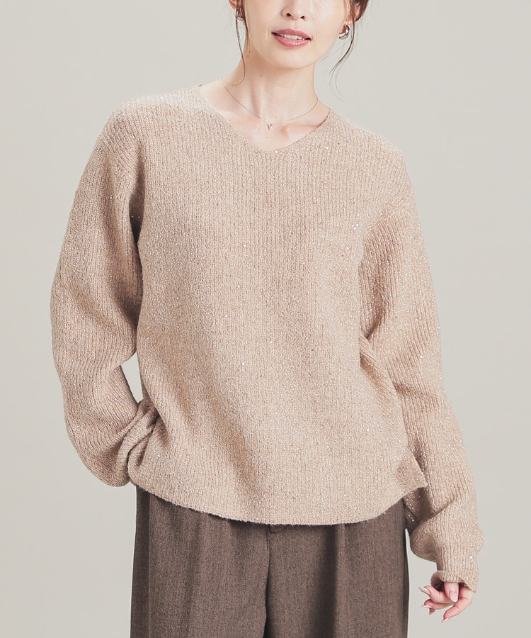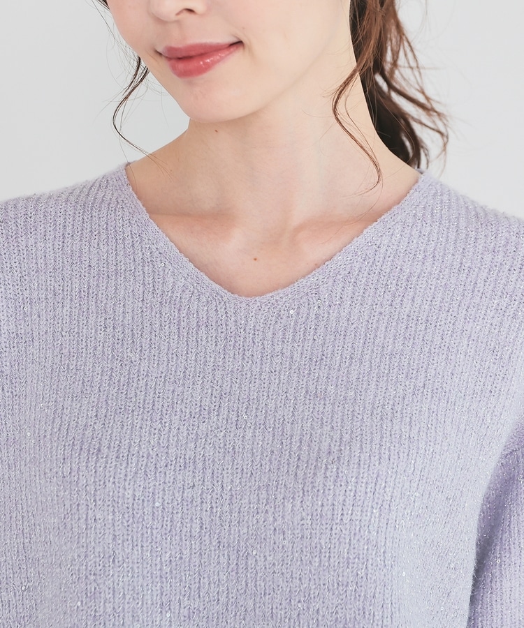 顔周りをすっきりみせるシンプルなVネックデザインに、トレンドのスパンコール付きラメ糸で華やかさをプラス。
