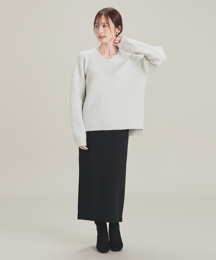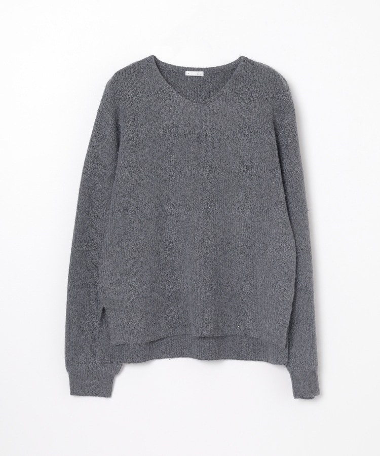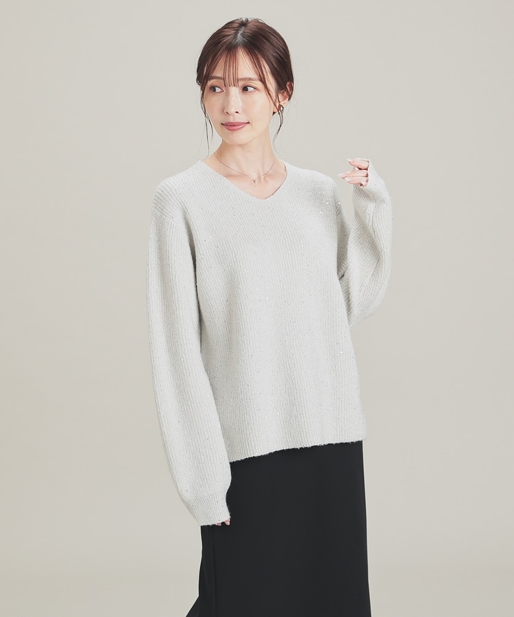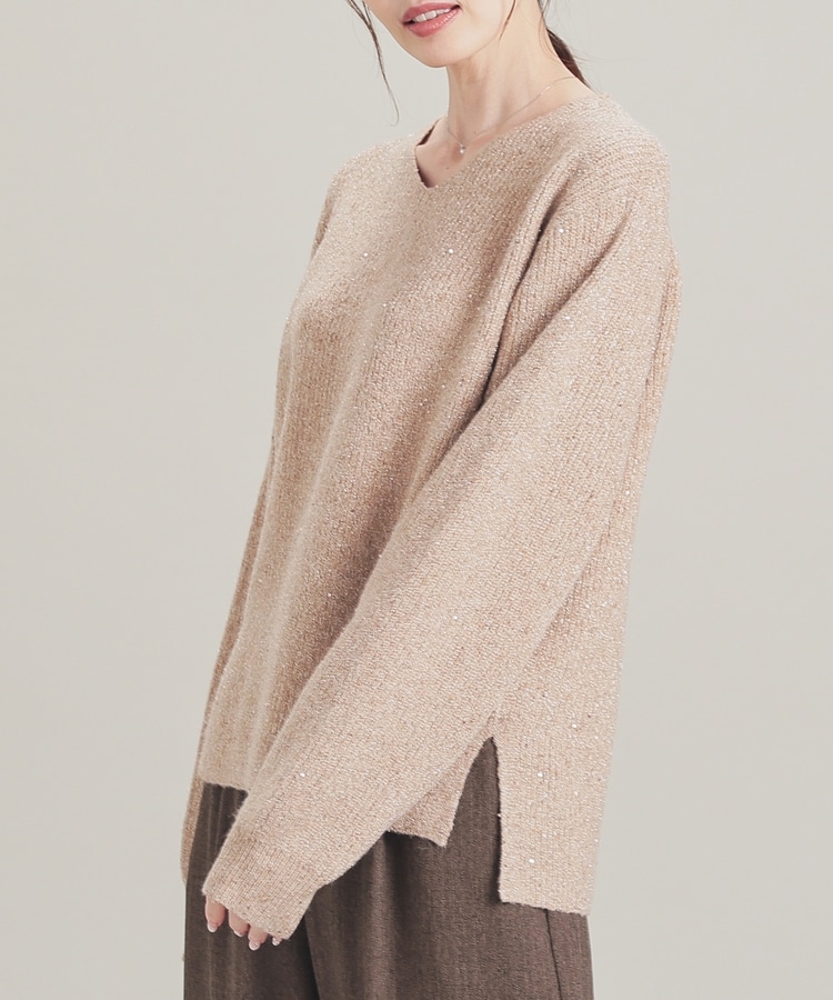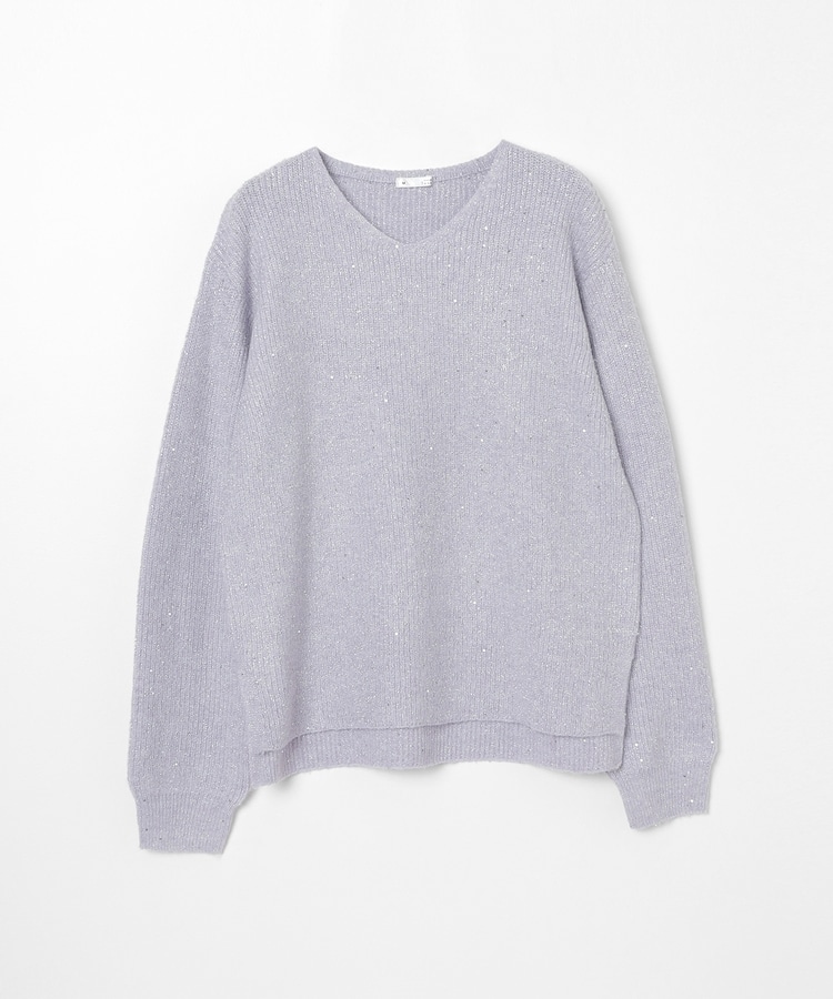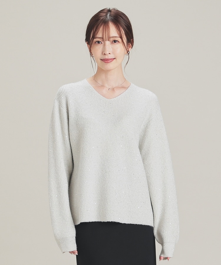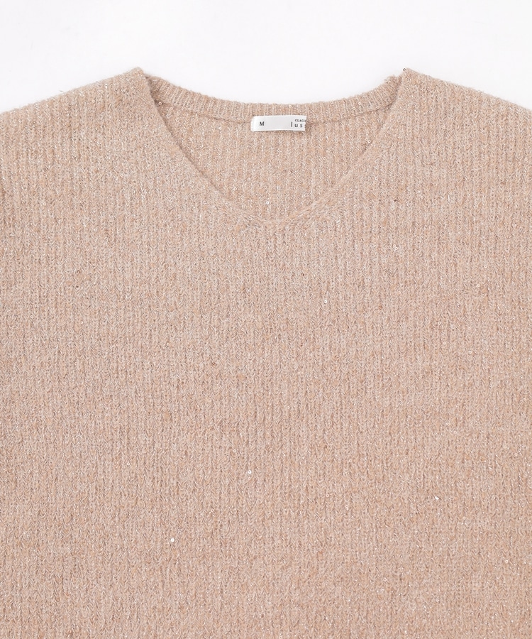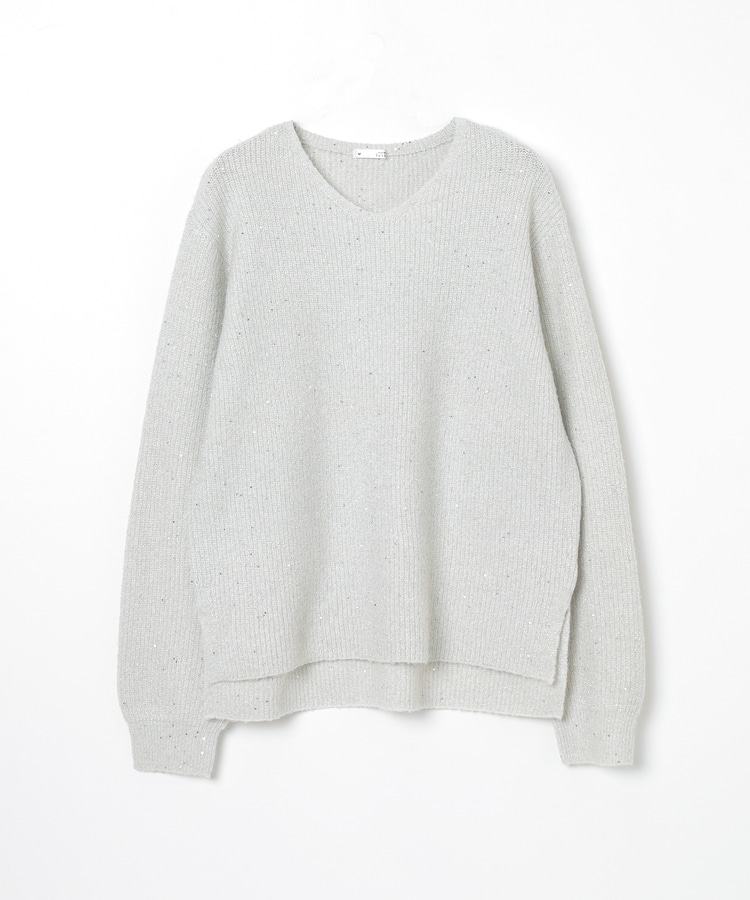 顔周りをすっきりみせるシンプルなVネックデザインに、トレンドのスパンコール付きラメ糸で華やかさをプラス。