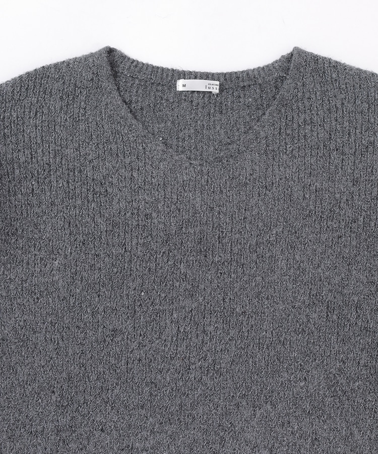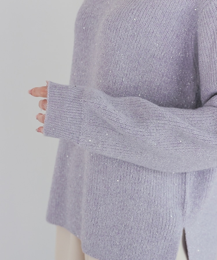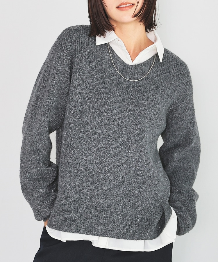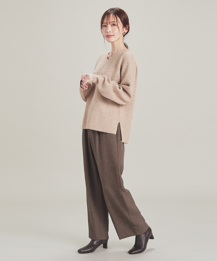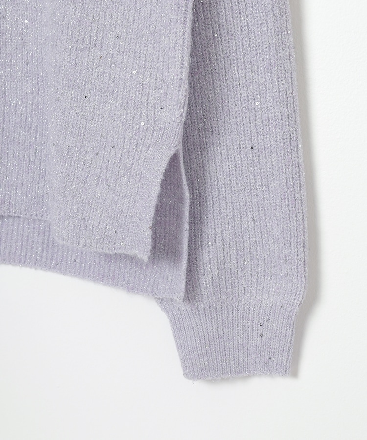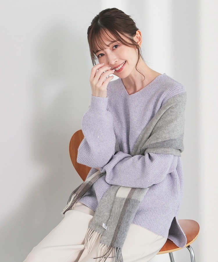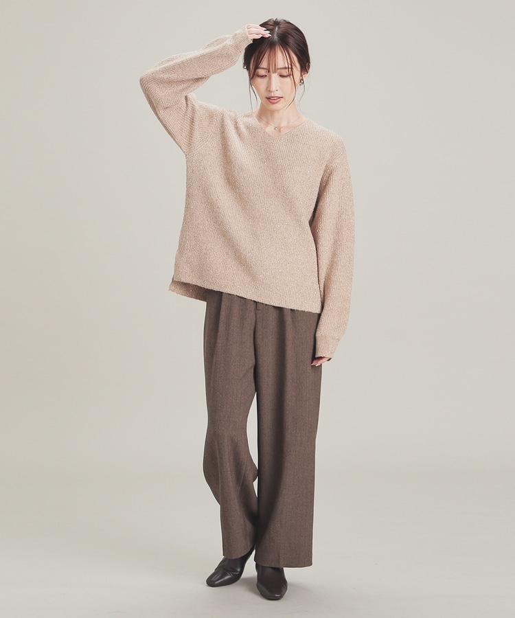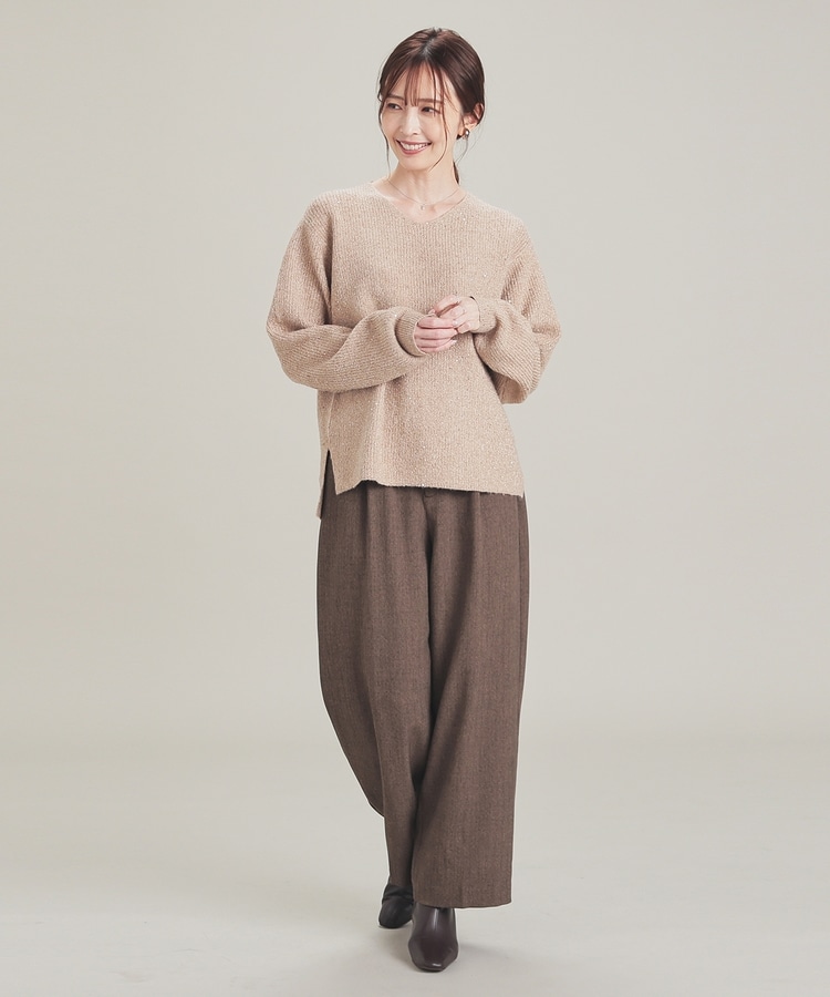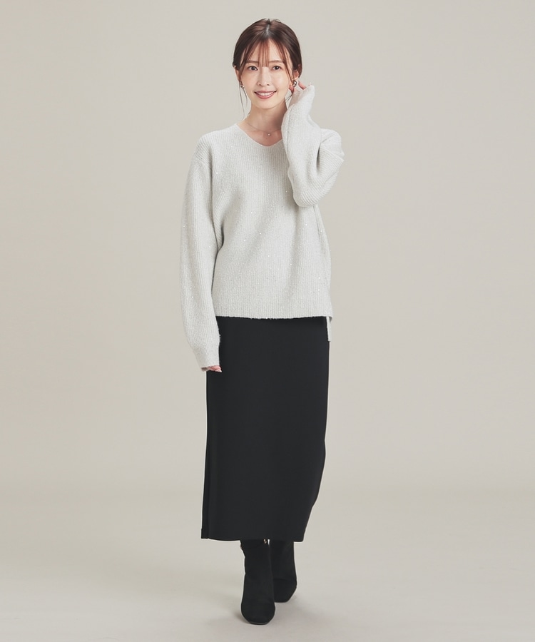 顔周りをすっきりみせるシンプルなVネックデザインに、トレンドのスパンコール付きラメ糸で華やかさをプラス。