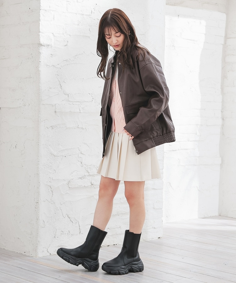ハードな印象の素材に、あえてプリーツやチュールスカートなどで甘さをプラスするのがおすすめ。
