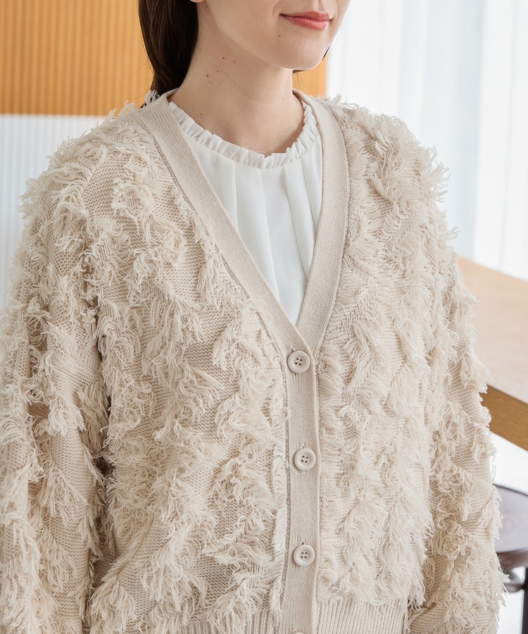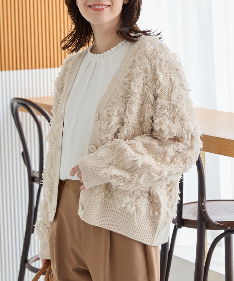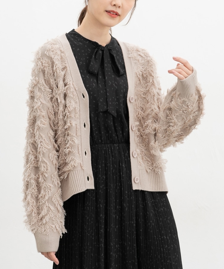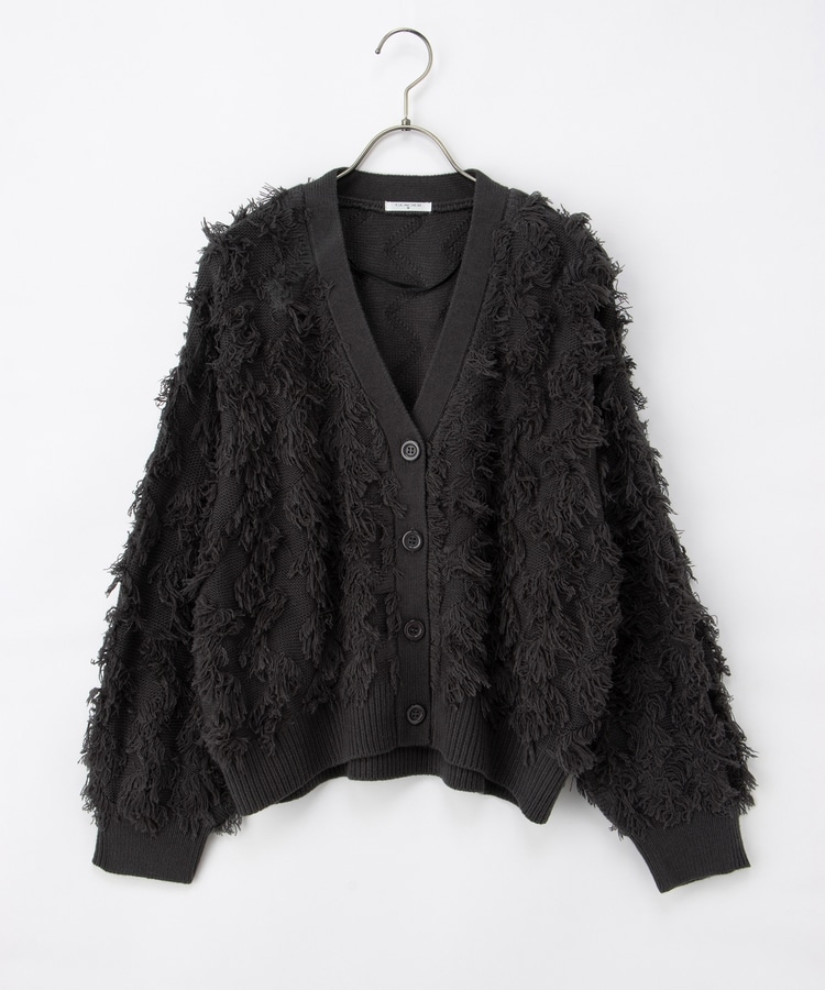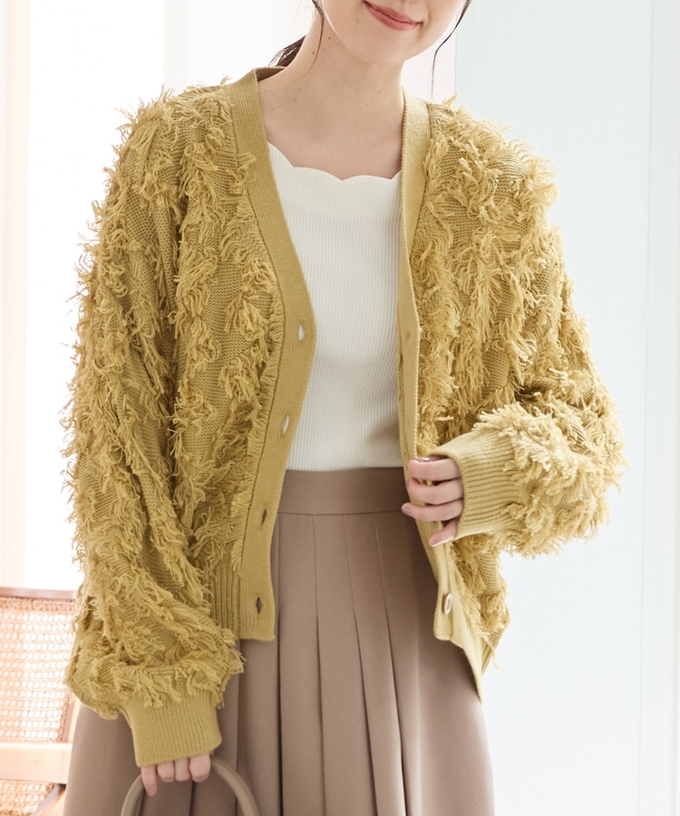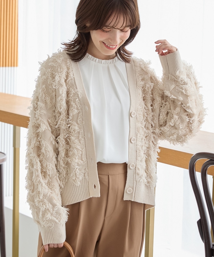 立体感のある柔らかな毛足のフリンジ編ニット素材。