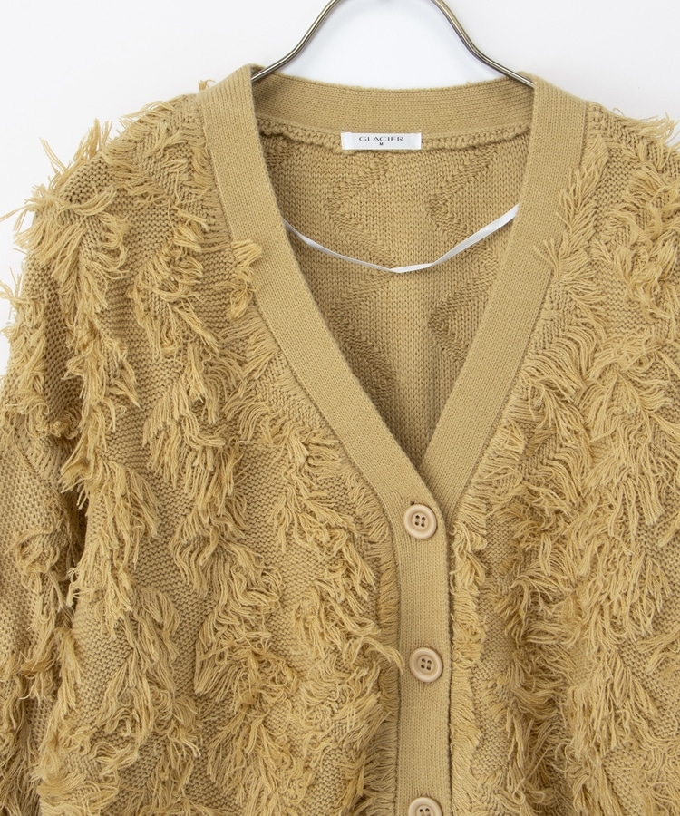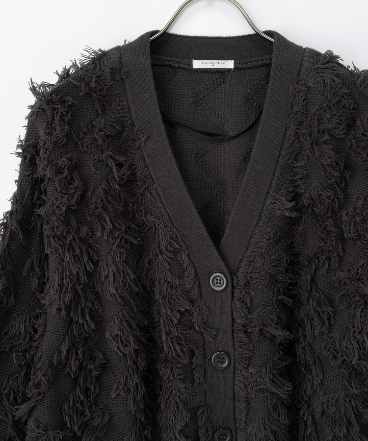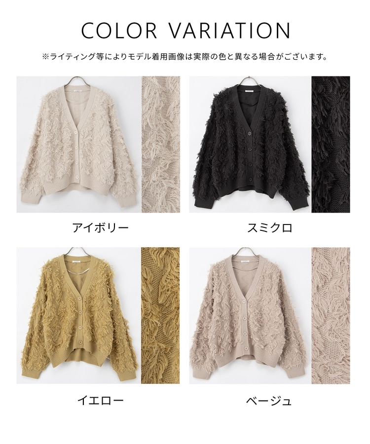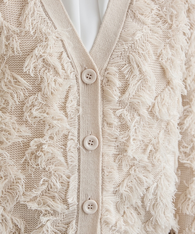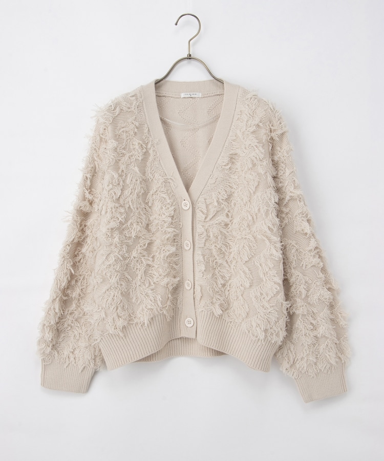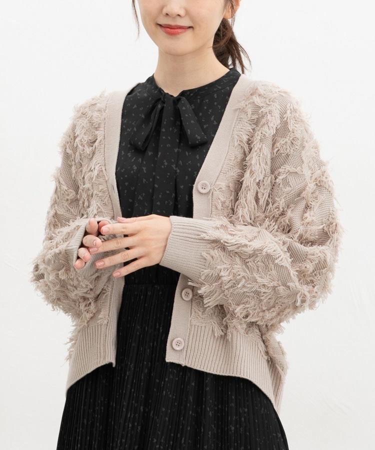 立体感のある柔らかな毛足のフリンジ編ニット素材。