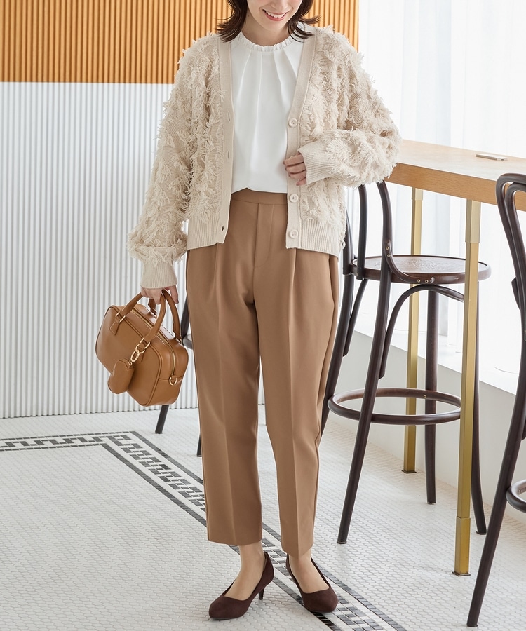 ナロースカートのなどきれいめなボトムスと合わせた、フェミニンスタイルもおすすめ。