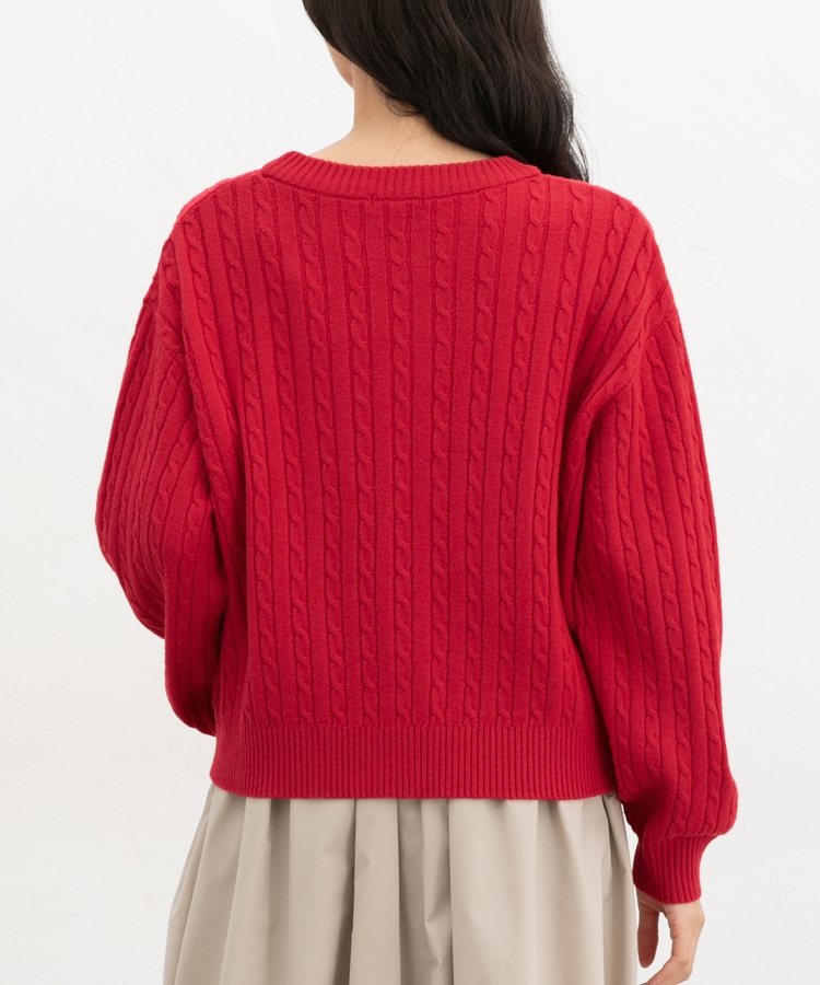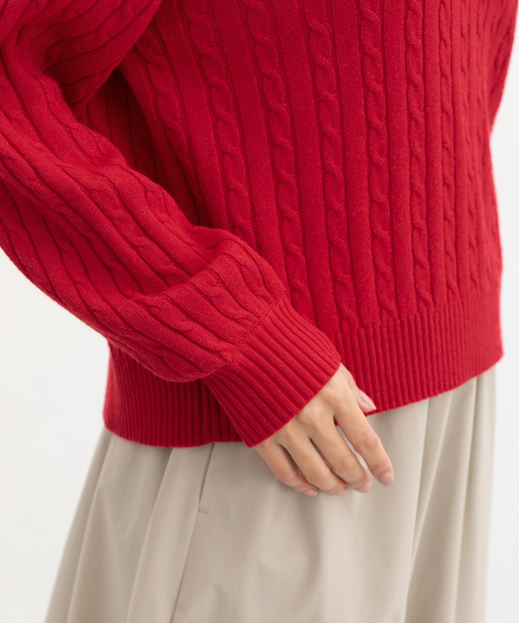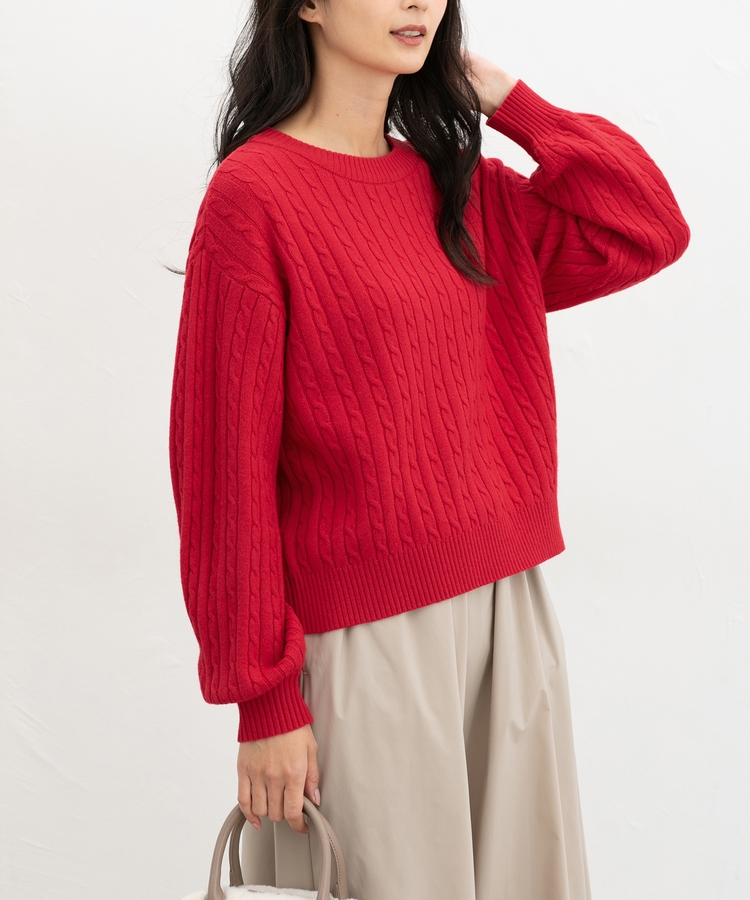 シーズンムードたっぷりな、ケーブルの編み柄が大人可愛いデザイン。