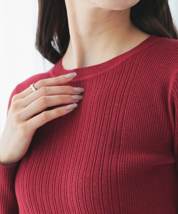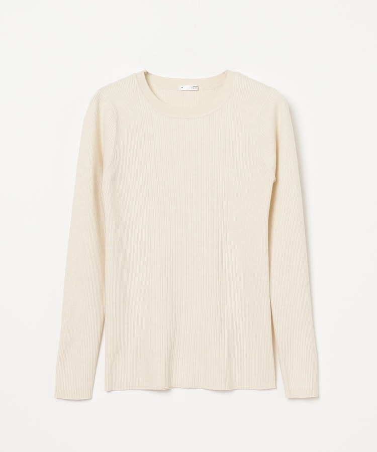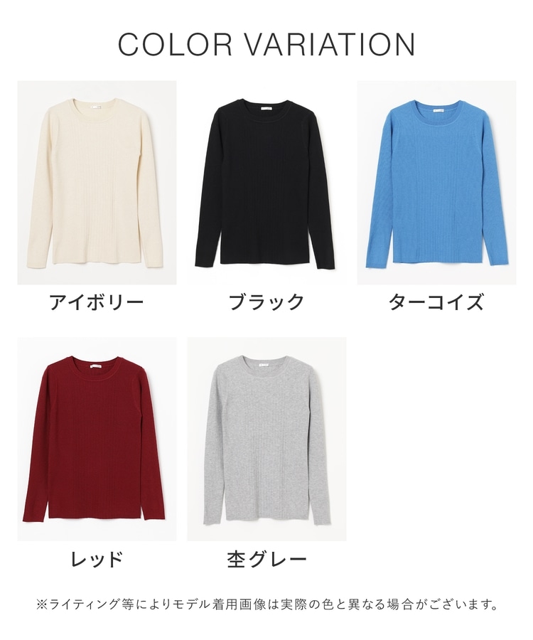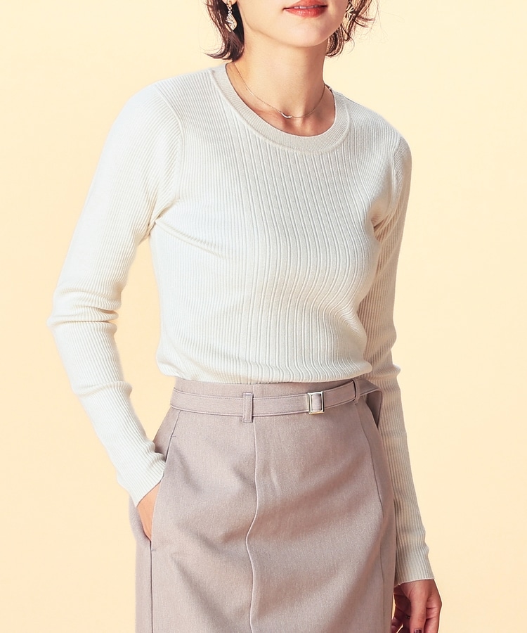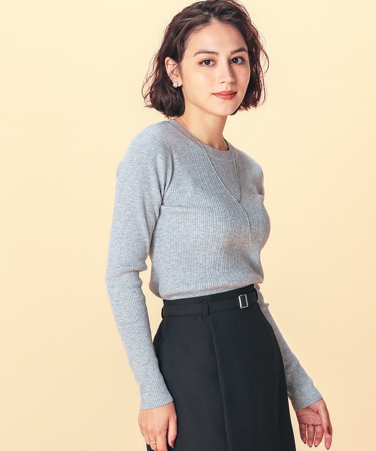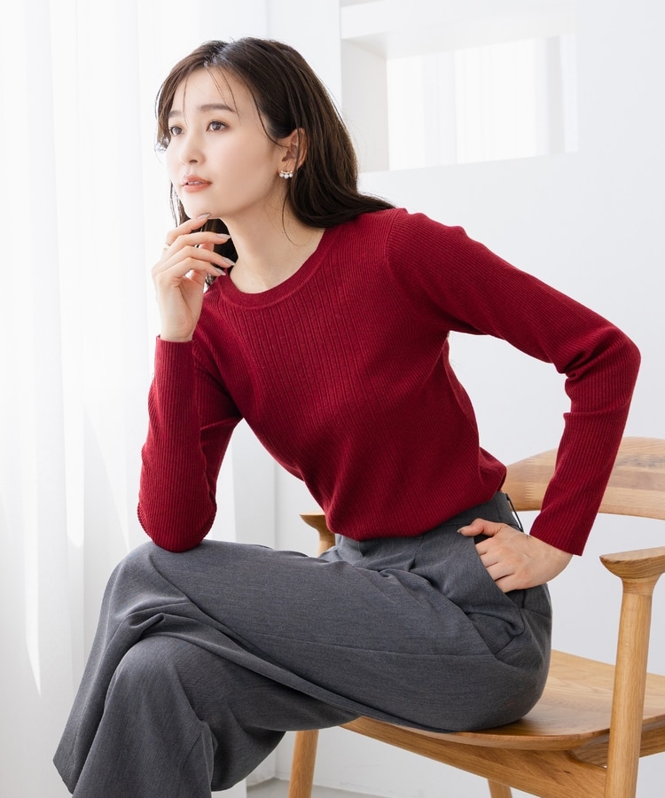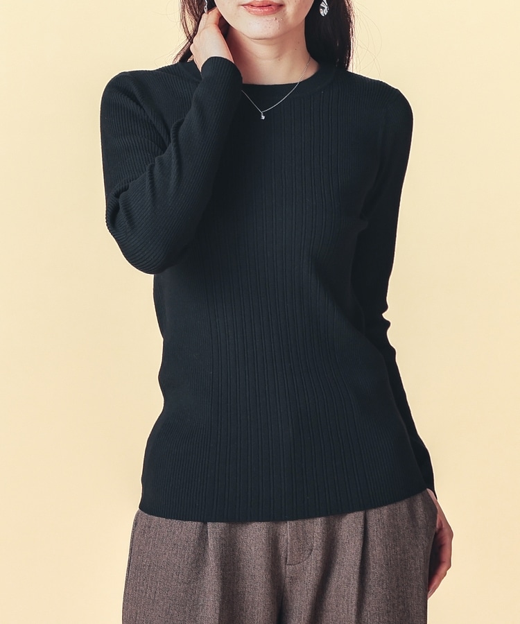 シンプルなシルエットに、リブの間隔を変化させた変則編みでアクセントをプラスした、細見え効果もあるデザイン。