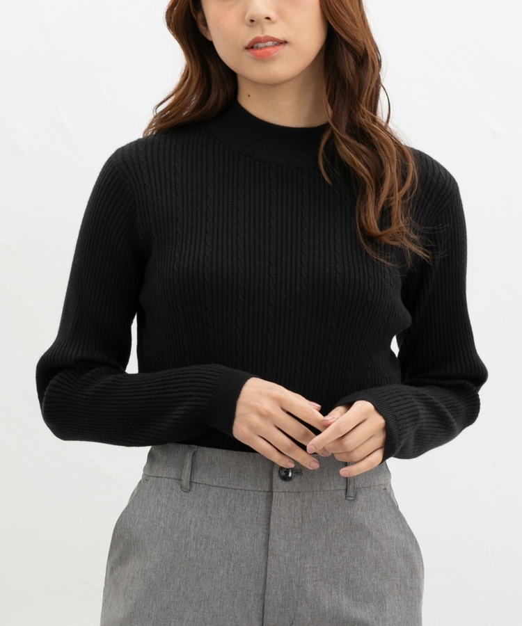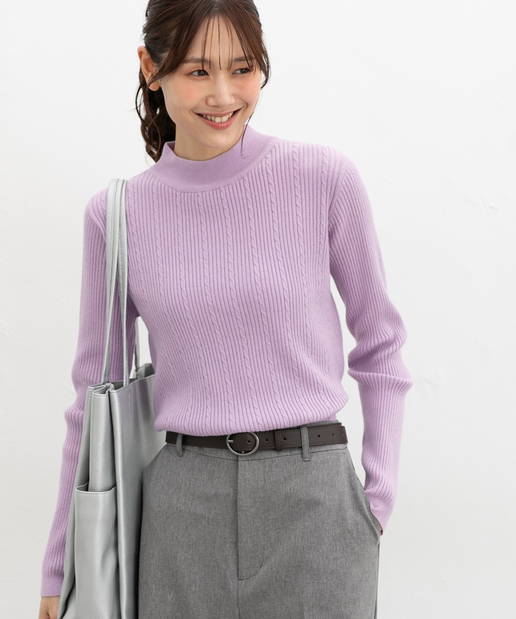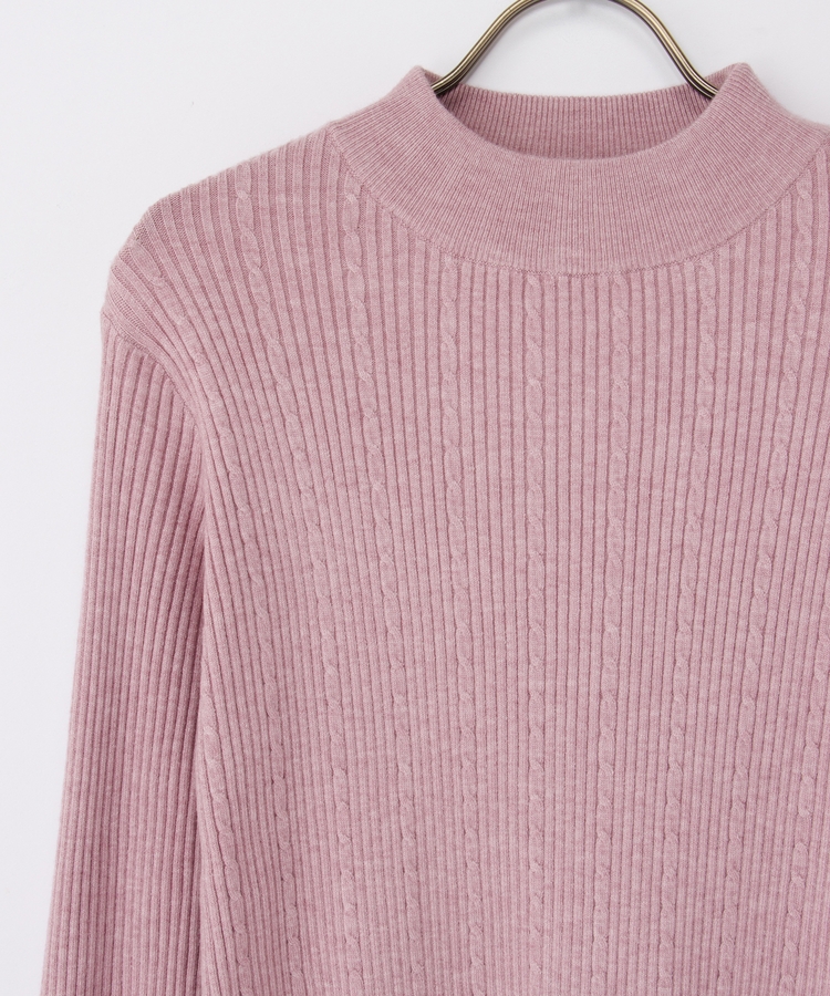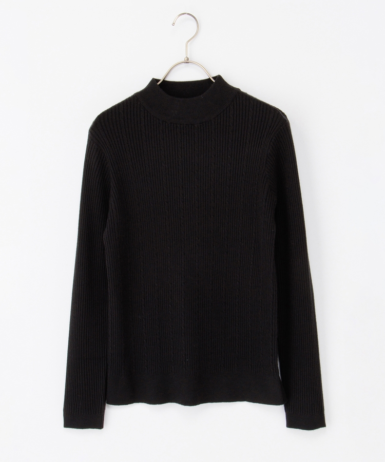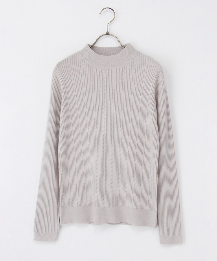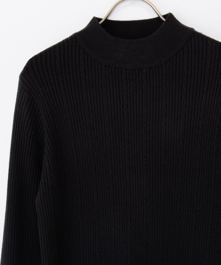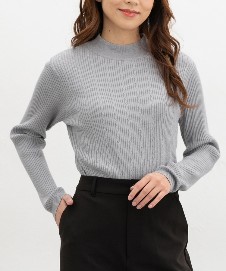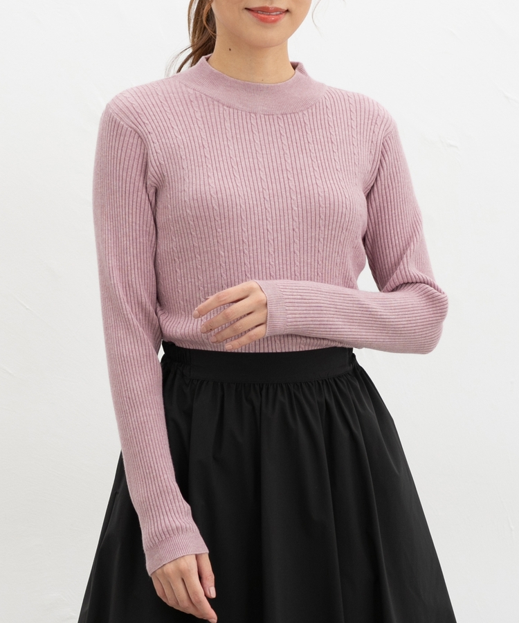 首元までカバーしてあったかなハイネックで、縦目のリブ+細ケーブルの編み柄がお洒落なデザイン。