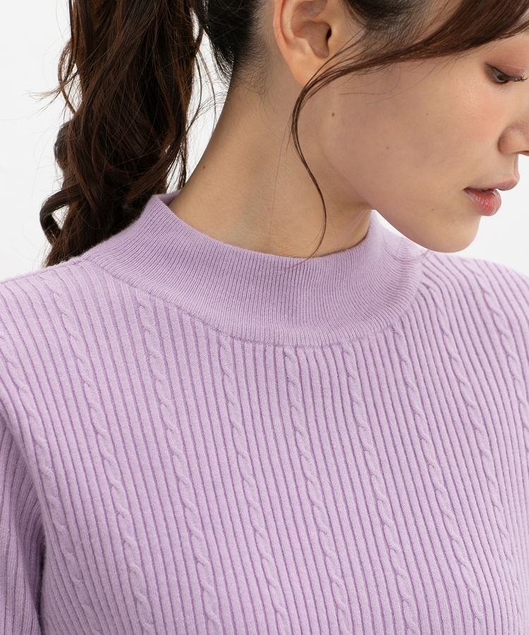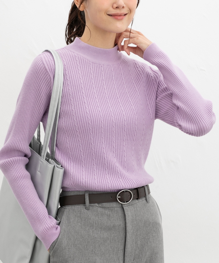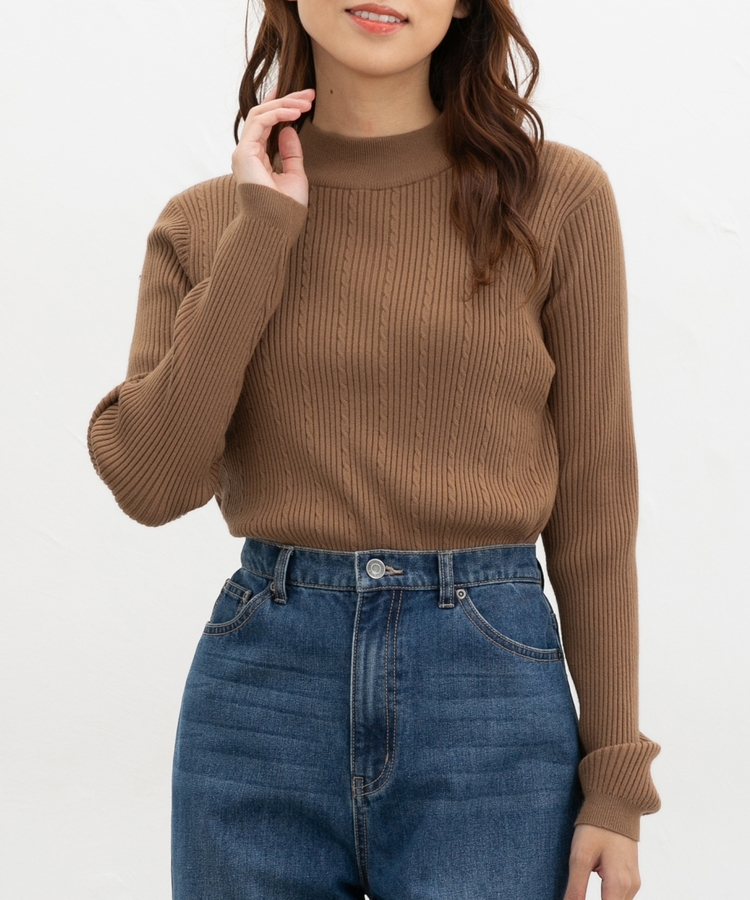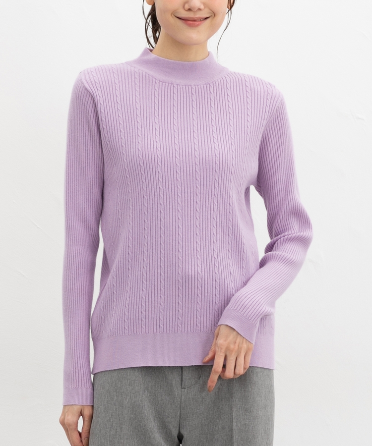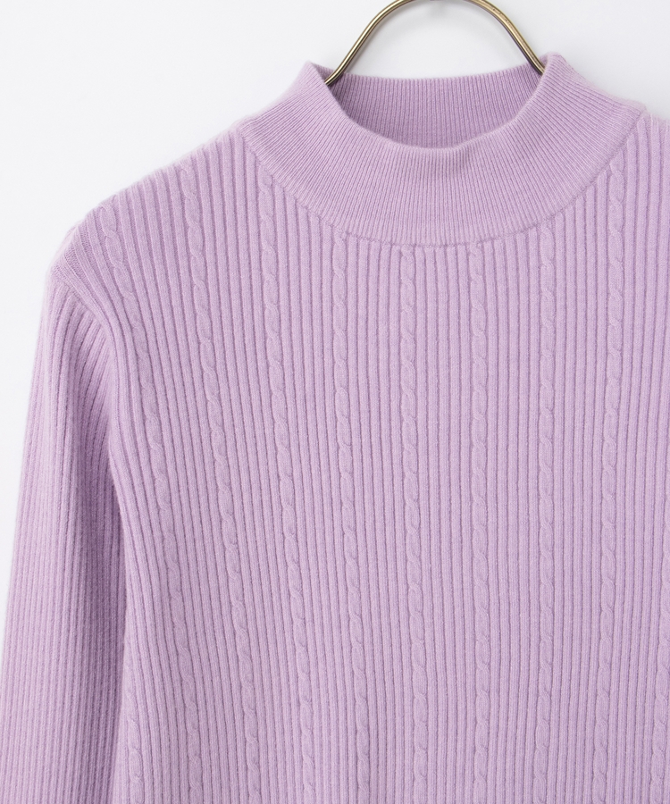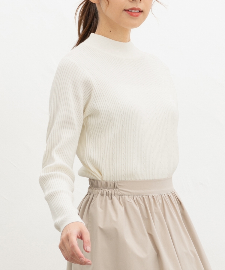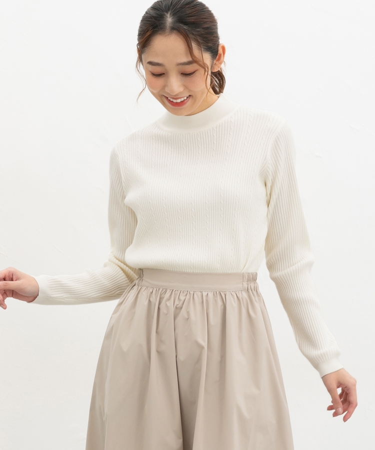 首元までカバーしてあったかなハイネックで、縦目のリブ+細ケーブルの編み柄がお洒落なデザイン。