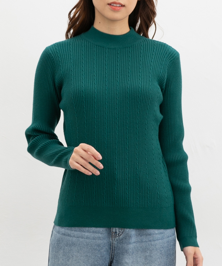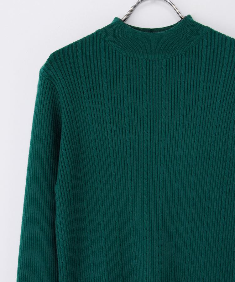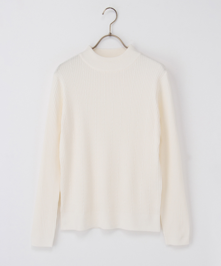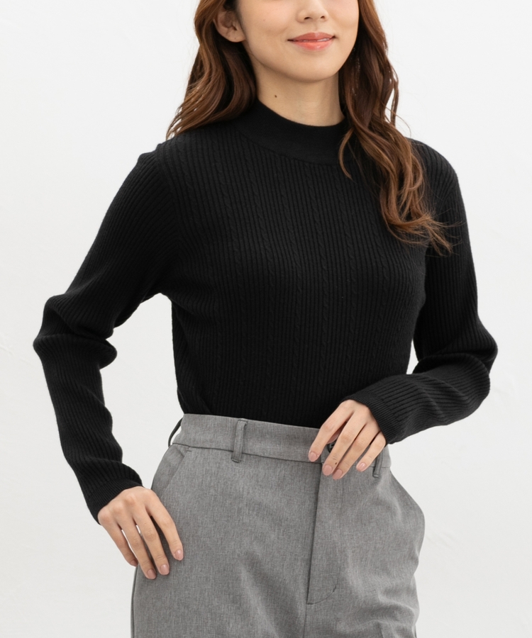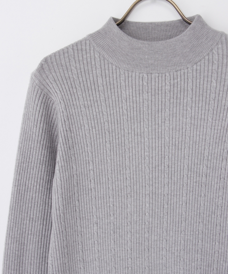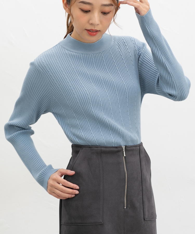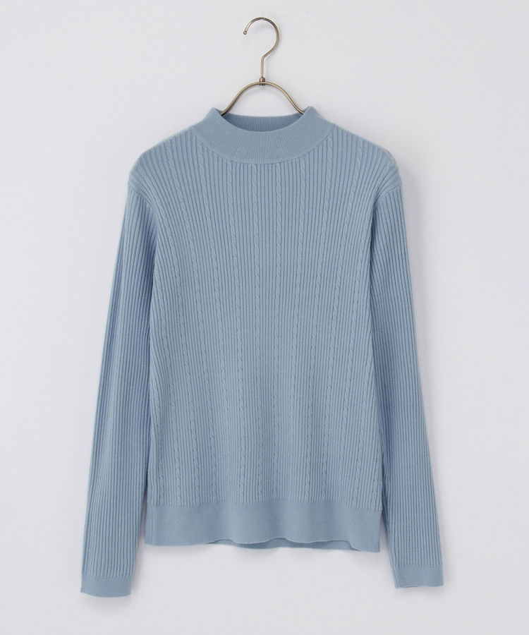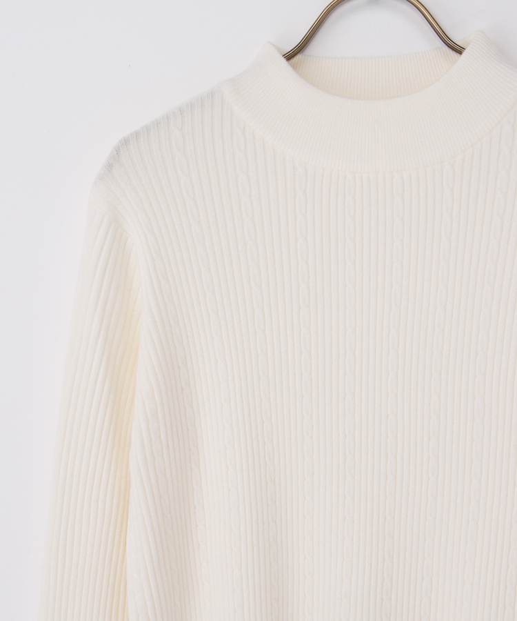 首元までカバーしてあったかなハイネックで、縦目のリブ+細ケーブルの編み柄がお洒落なデザイン。