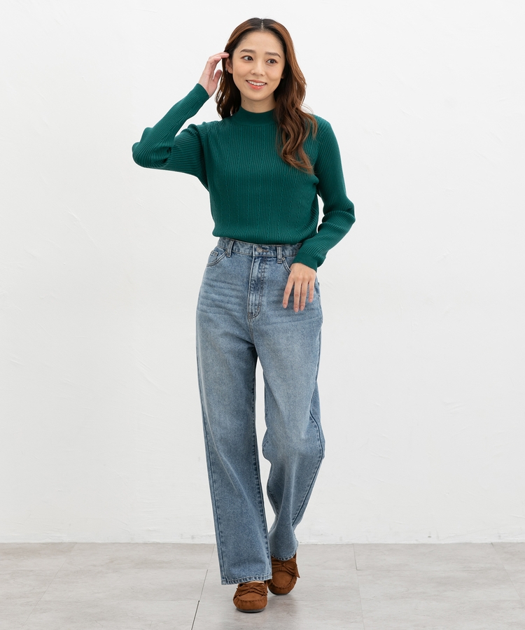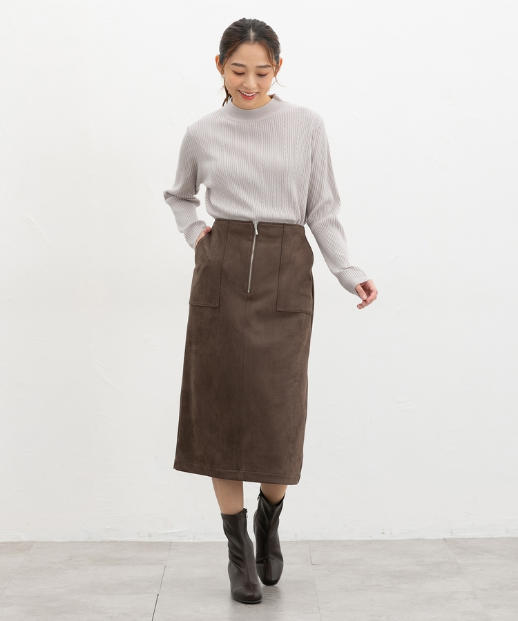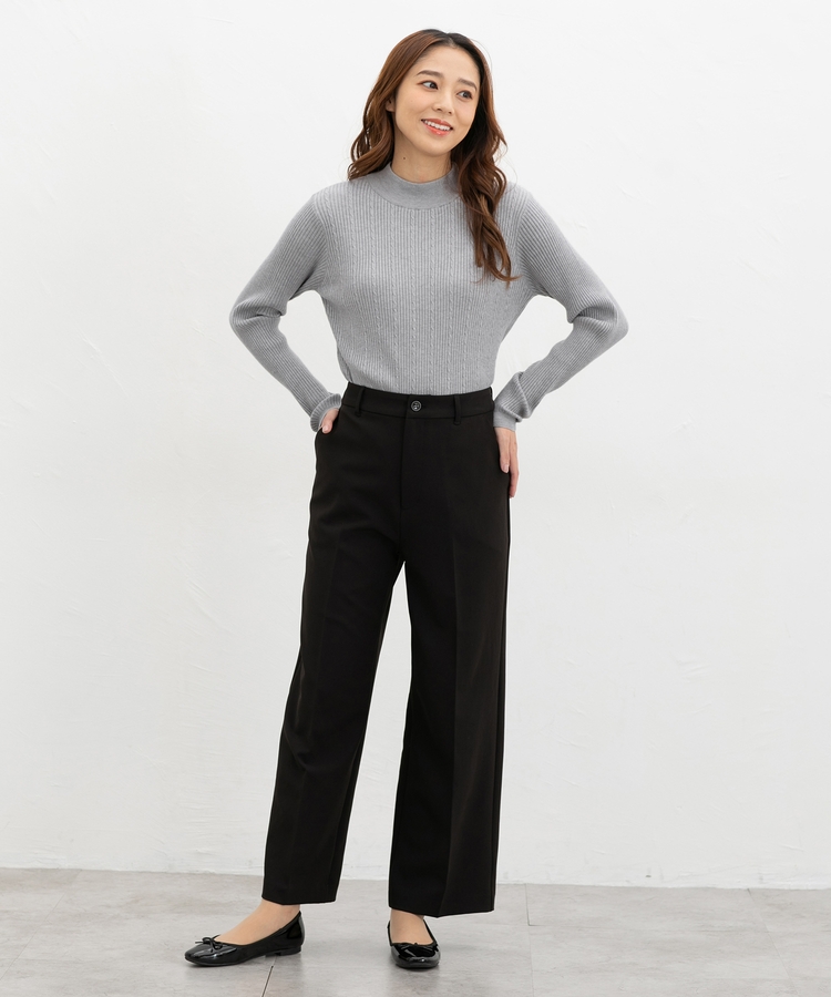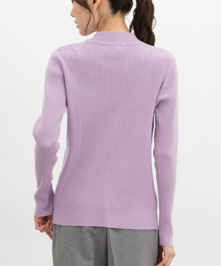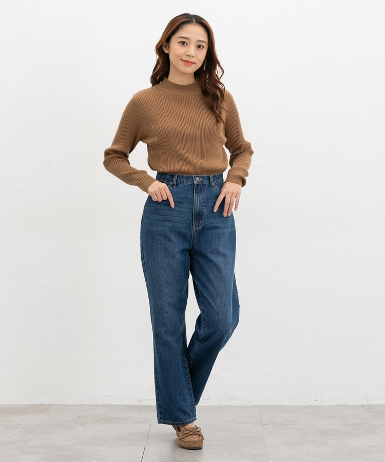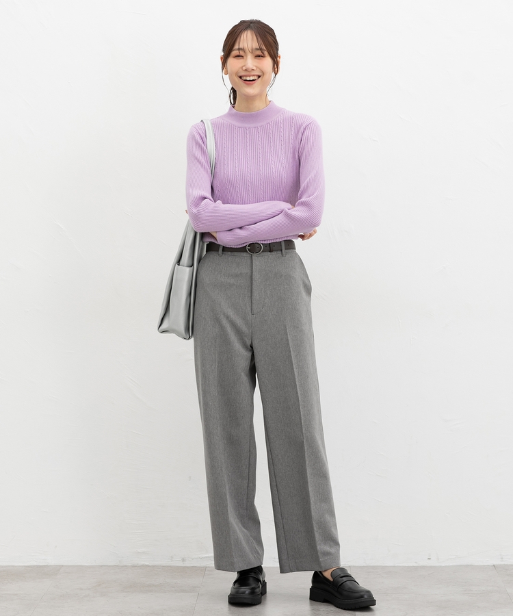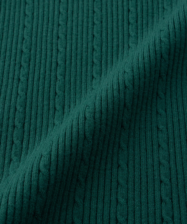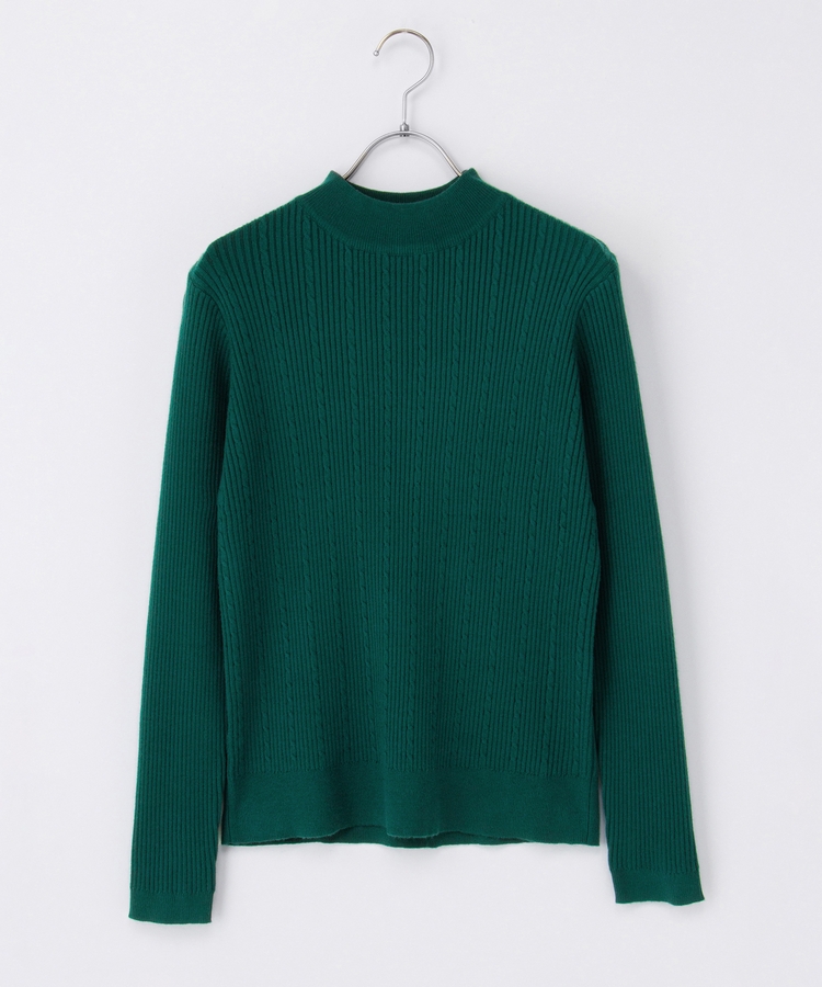 首元までカバーしてあったかなハイネックで、縦目のリブ+細ケーブルの編み柄がお洒落なデザイン。