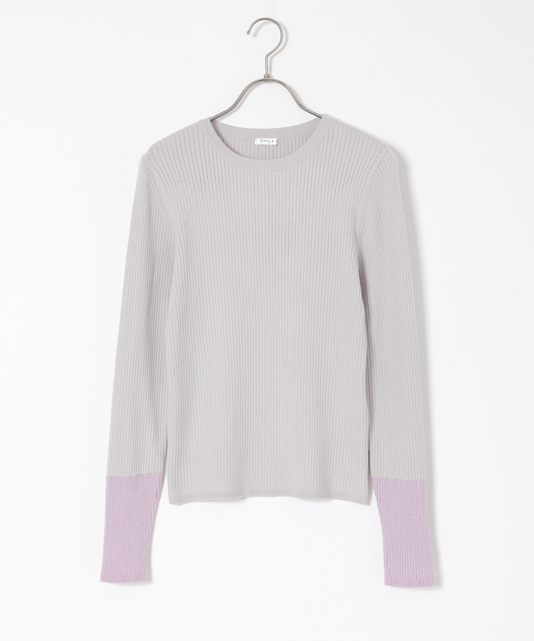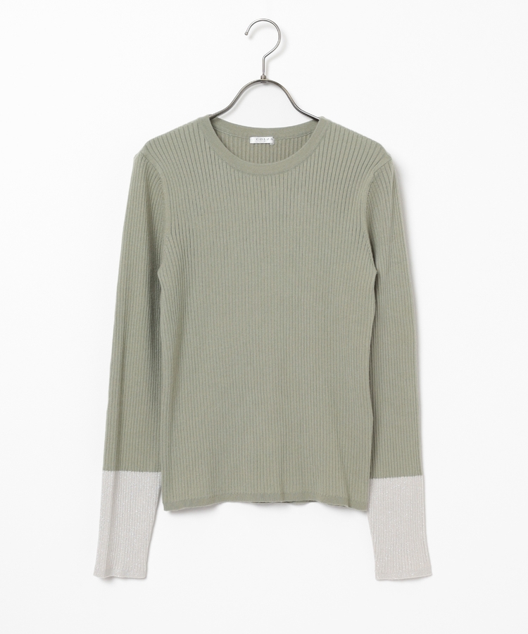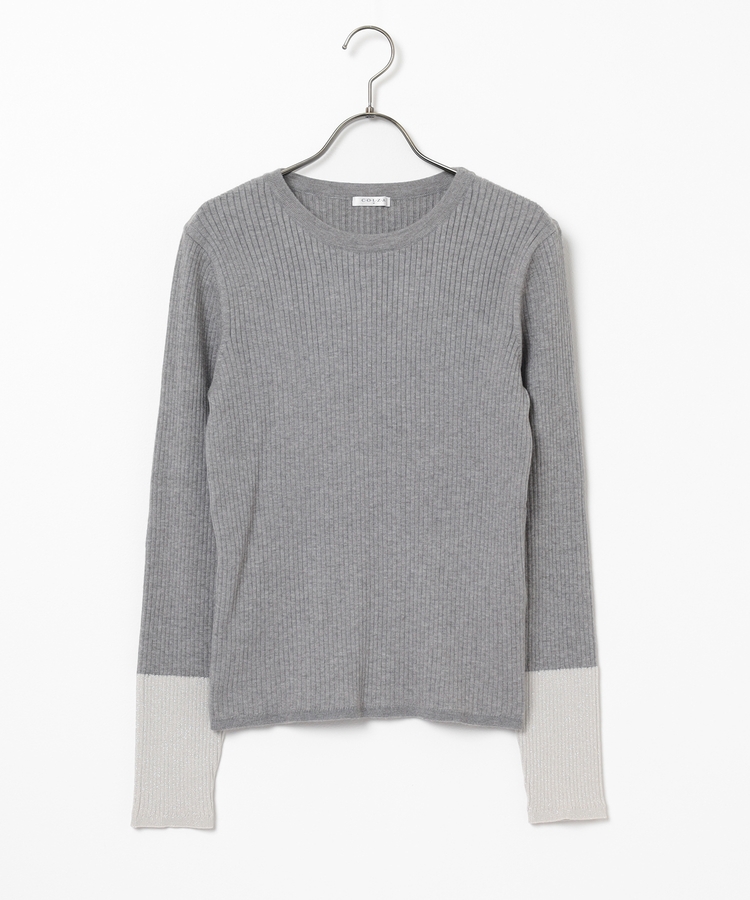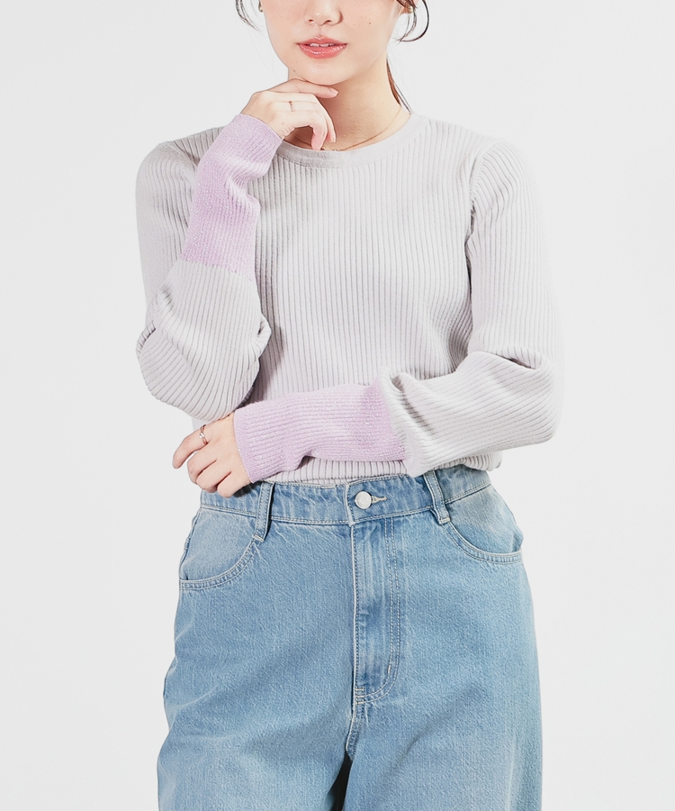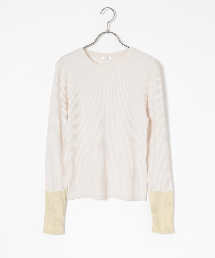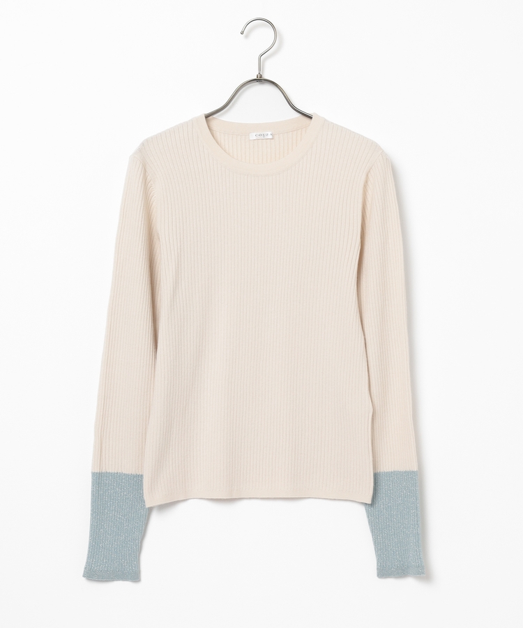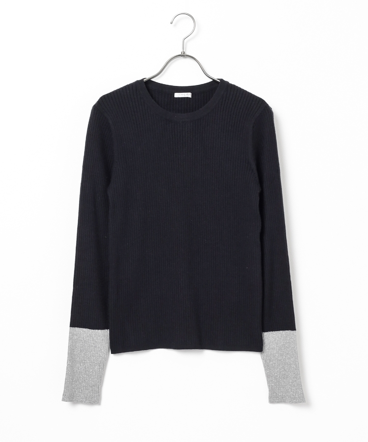 シンプルなクルーネックデザインに、袖口のラメ入り配色切り替えで華やかさをプラス。
