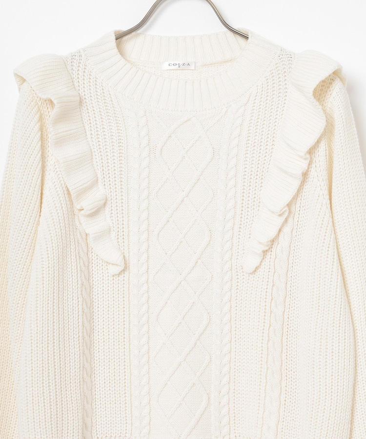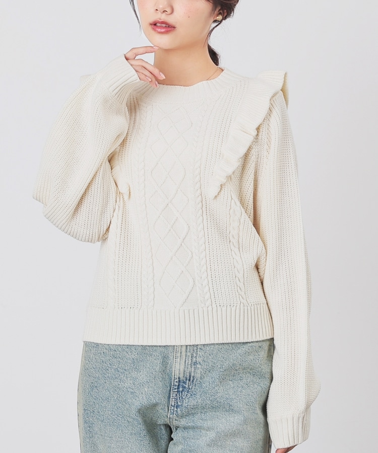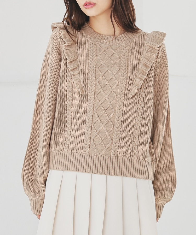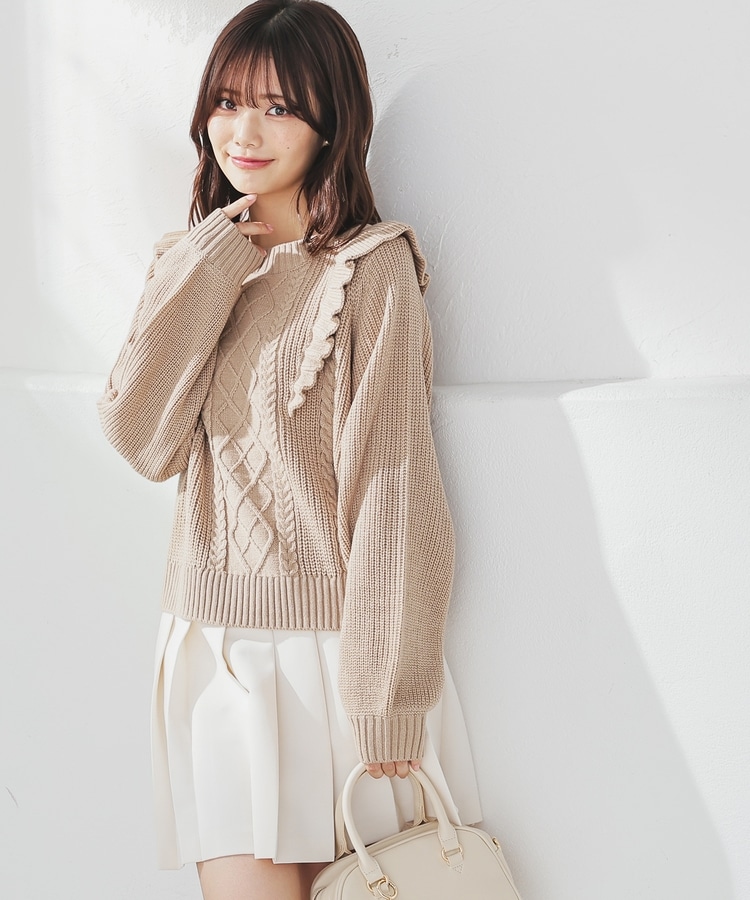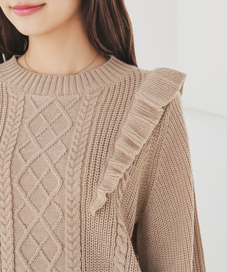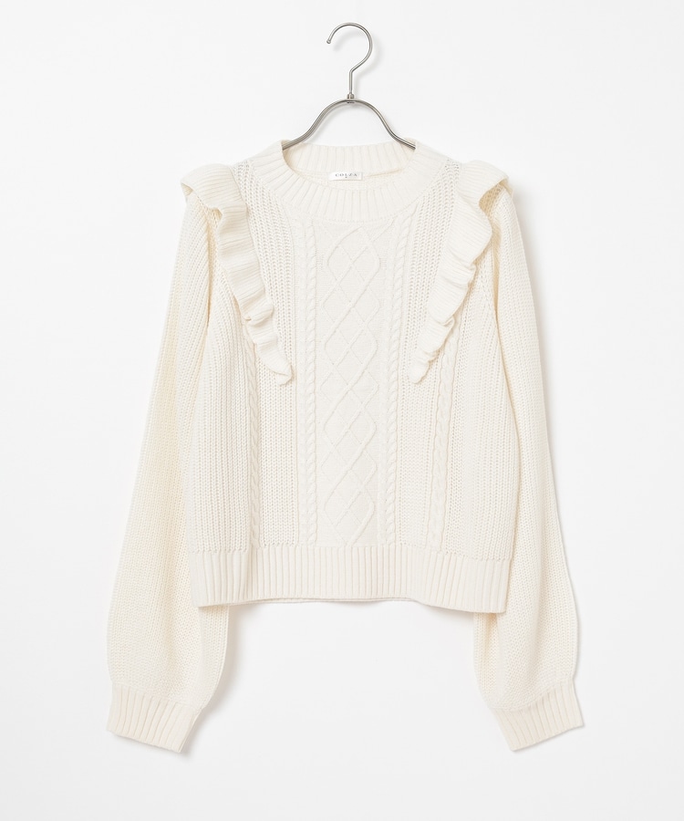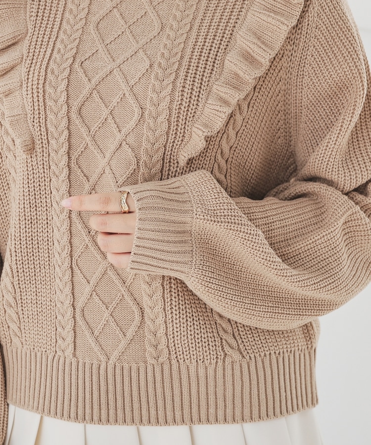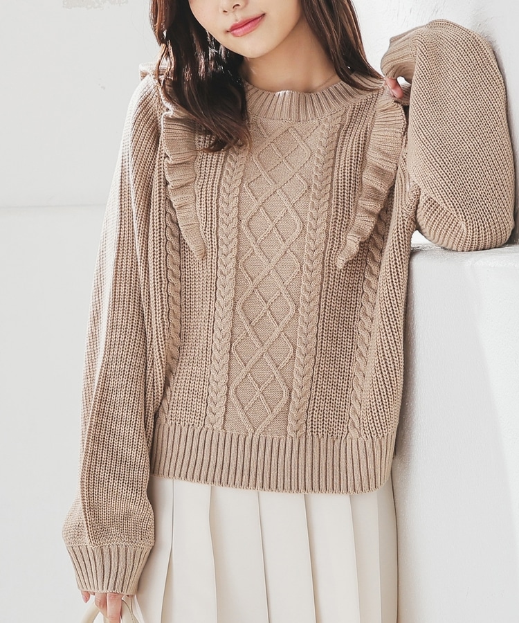 1枚で存在感のある、縦フリル×ケーブル編みのキュートなデザイン。