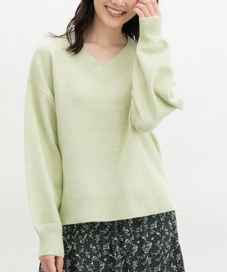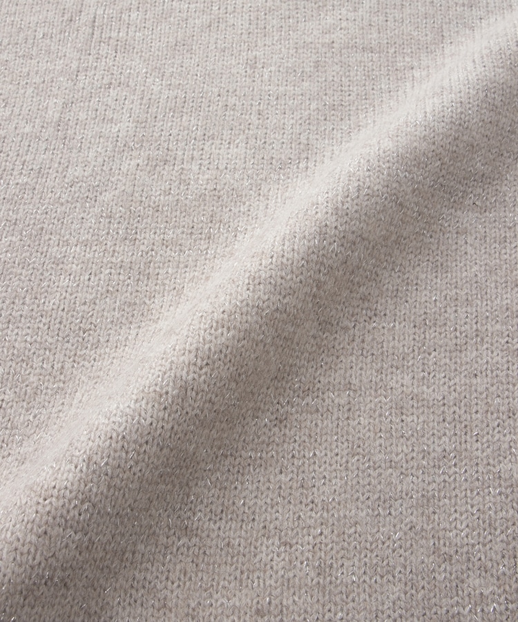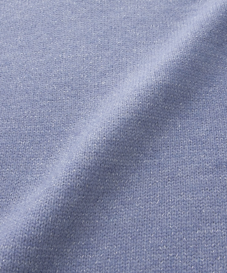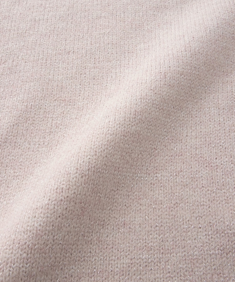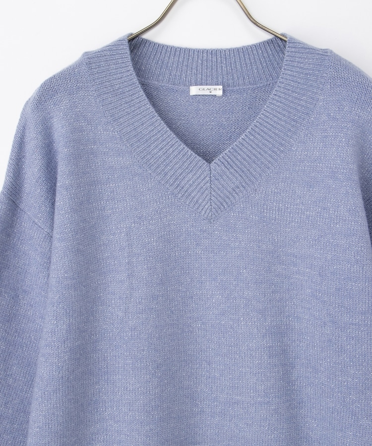 顔周りをすっきり見せるVネックのシンプルデザインに、程よい光沢感のラメで華やかさをプラス。