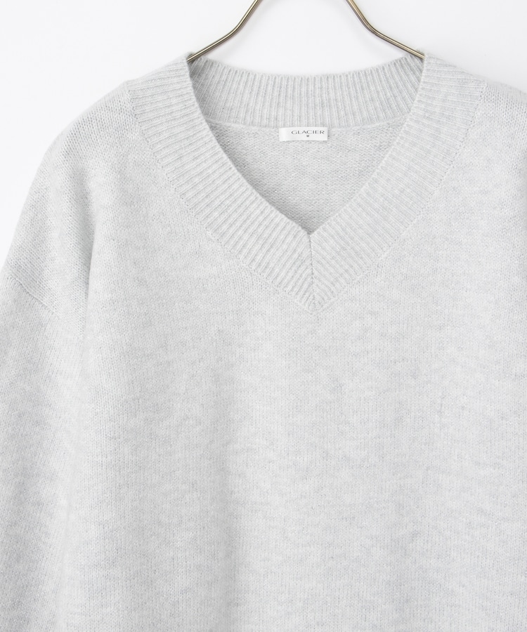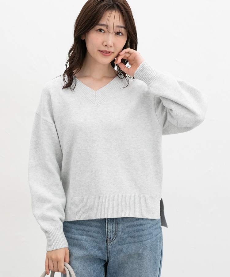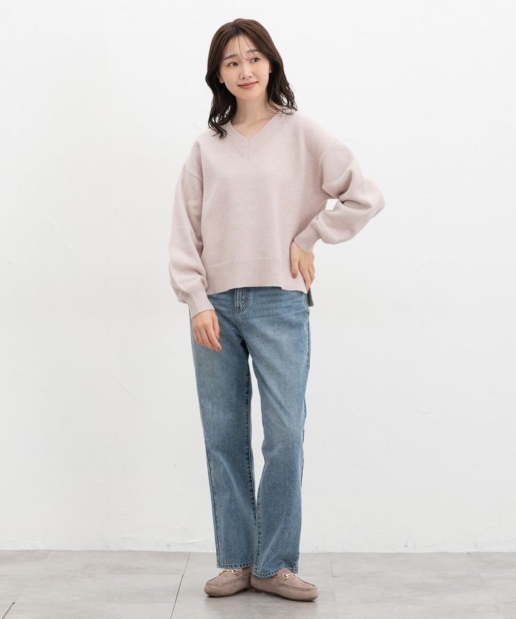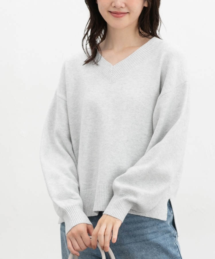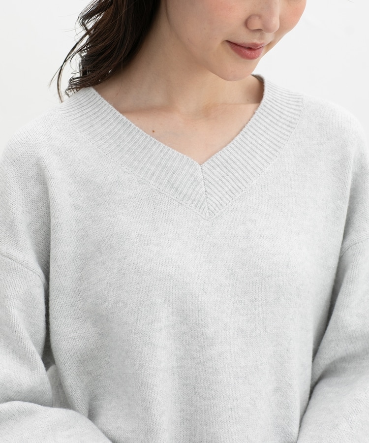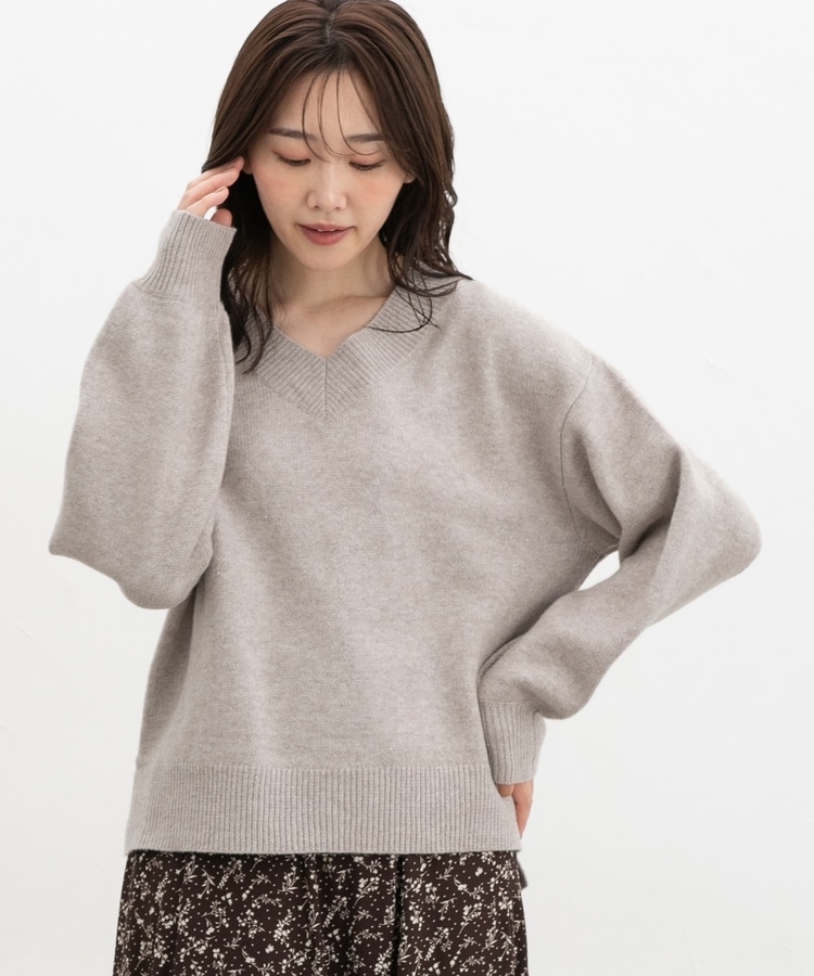 顔周りをすっきり見せるVネックのシンプルデザインに、程よい光沢感のラメで華やかさをプラス。