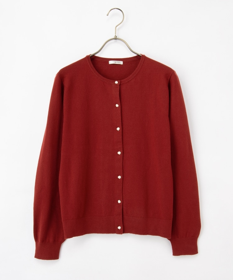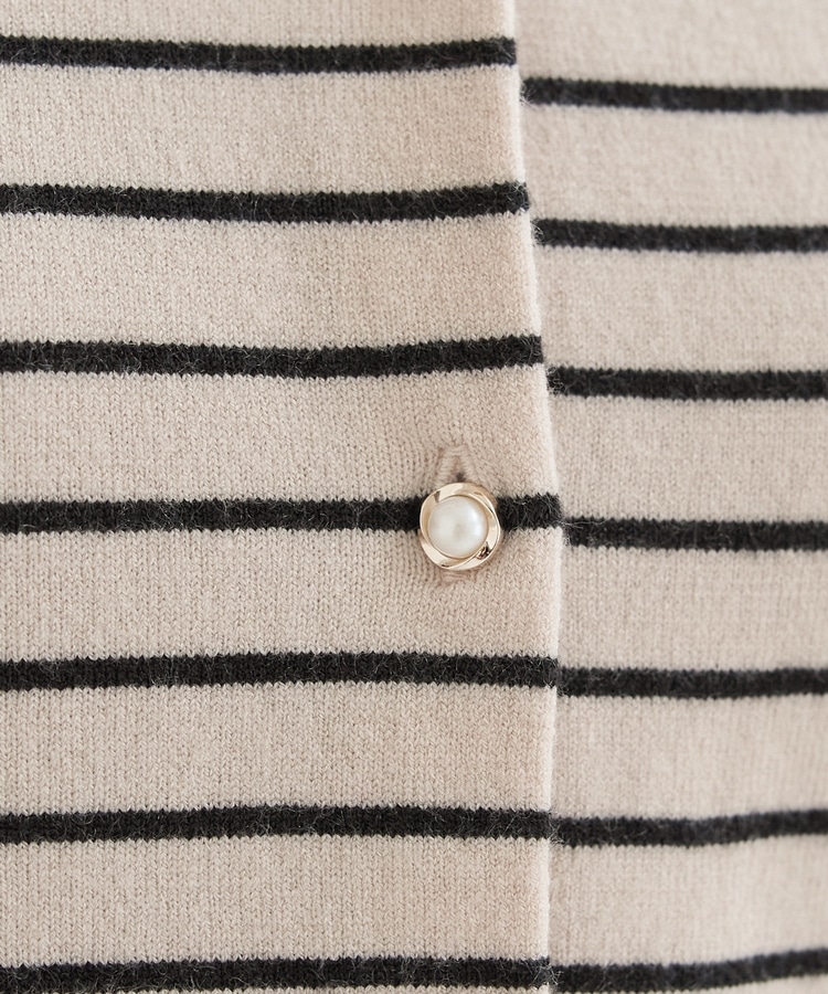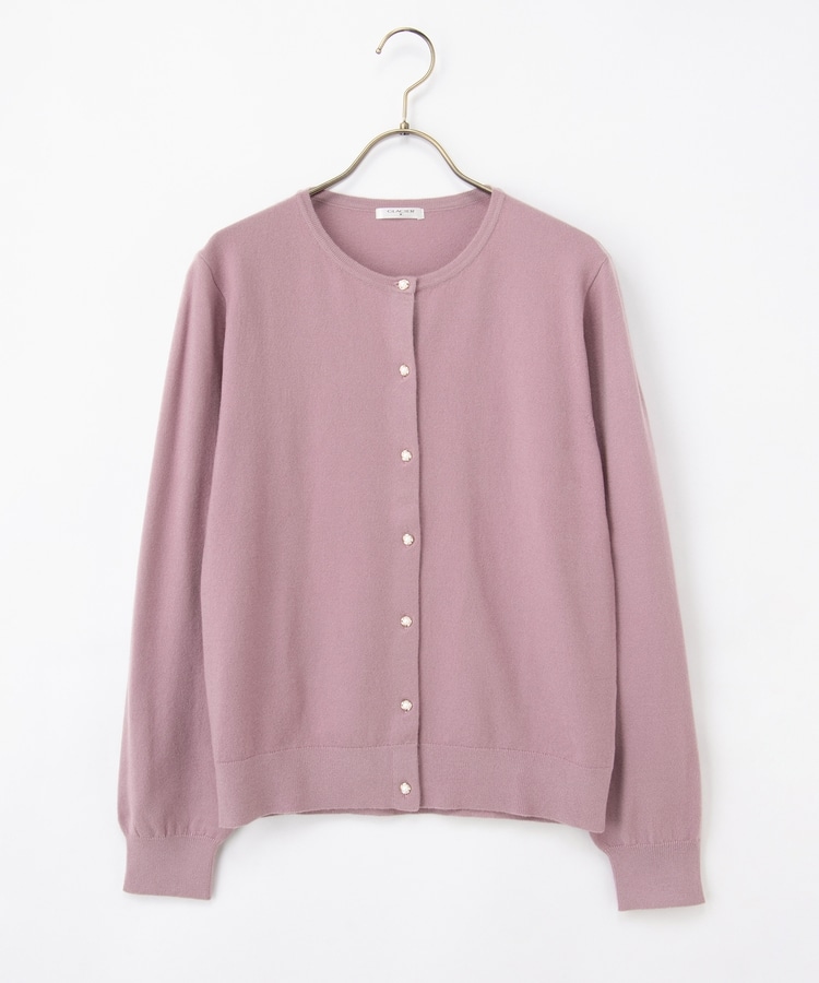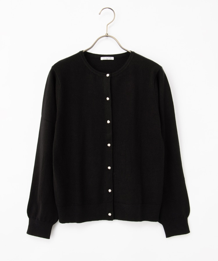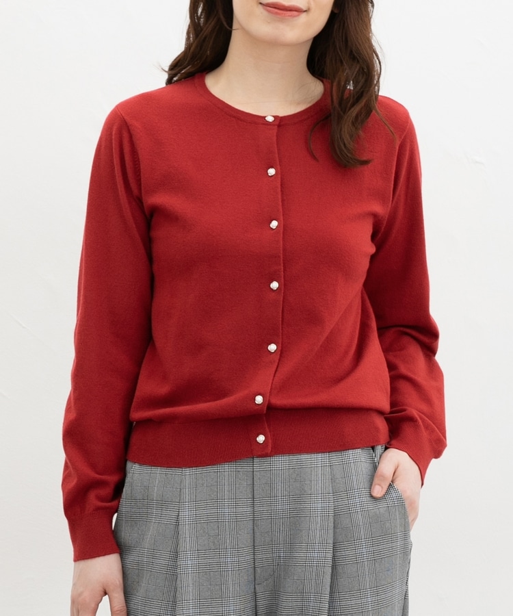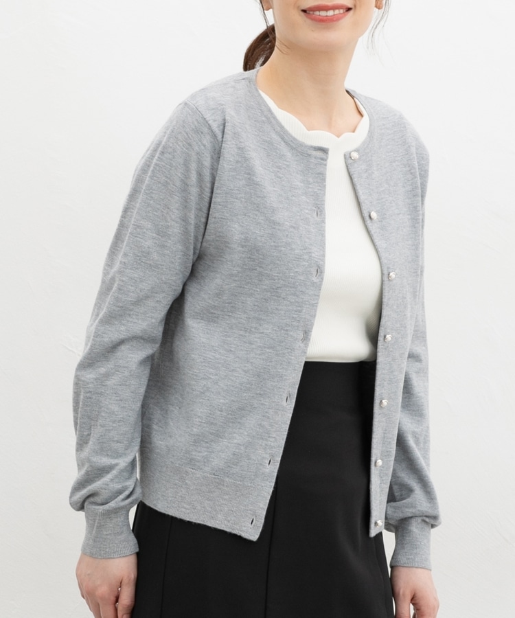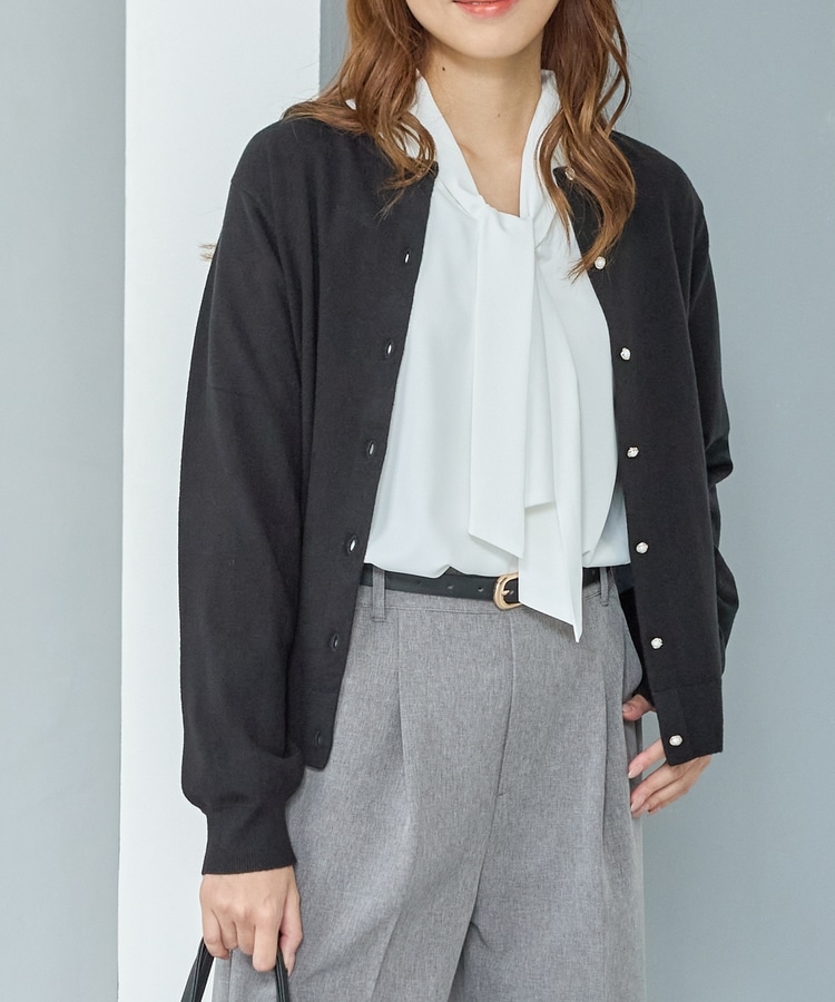 シンプルなクルーネックにパール調ボタンで華やかさをプラス。