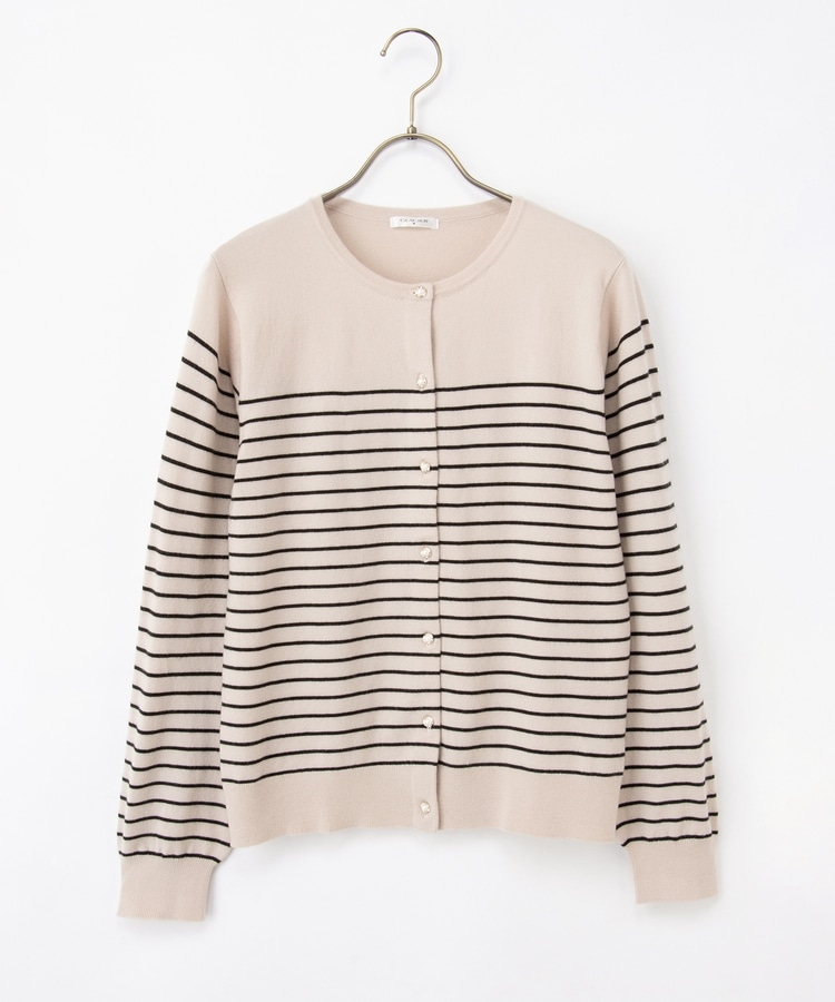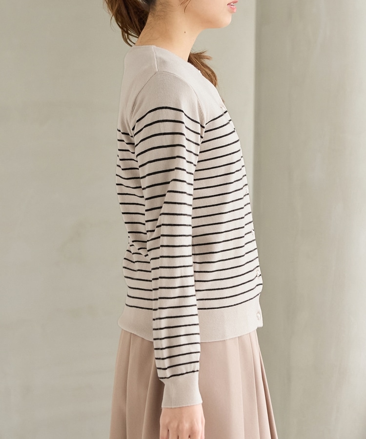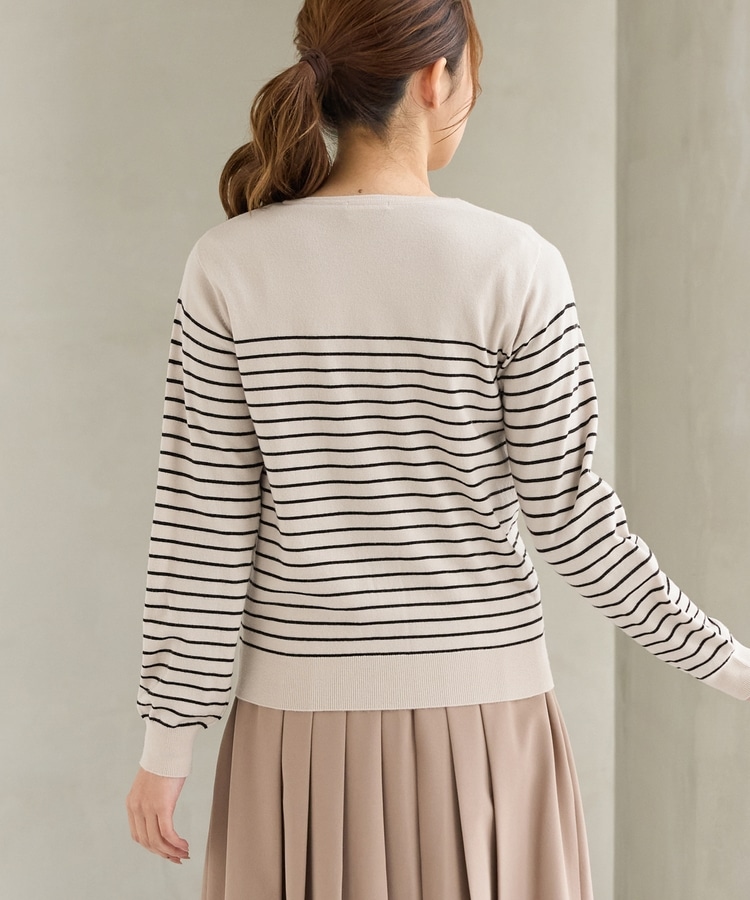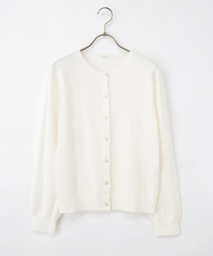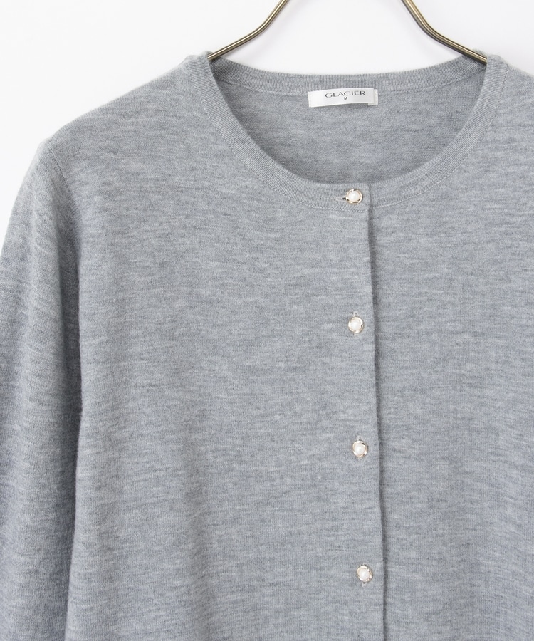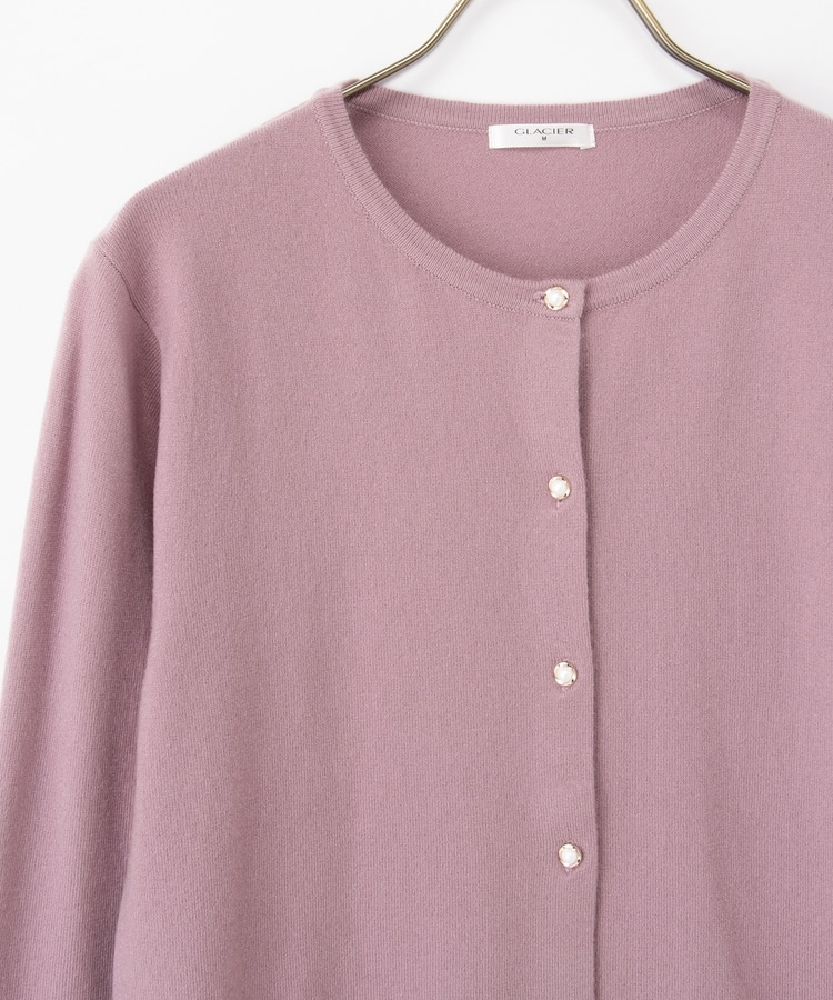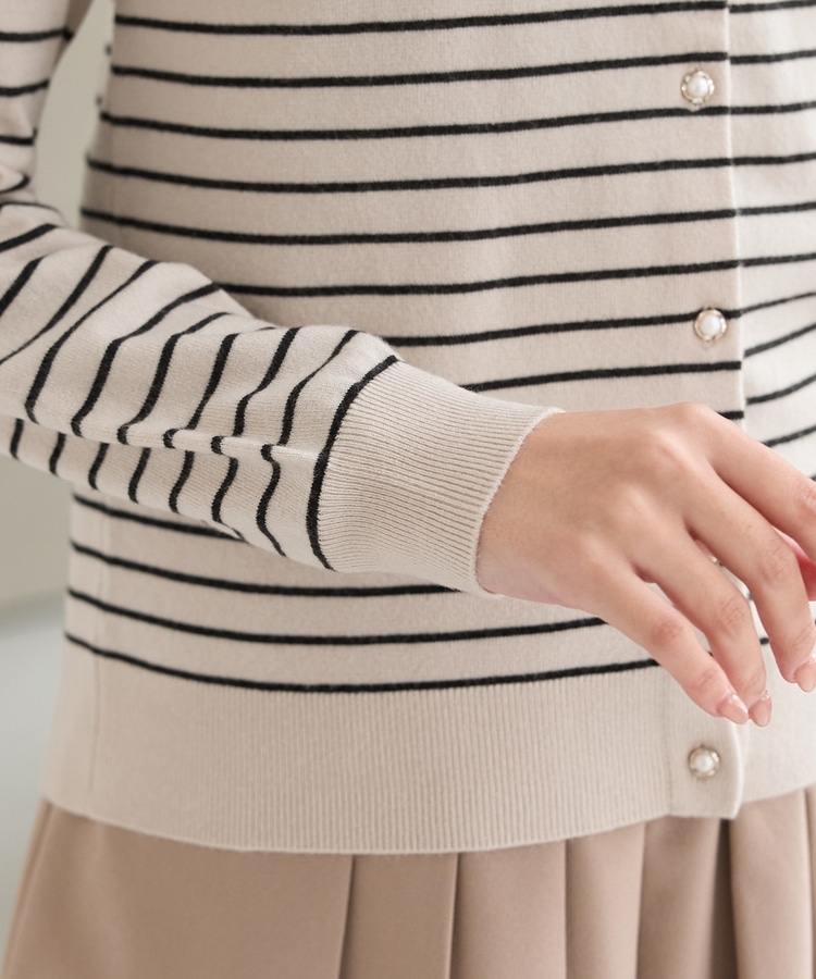 シンプルなクルーネックにパール調ボタンで華やかさをプラス。