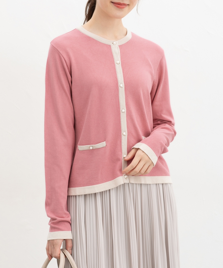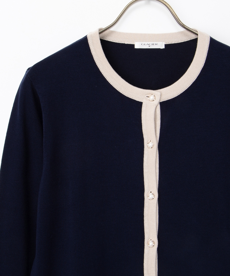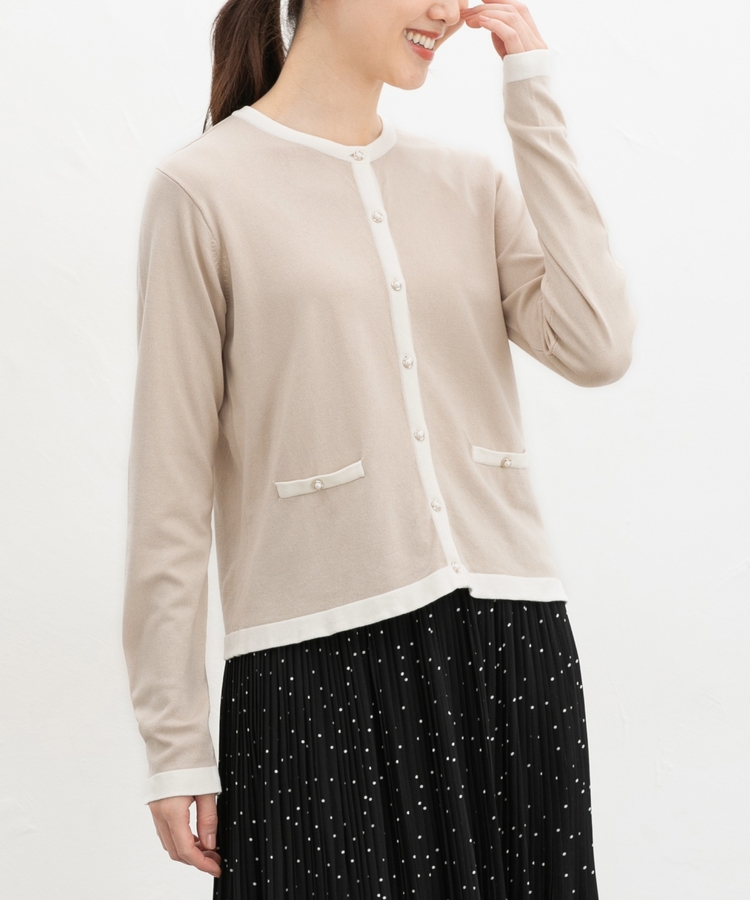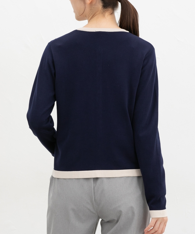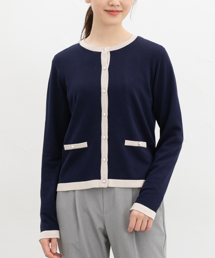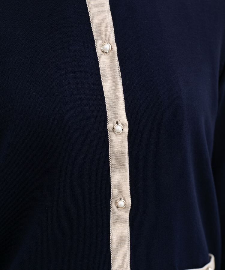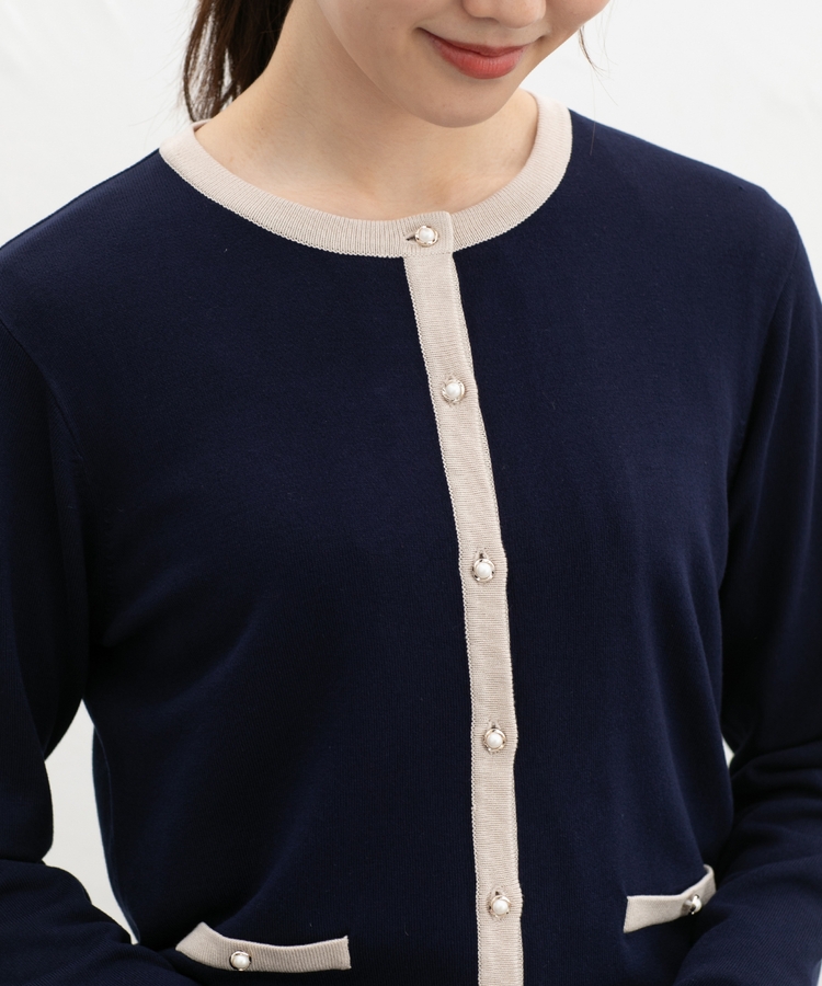 ベーシックなクルーネックにパール風ボタンと配色使いで上品なアクセントをプラス。