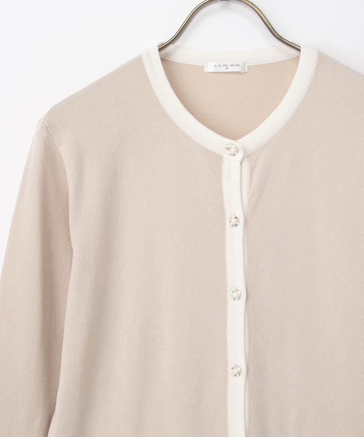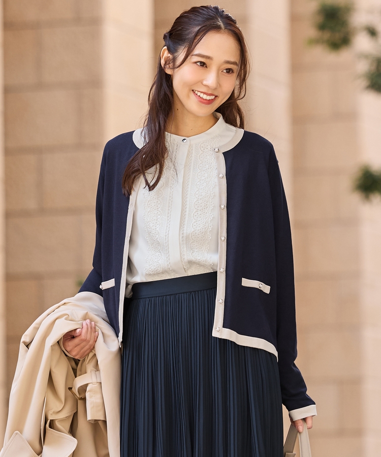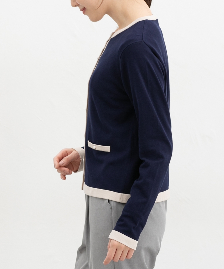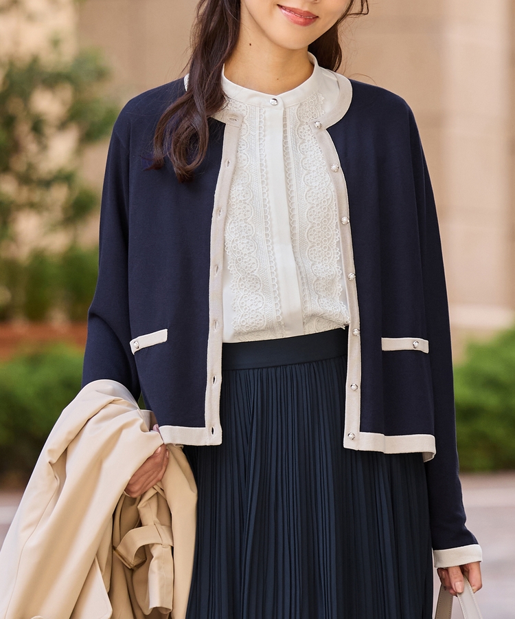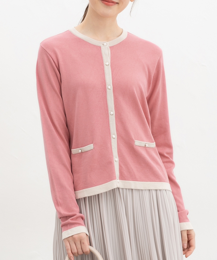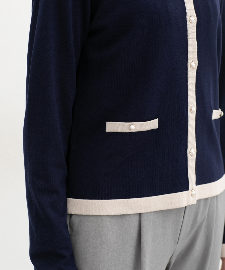 ベーシックなクルーネックにパール風ボタンと配色使いで上品なアクセントをプラス。