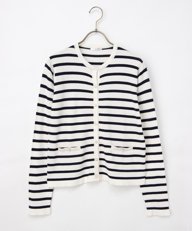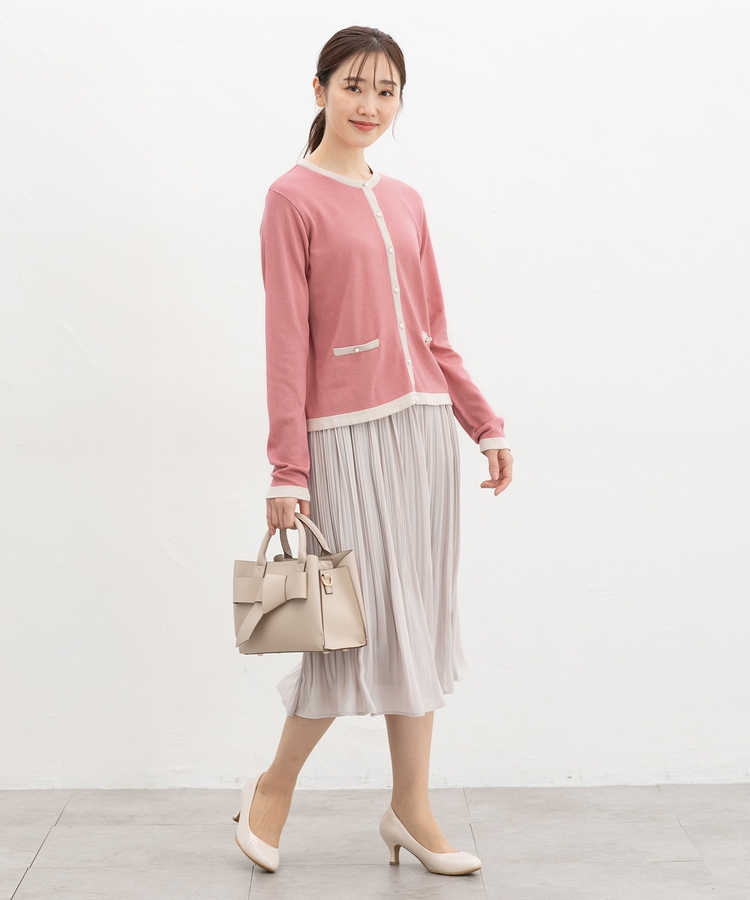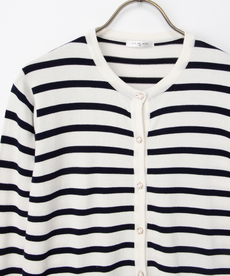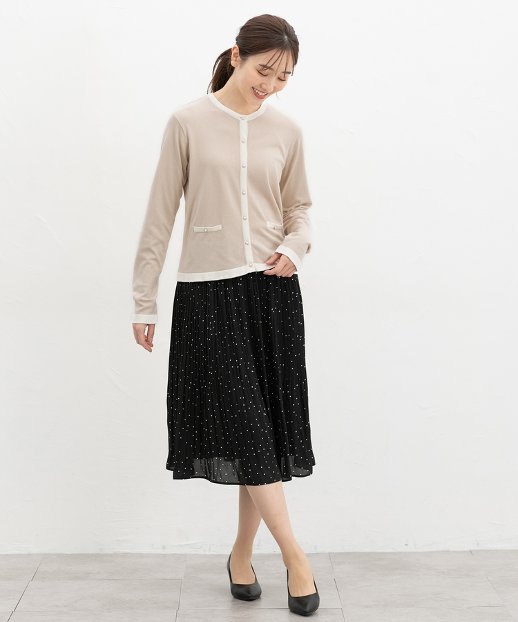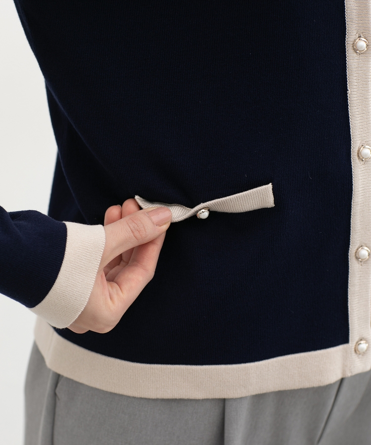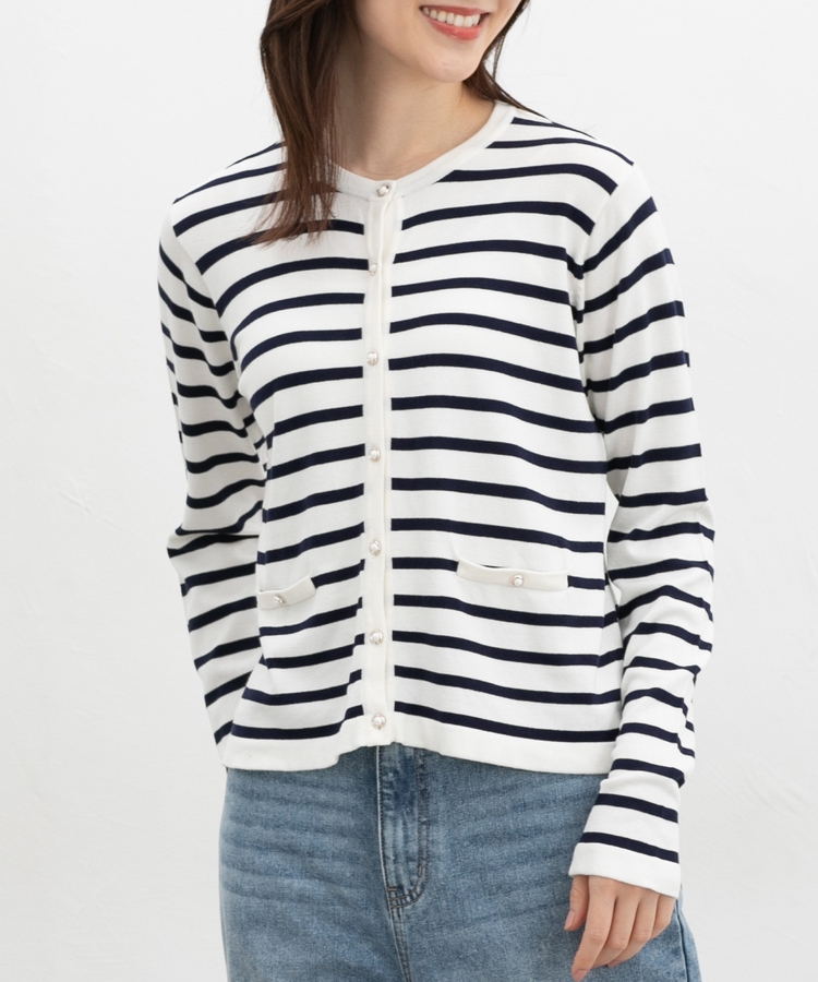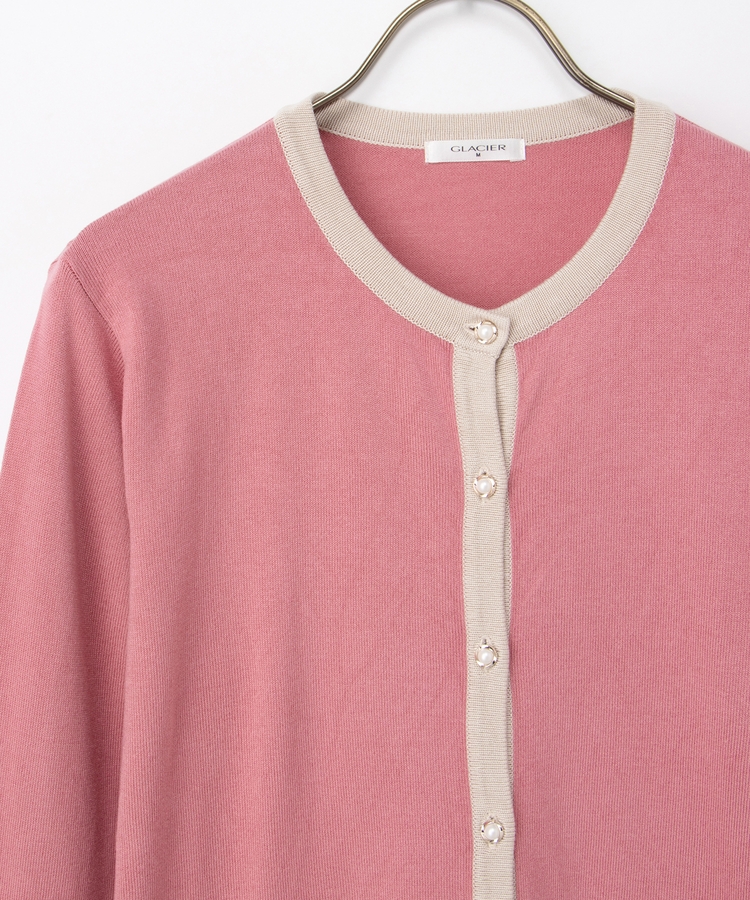 ベーシックなクルーネックにパール風ボタンと配色使いで上品なアクセントをプラス。