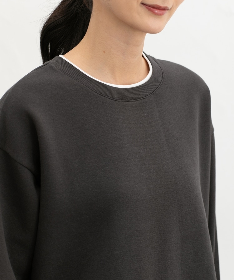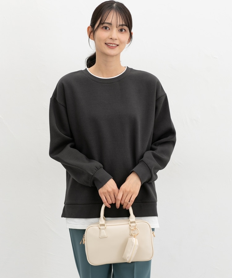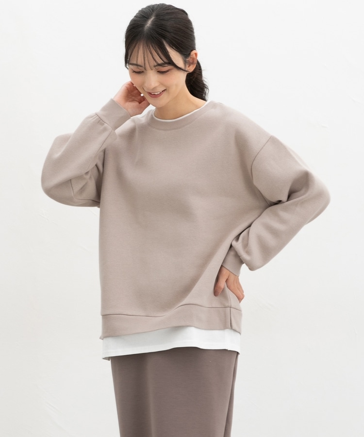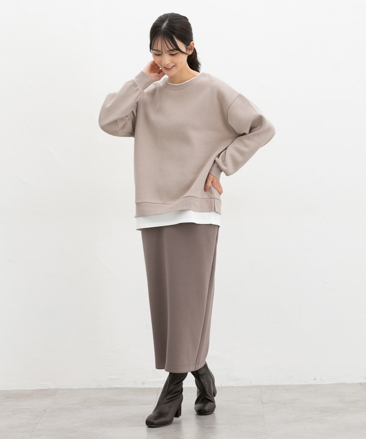 ヒップまで隠れる丈感とドロップショルダーのゆったりシルエットで体型もカバー。