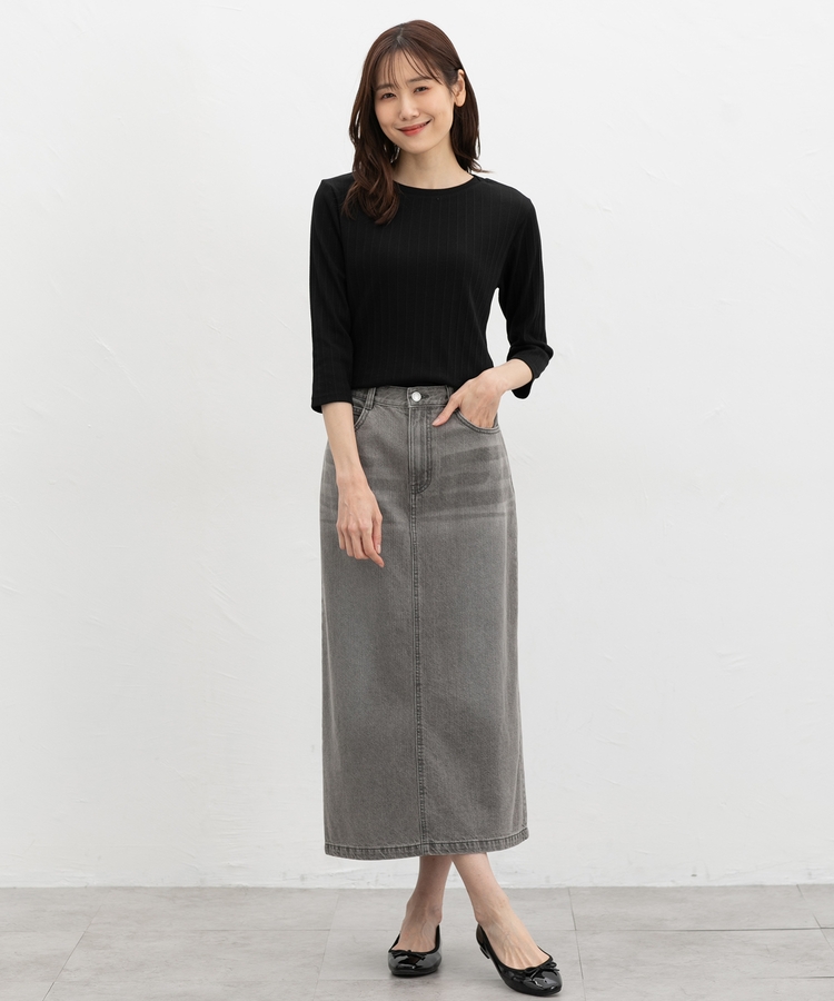 腰にかかる丈感の体にフィットするシルエットと縦目のラインで細見え効果も◎