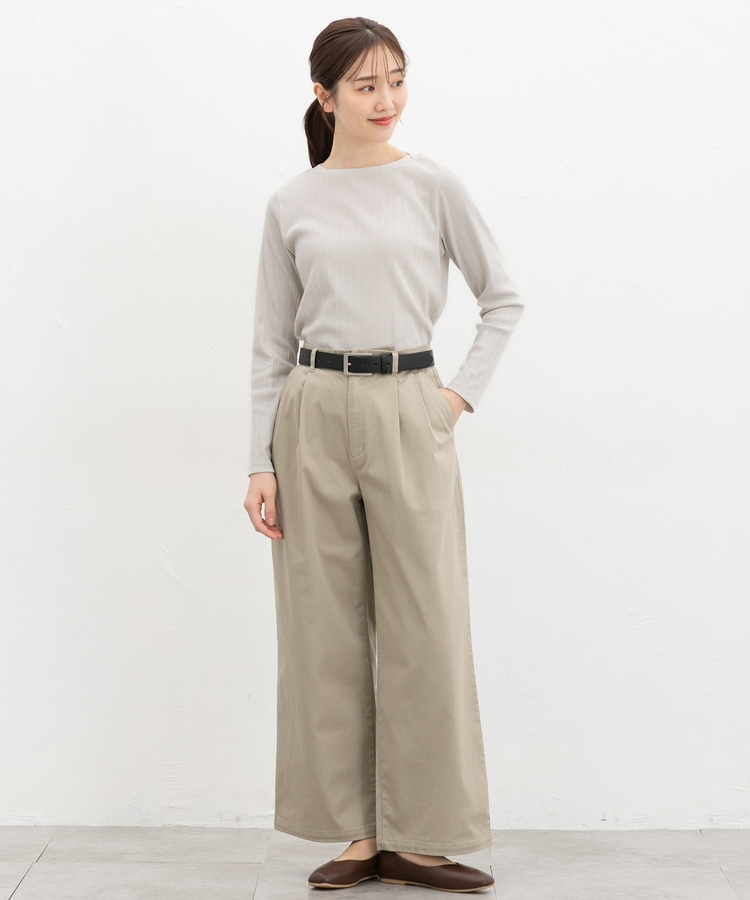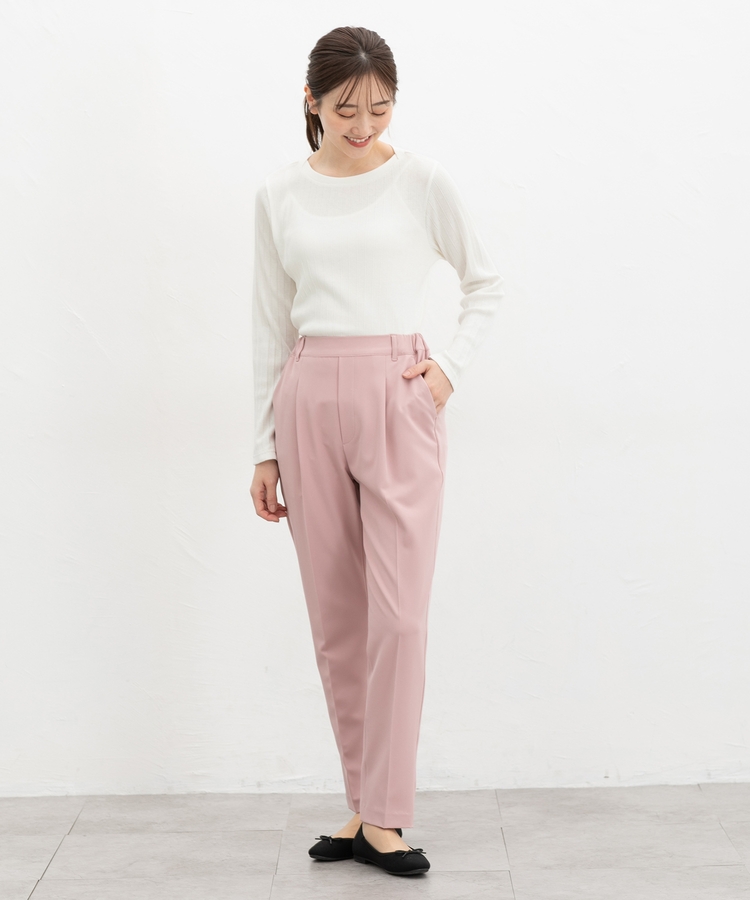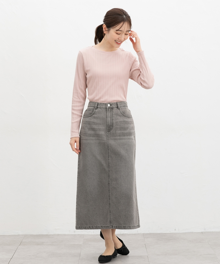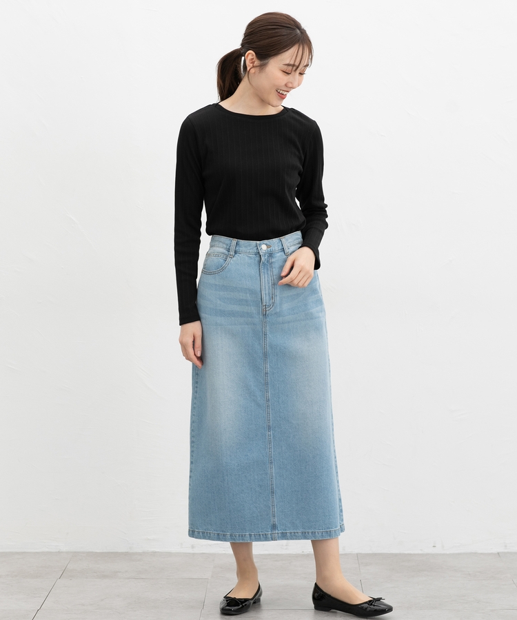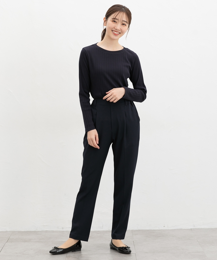 腰にかかる丈感のすっきりめシルエットと縦目のラインで細見え効果も◎