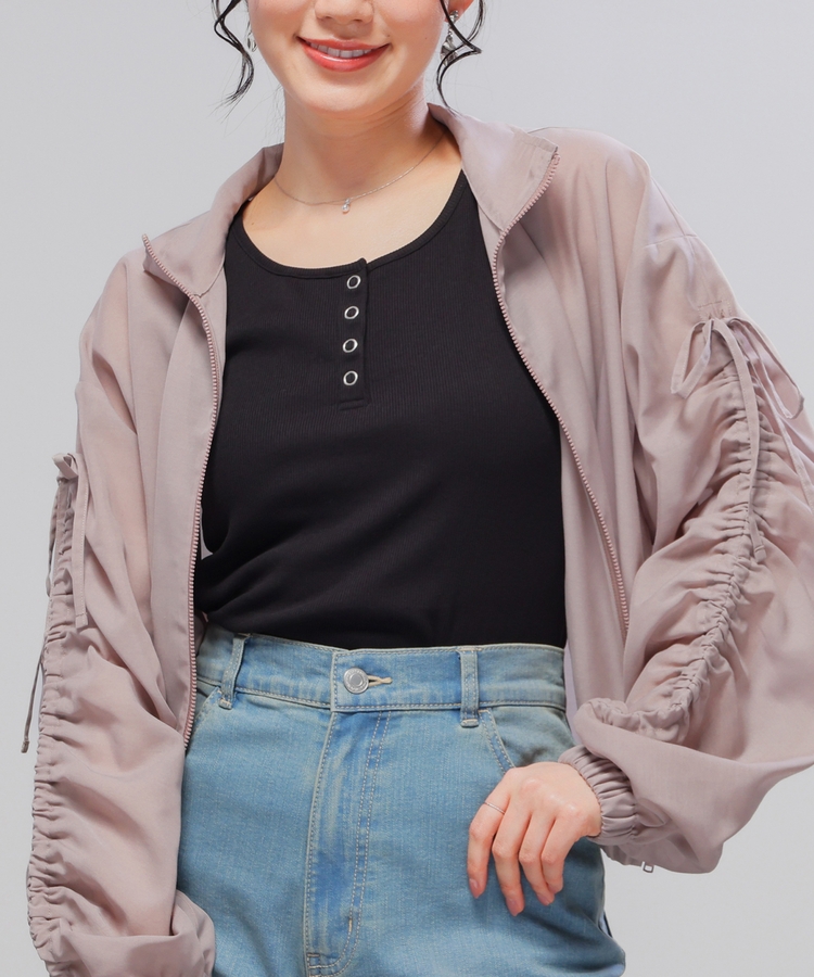シンプルながら胸元のボタンがアクセントになるヘンリーネックデザイン。