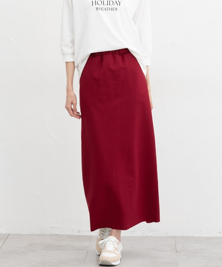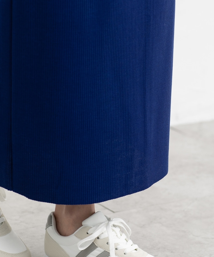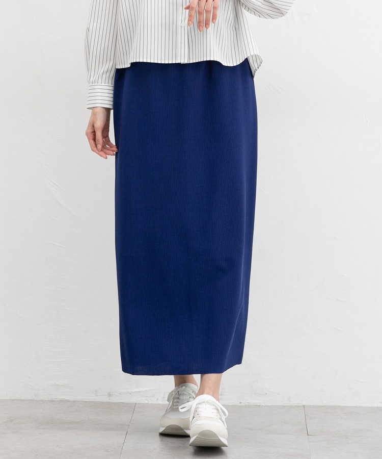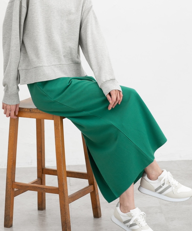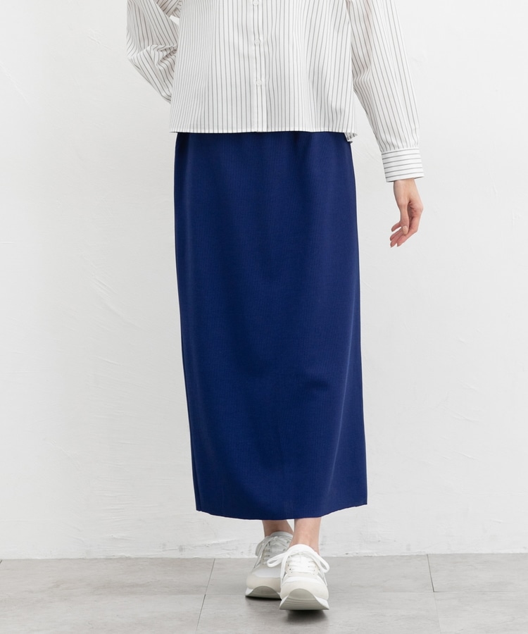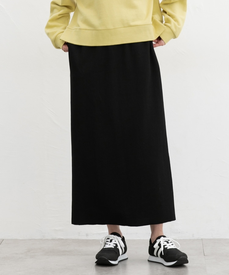 縦の編み目とすとんとしたIラインシルエットで脚長効果抜群のシンプルデザイン。