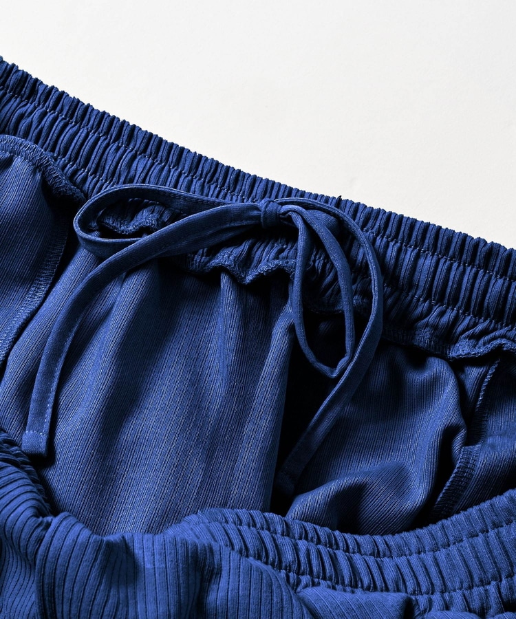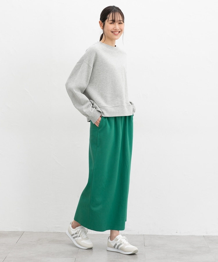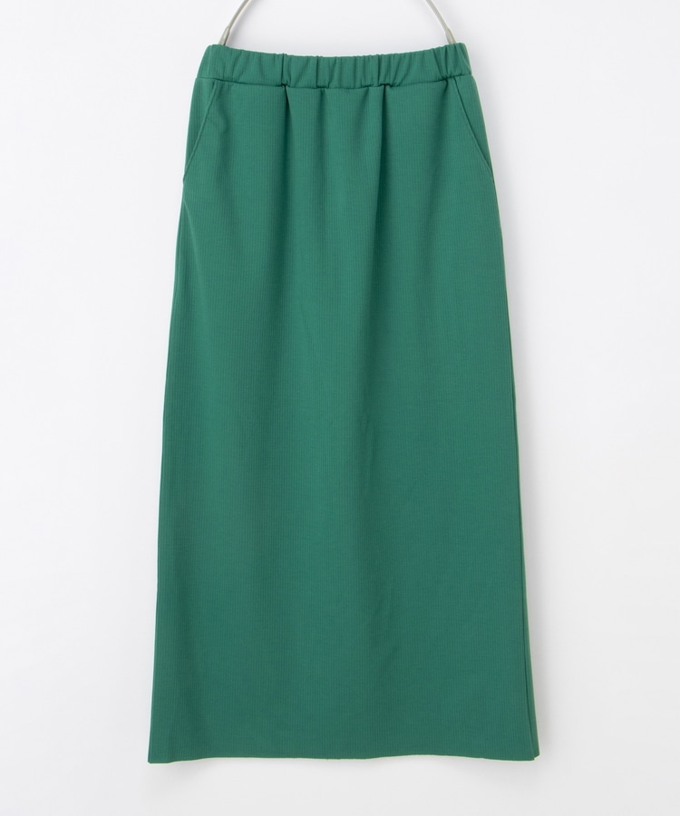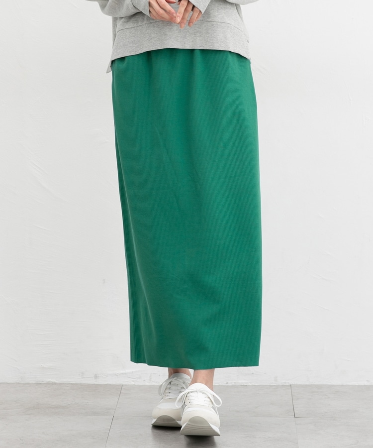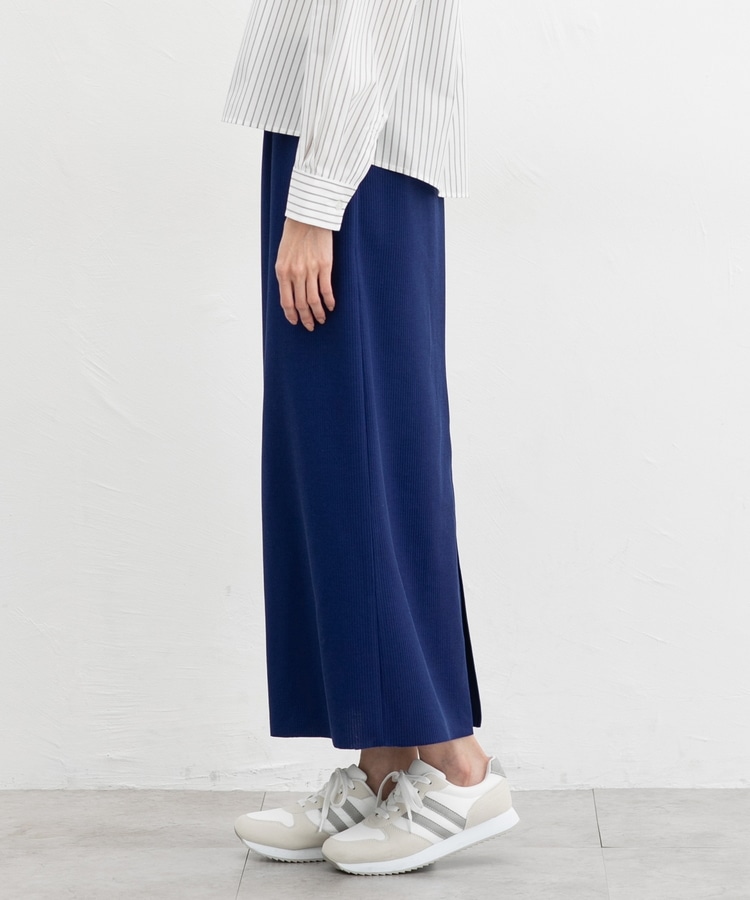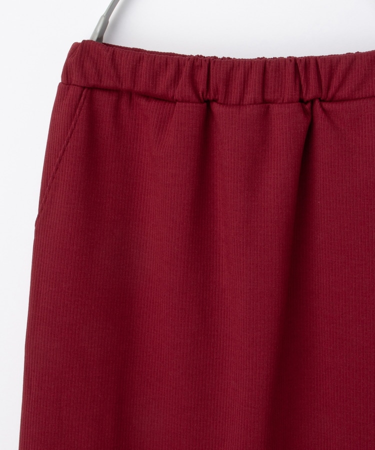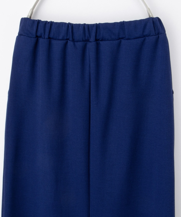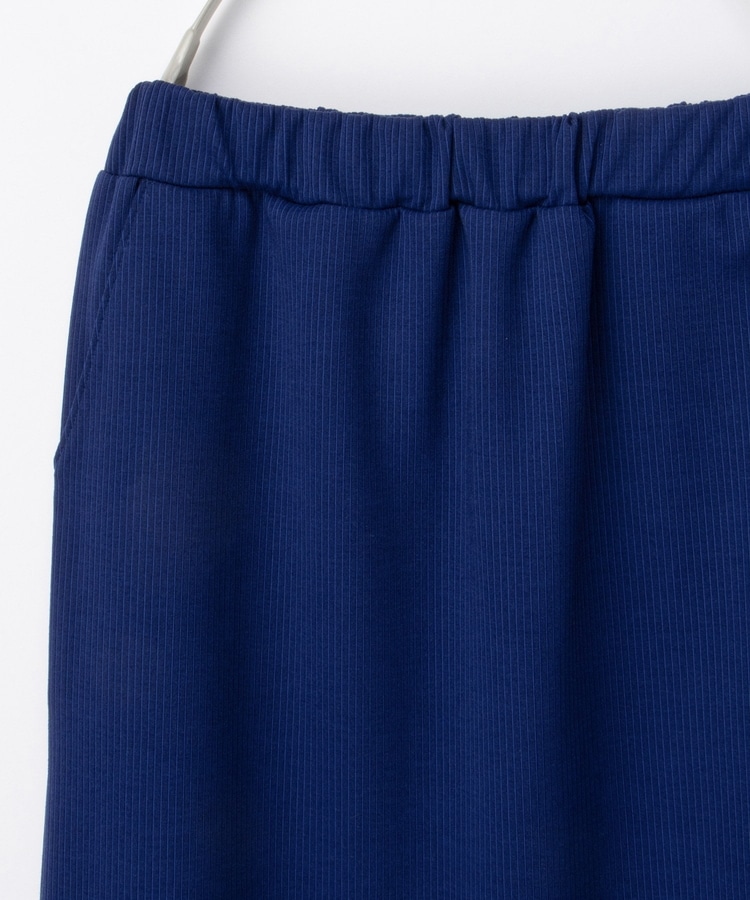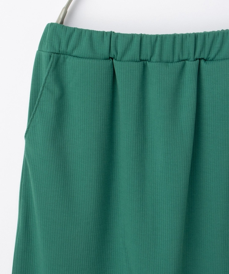 ストレッチの利いたレーヨン混のリブ素材とウエストゴムで、ストレスフリーなはき心地。