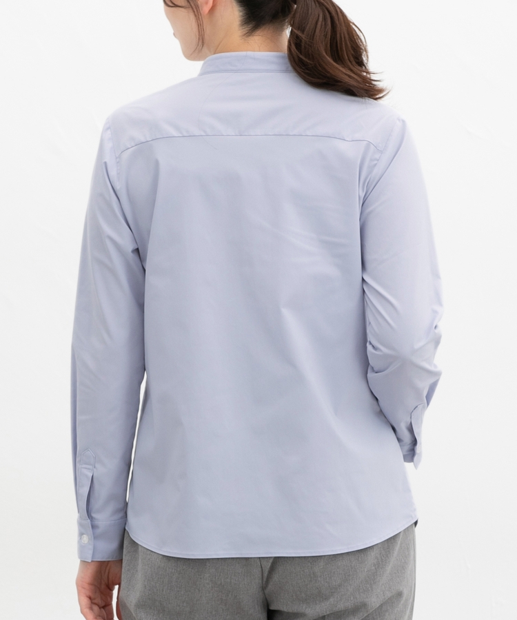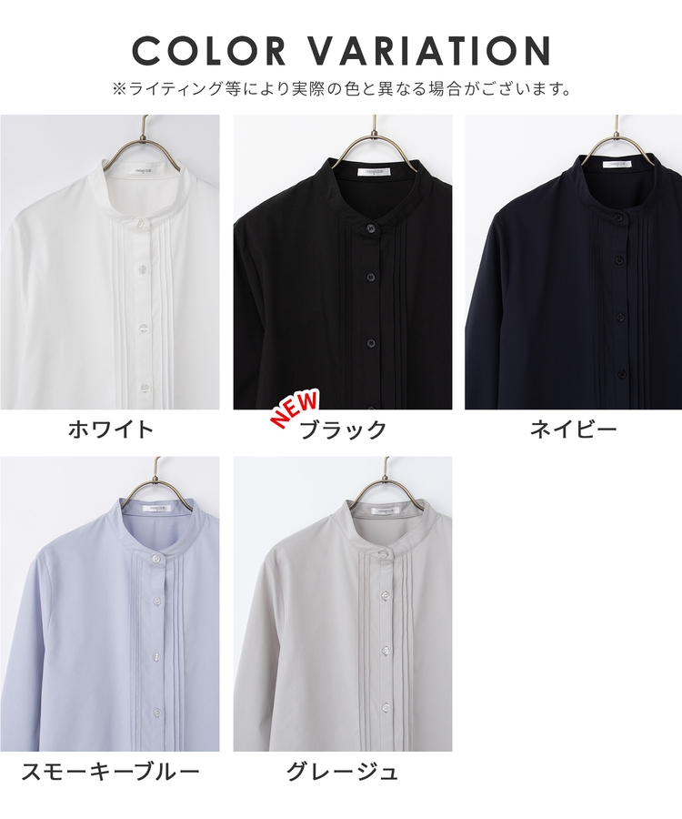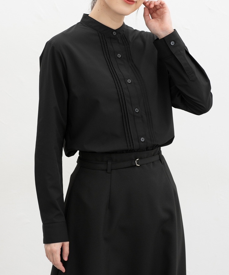 程よい抜け感のスタンドカラーと、フロントのピンタックが上品なデザイン。