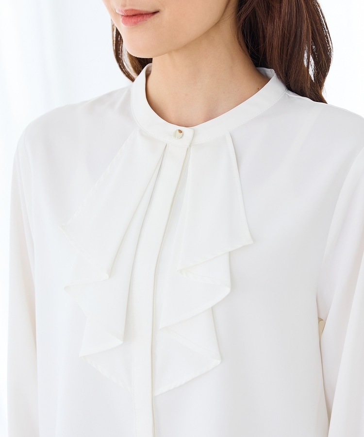 流れるようなドレープのラッフルフリルに、さりげないゴールドボタンがアクセント。