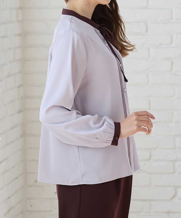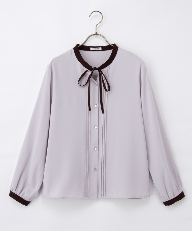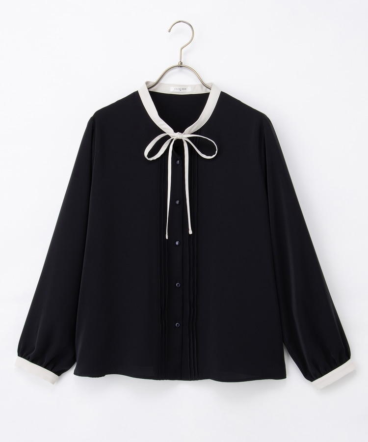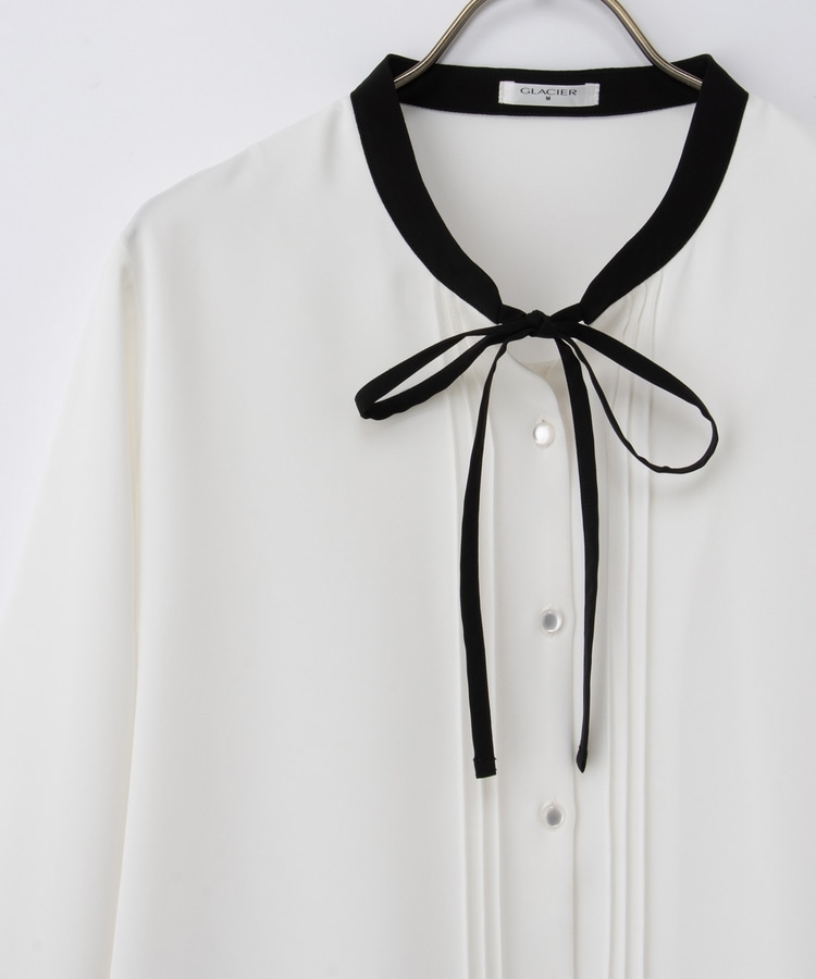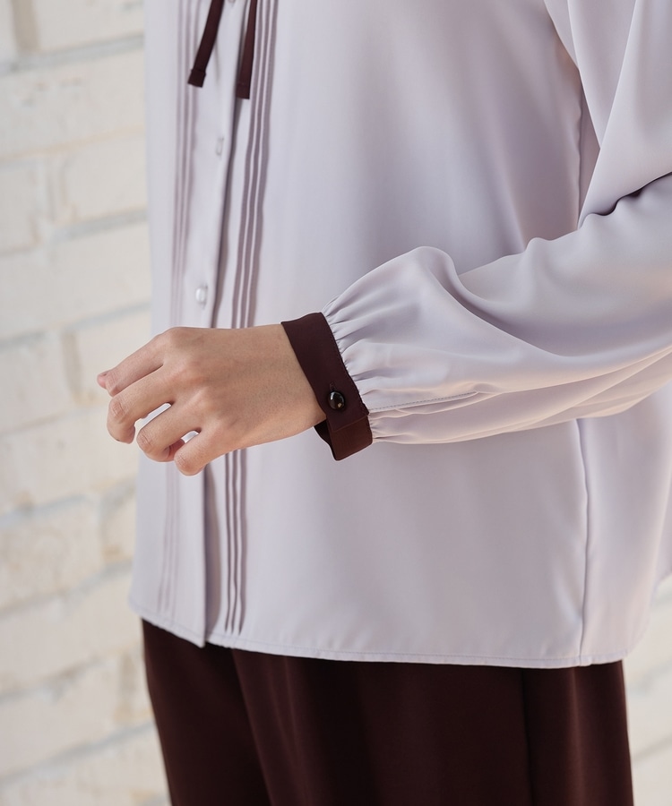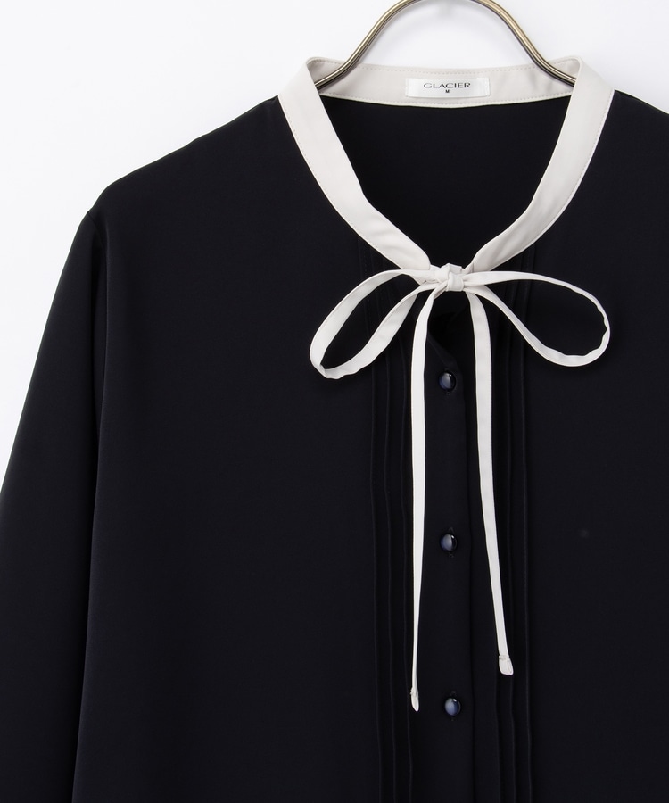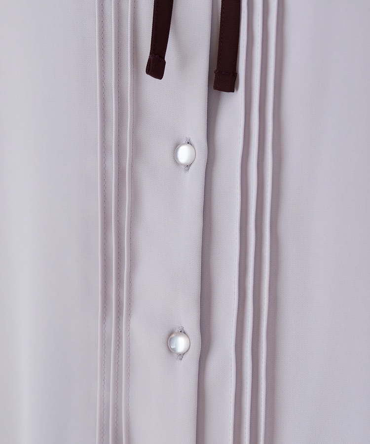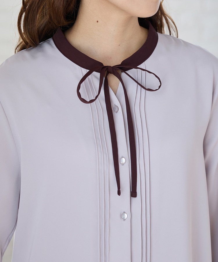 優しい印象のバンドカラーに、シックな配色リボンとピンタックをプラスした大人可愛いデザイン。