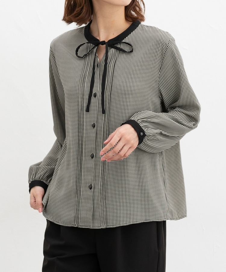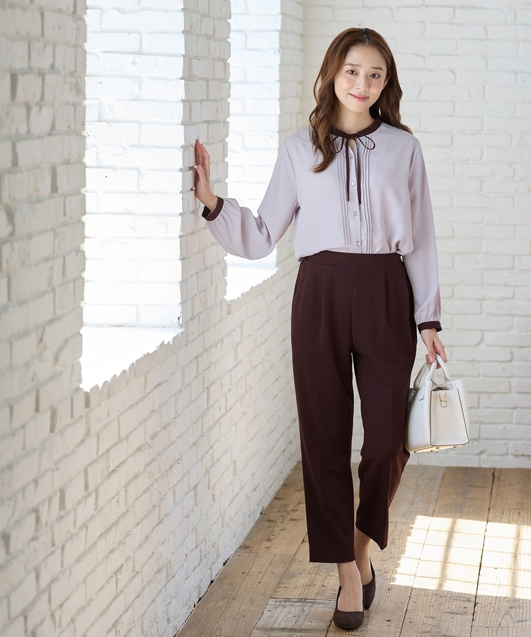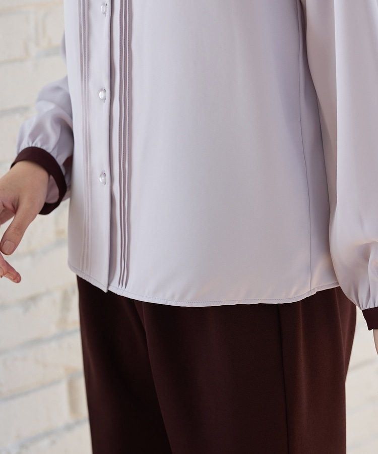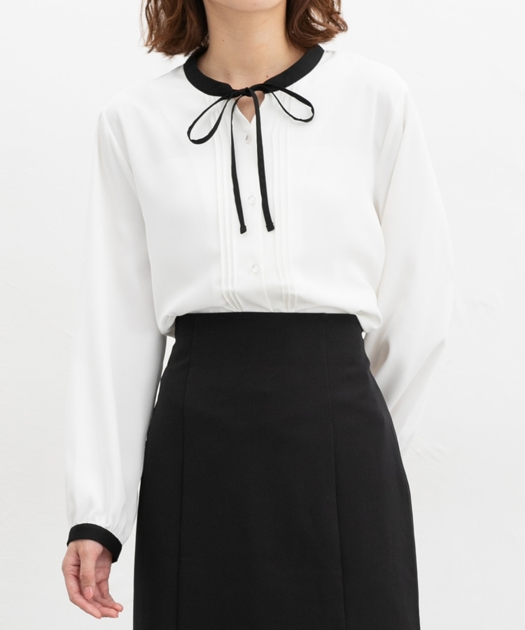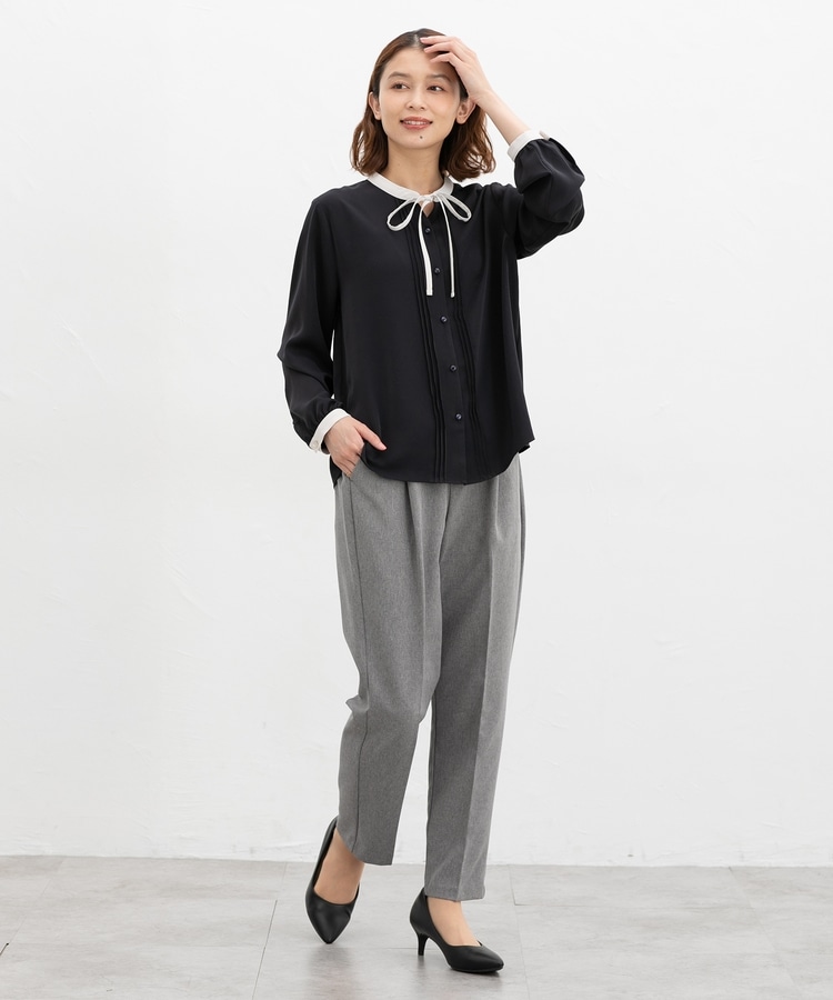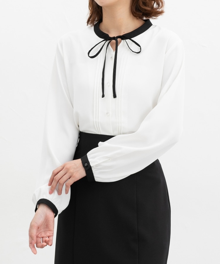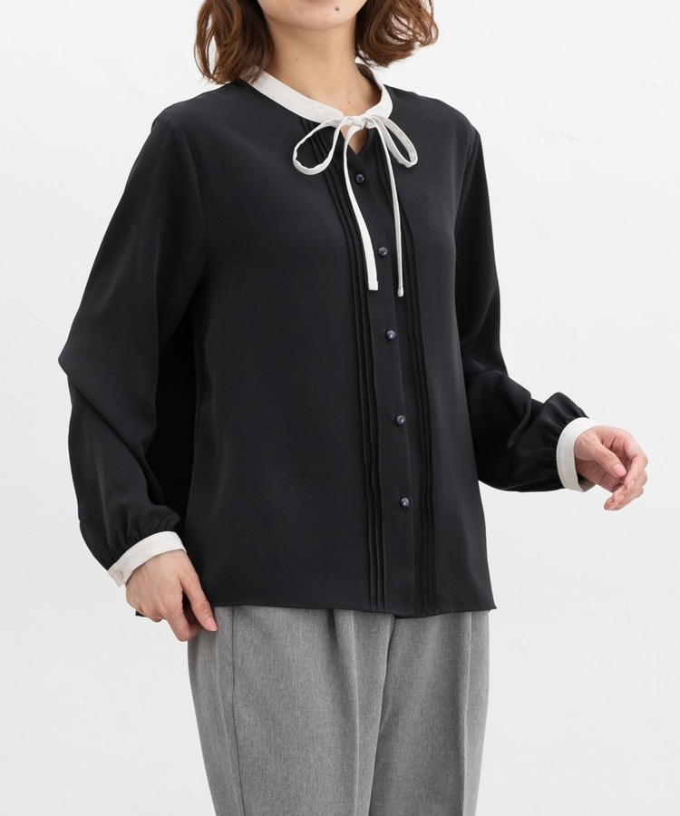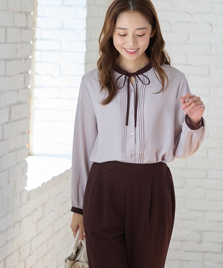 優しい印象のバンドカラーに、シックな配色リボンとピンタックをプラスした大人可愛いデザイン。