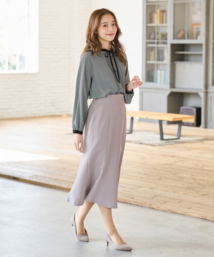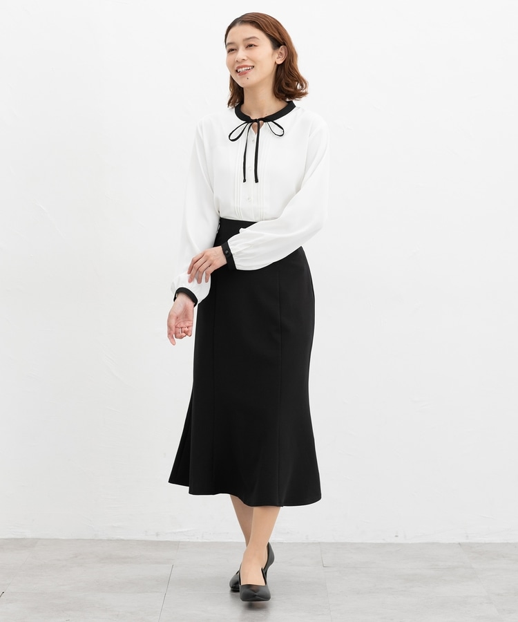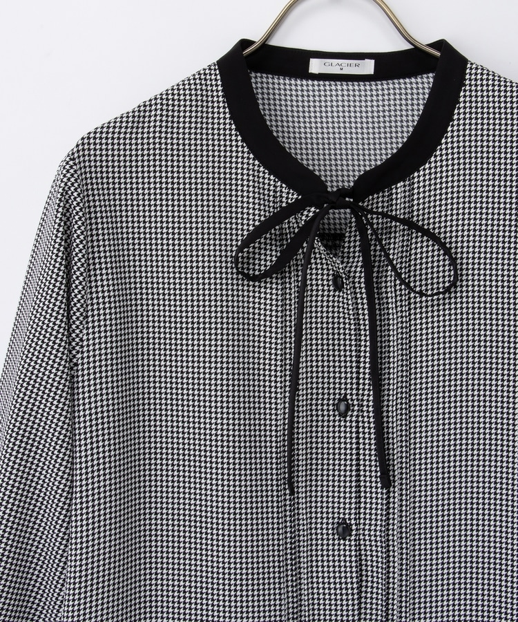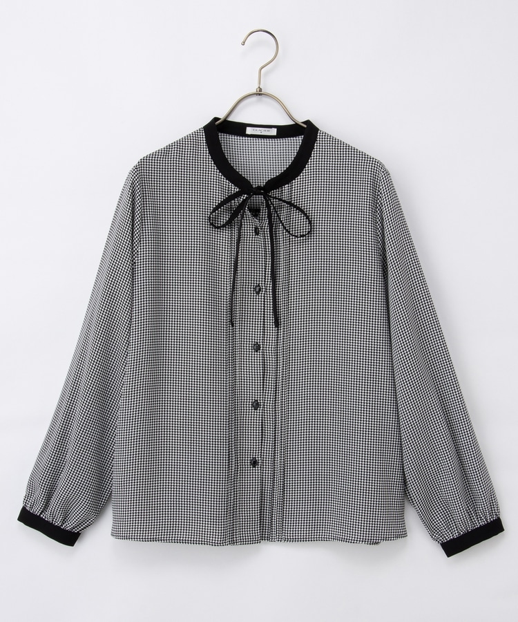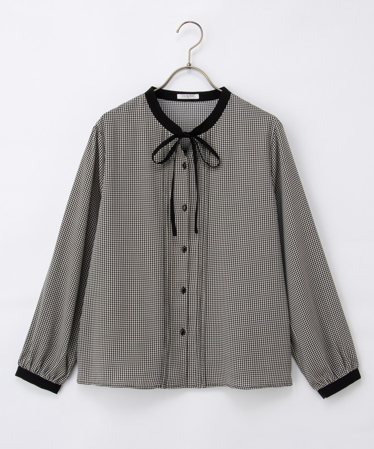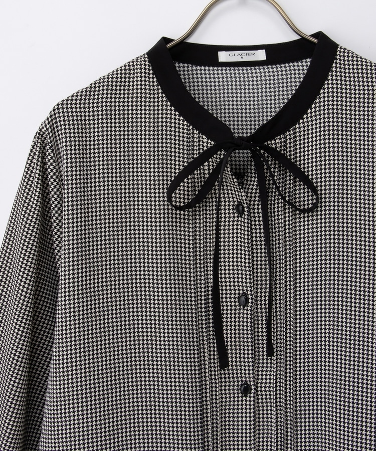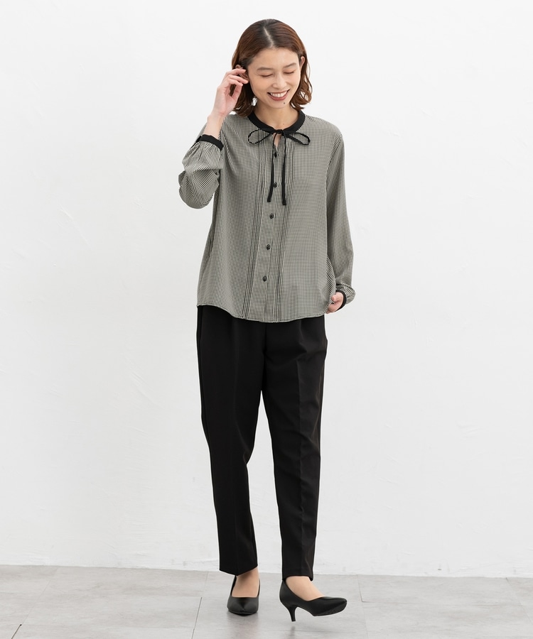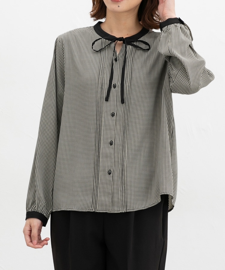 優しい印象のバンドカラーに、シックな配色リボンとピンタックをプラスした大人可愛いデザイン。