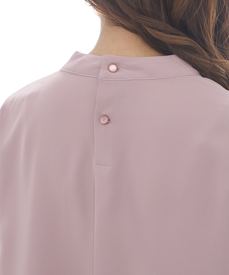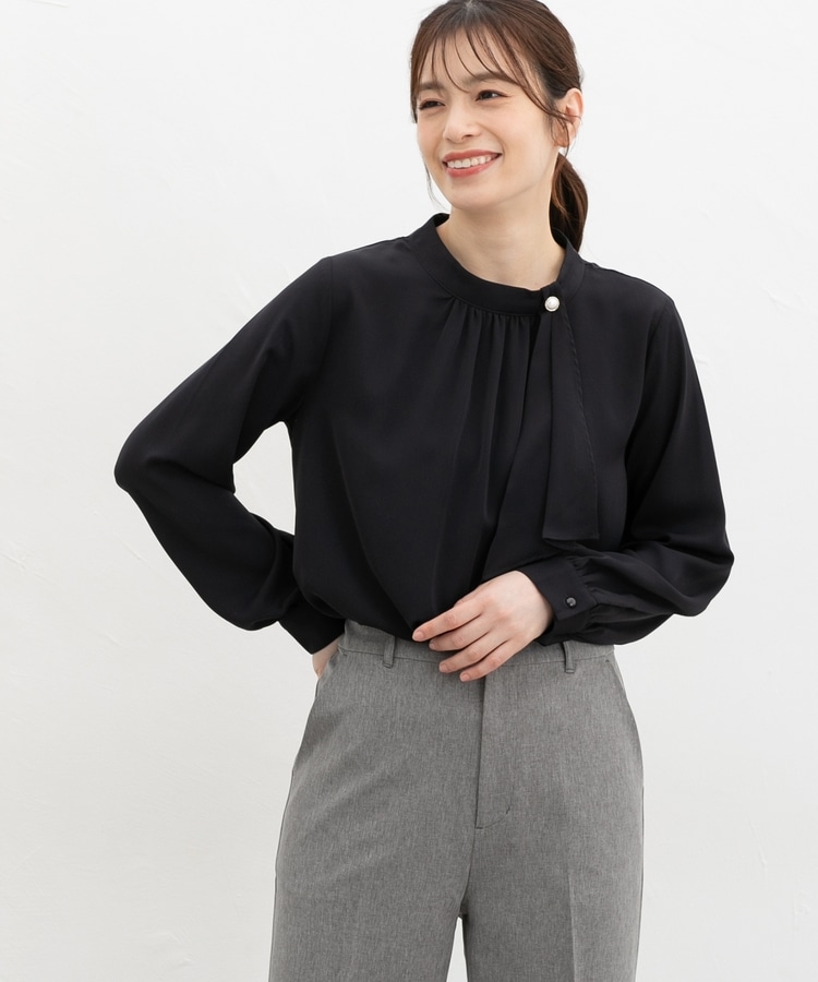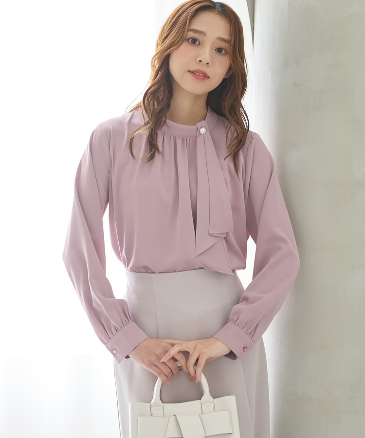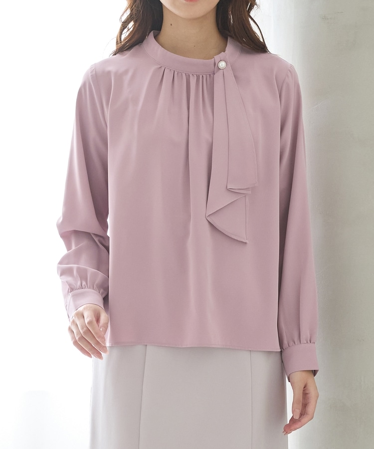 リボンを結ぶ必要のないアシンメトリーのボウタイに、パール風ボタンを飾った華やかで上品なデザイン。