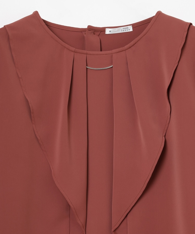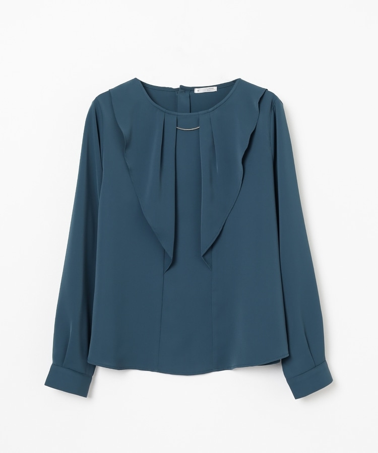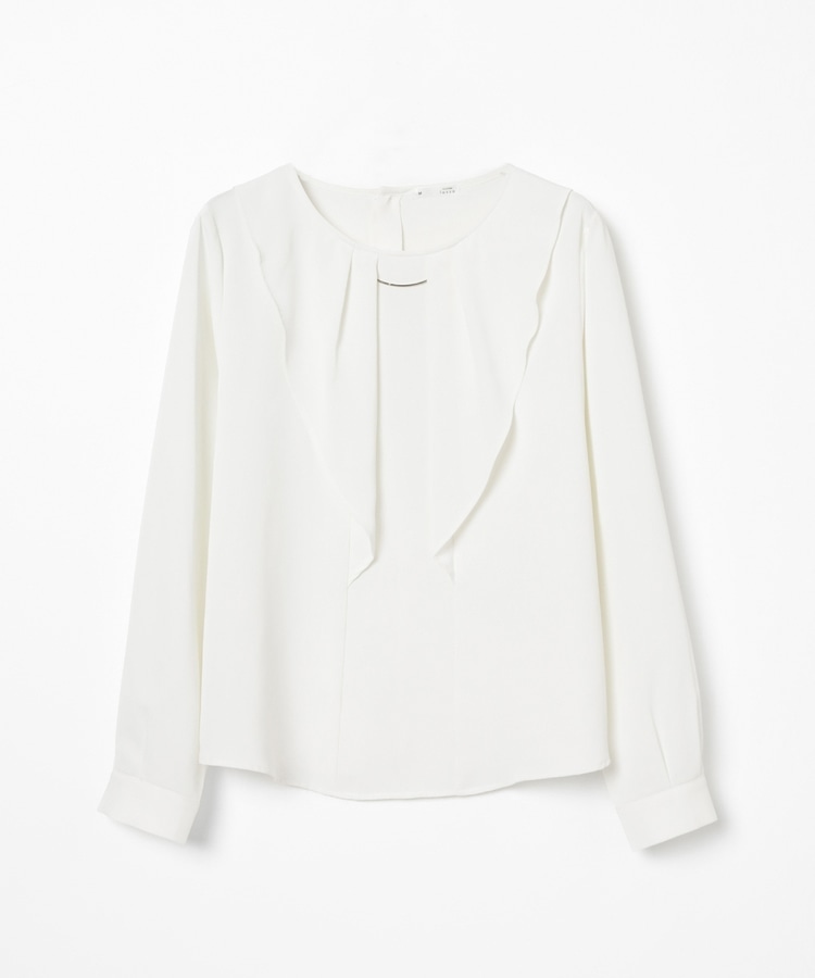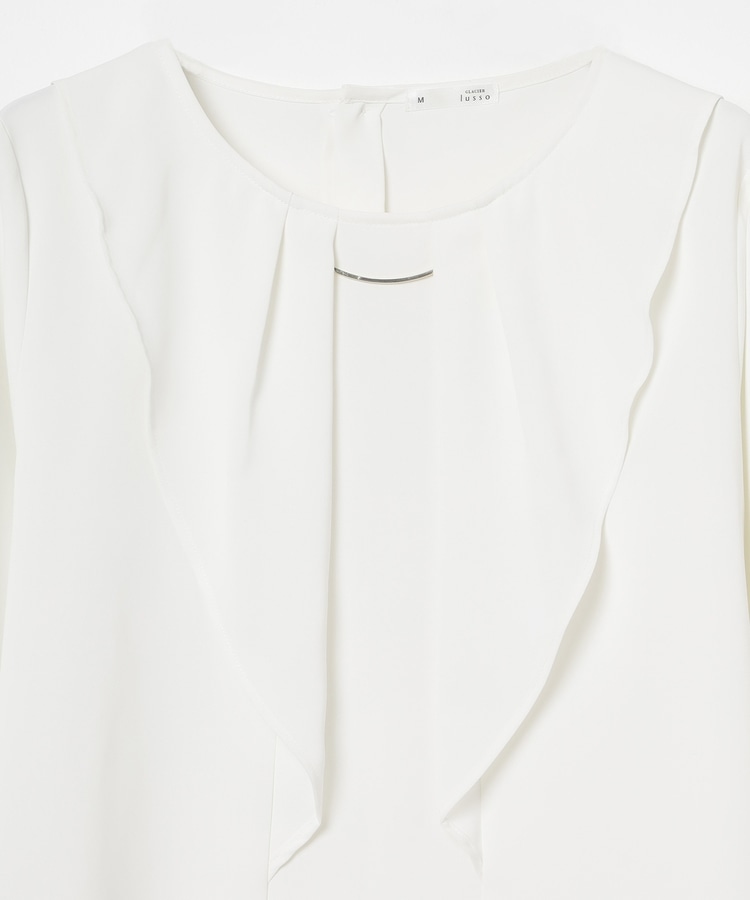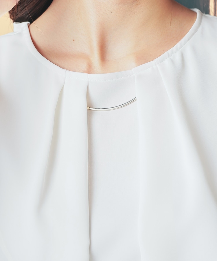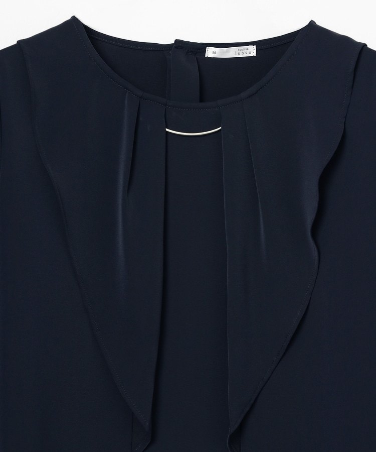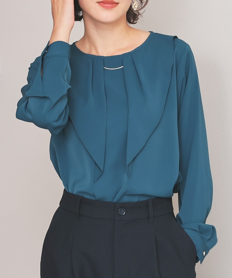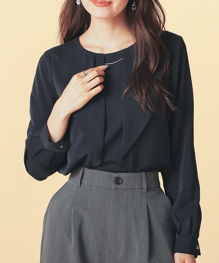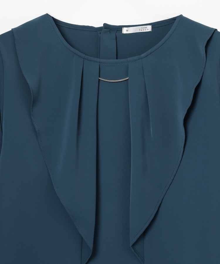 顔回りに華やかさをプラスしてくれるラッフルフリルに、シーンや気分に合わせて取り外しできるメタルパーツのアクセサリーがさりげないアクセント。
