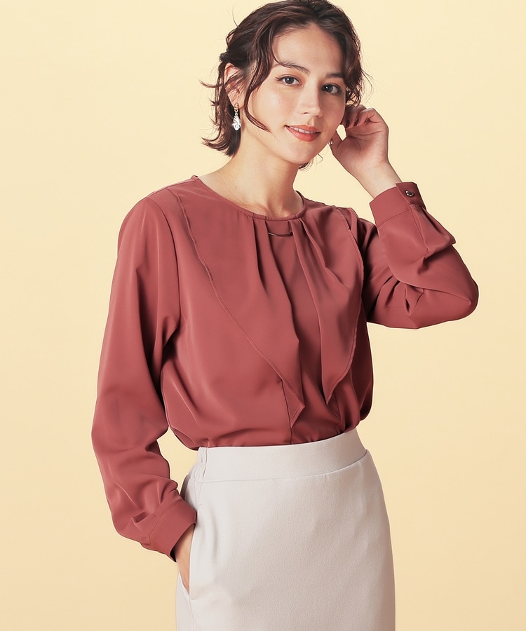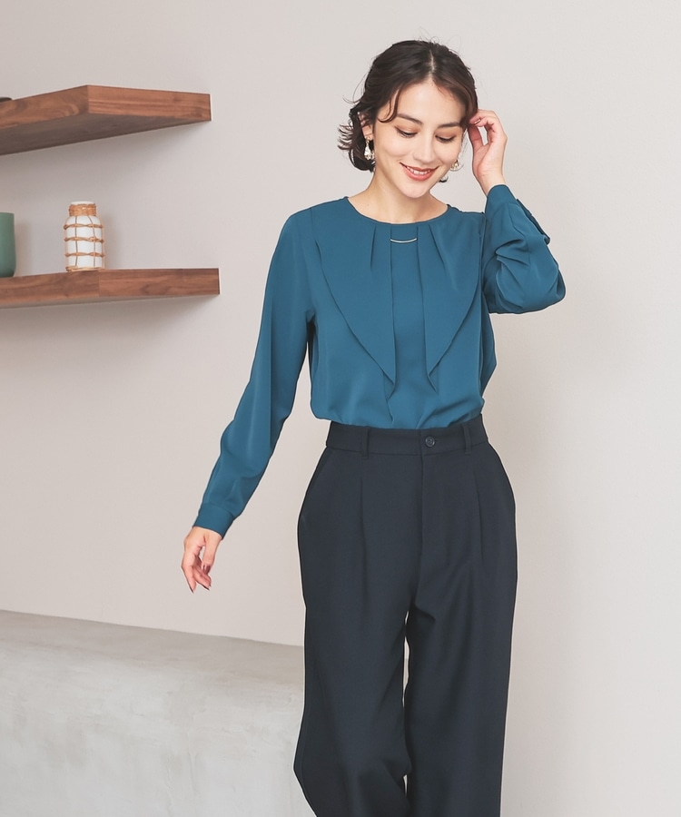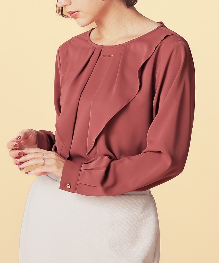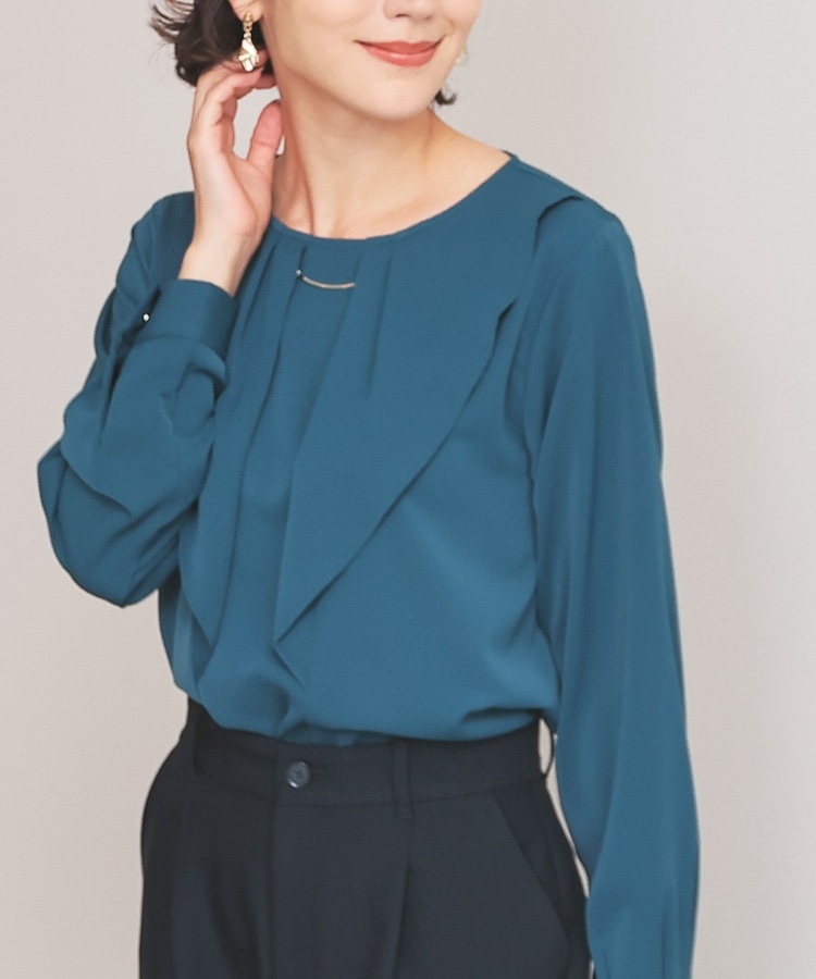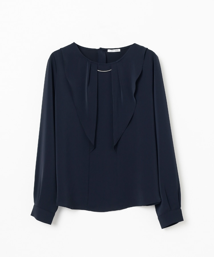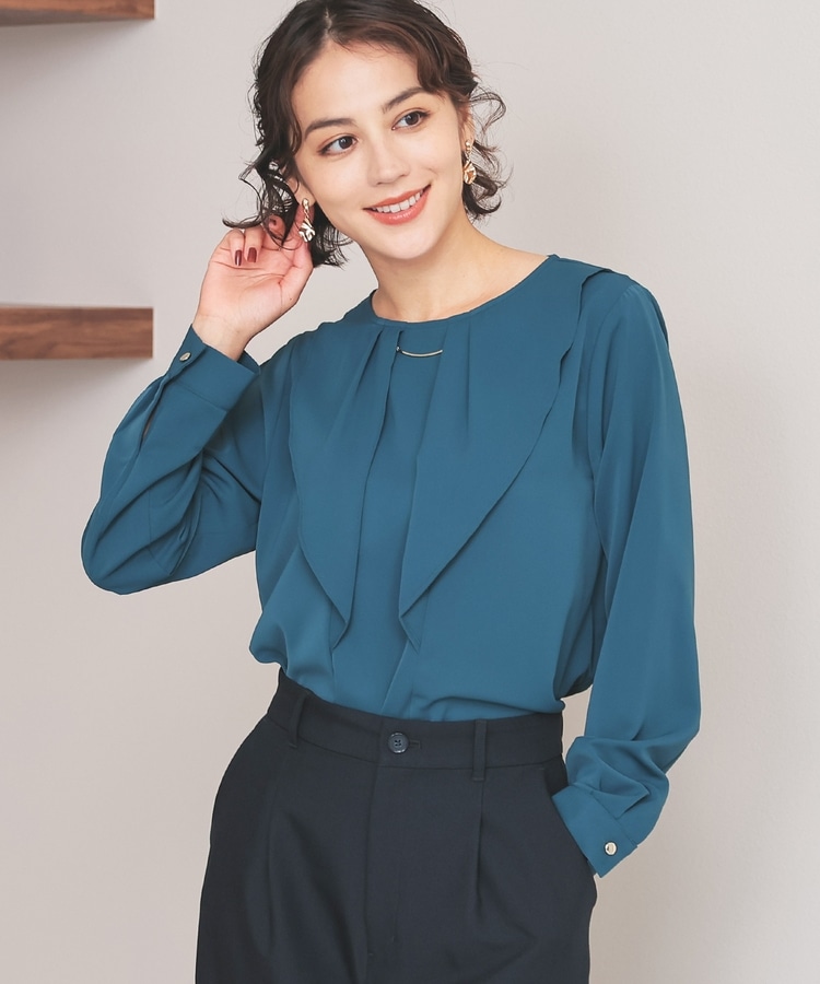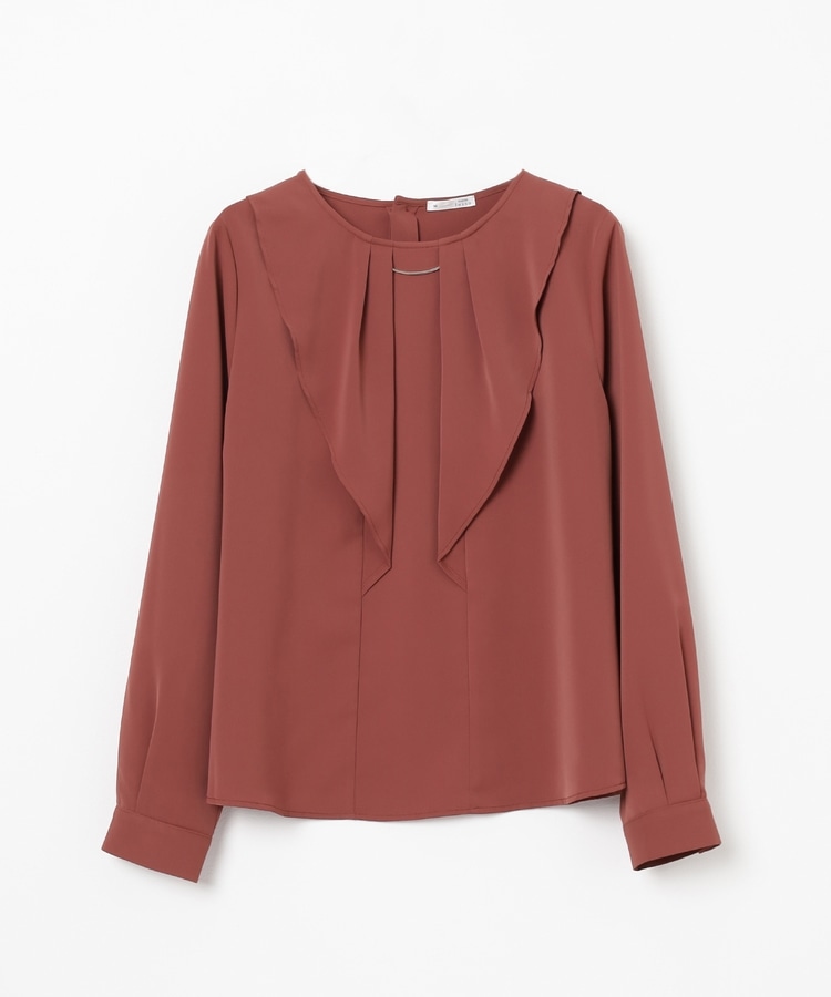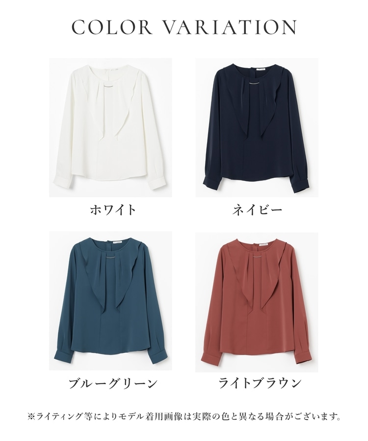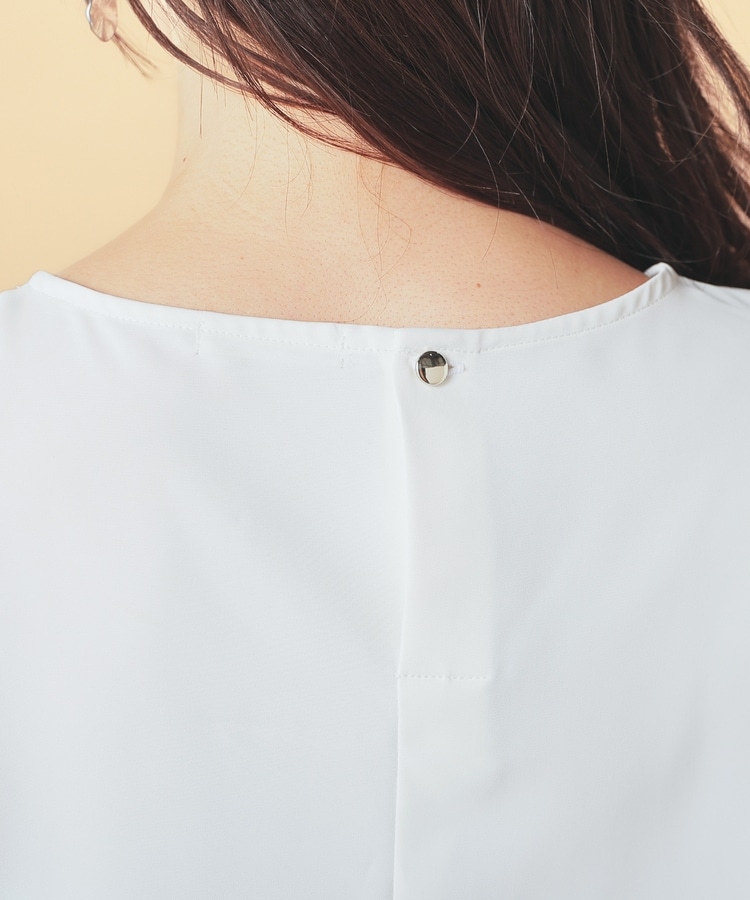 顔回りに華やかさをプラスしてくれるラッフルフリルに、シーンや気分に合わせて取り外しできるメタルパーツのアクセサリーがさりげないアクセント。