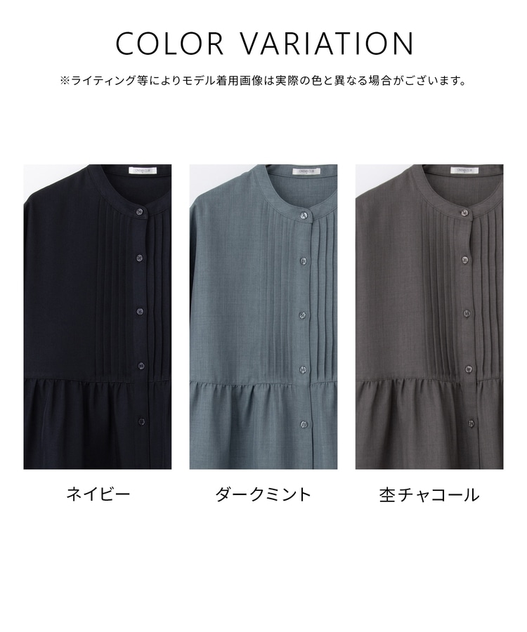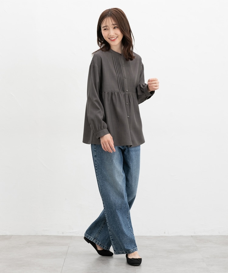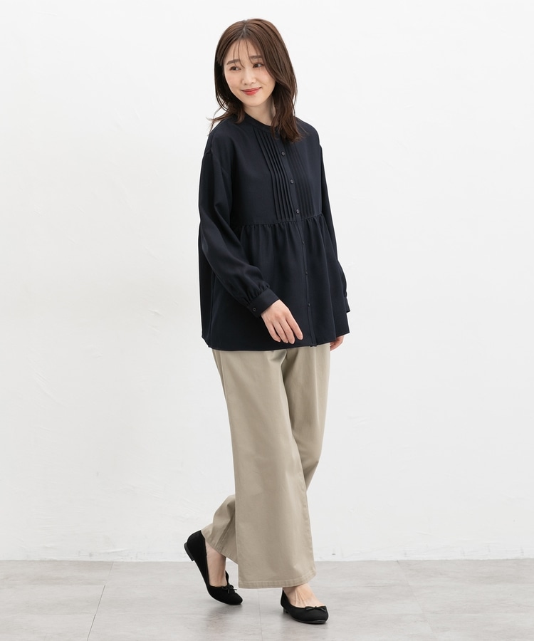 ギャザー入りウエスト切り替えのふんわりシルエットとフロントのピンタックで、ナチュラルな雰囲気あふれる大人可愛いデザイン。