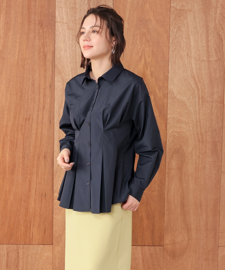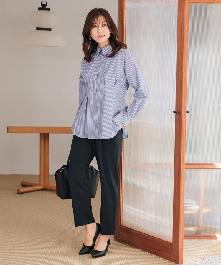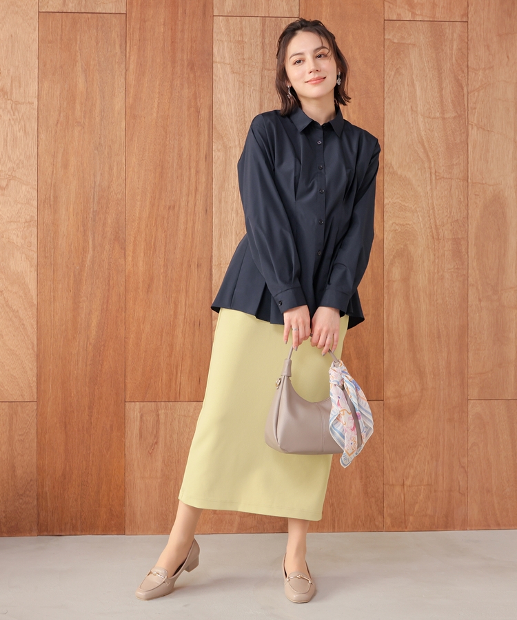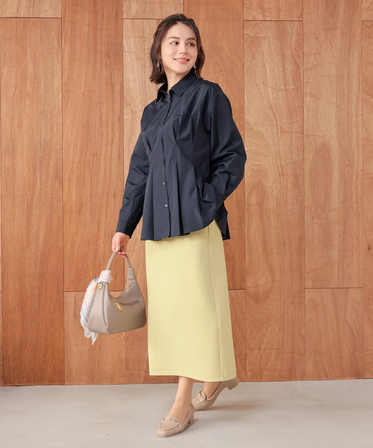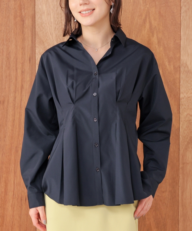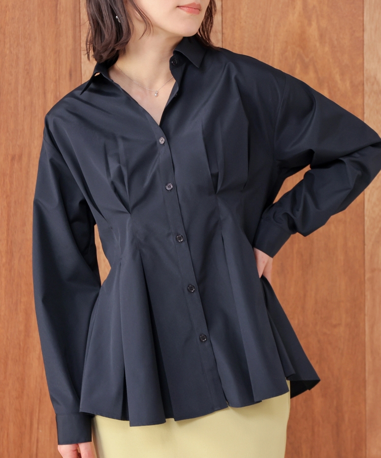 ベーシックなレギュラーカラーに、タックでウエストをほんのりシェイプさせた、メリハリのあるフェミニンシルエット。