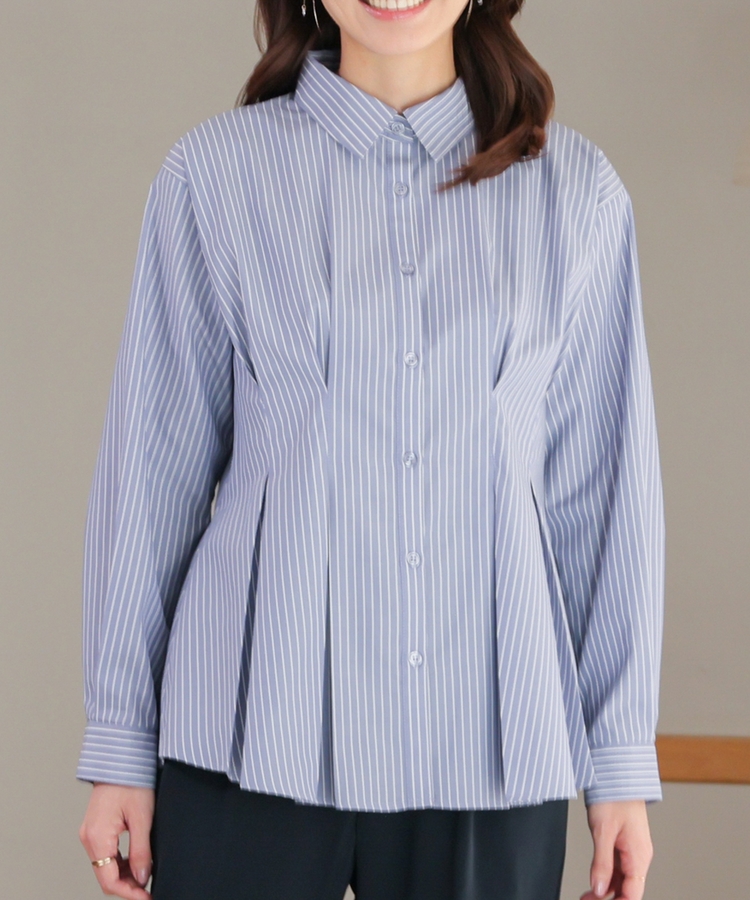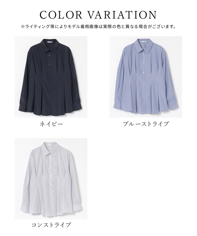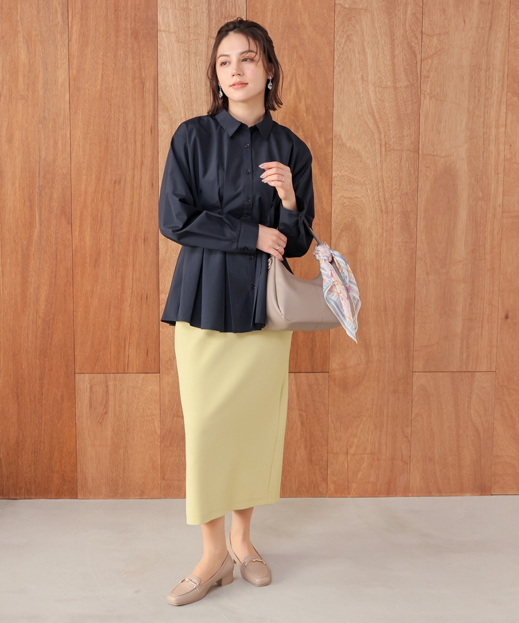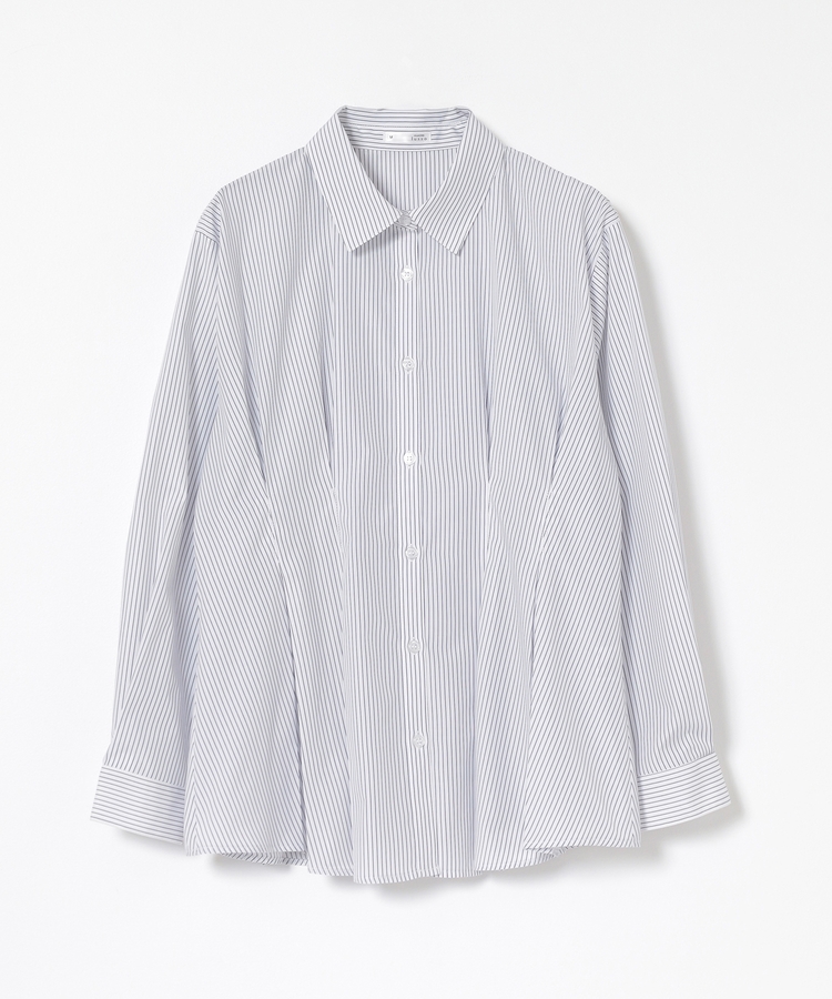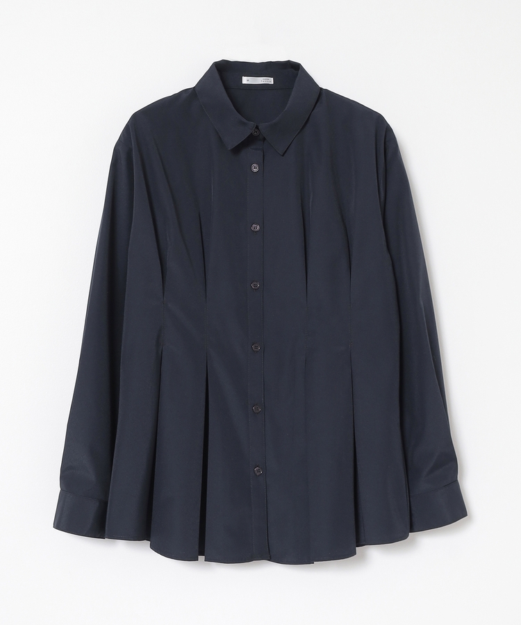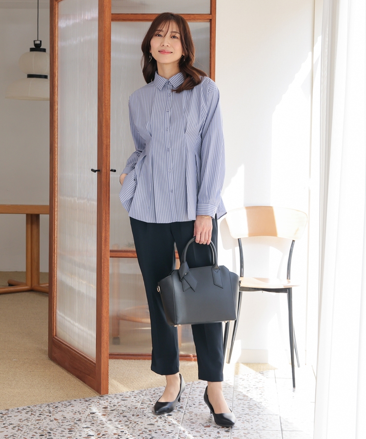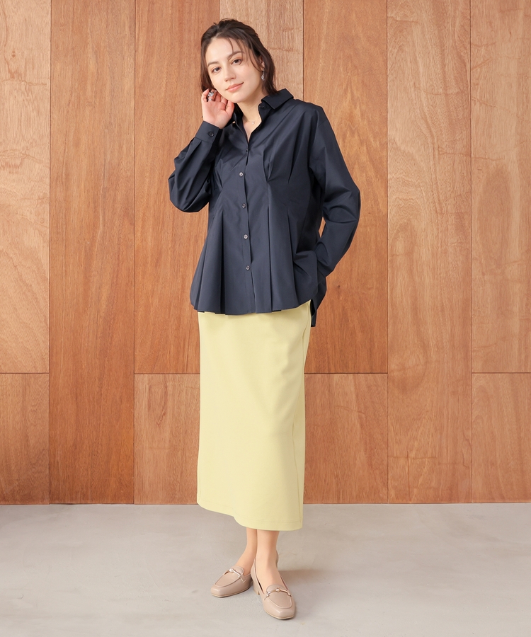 ベーシックなレギュラーカラーに、タックでウエストをほんのりシェイプさせた、メリハリのあるフェミニンシルエット。