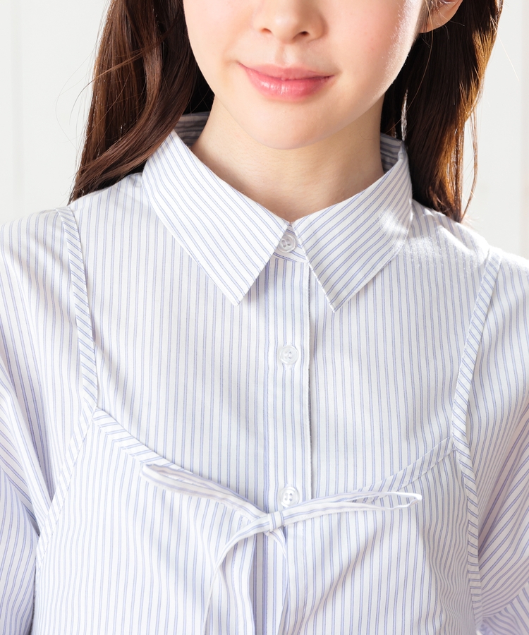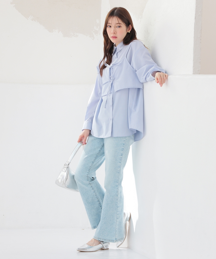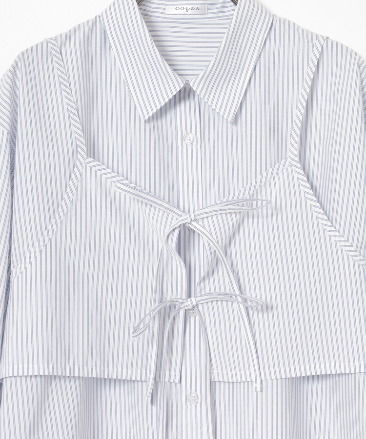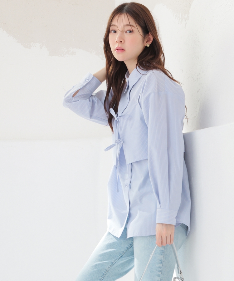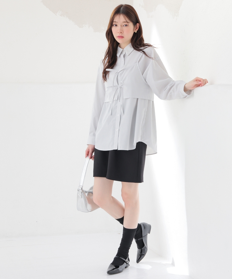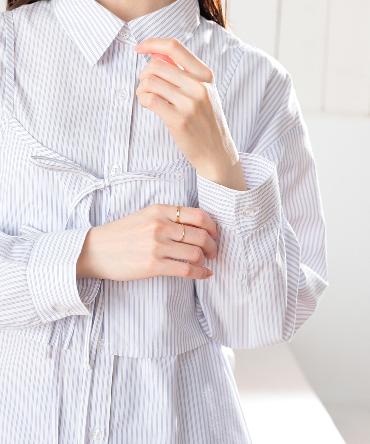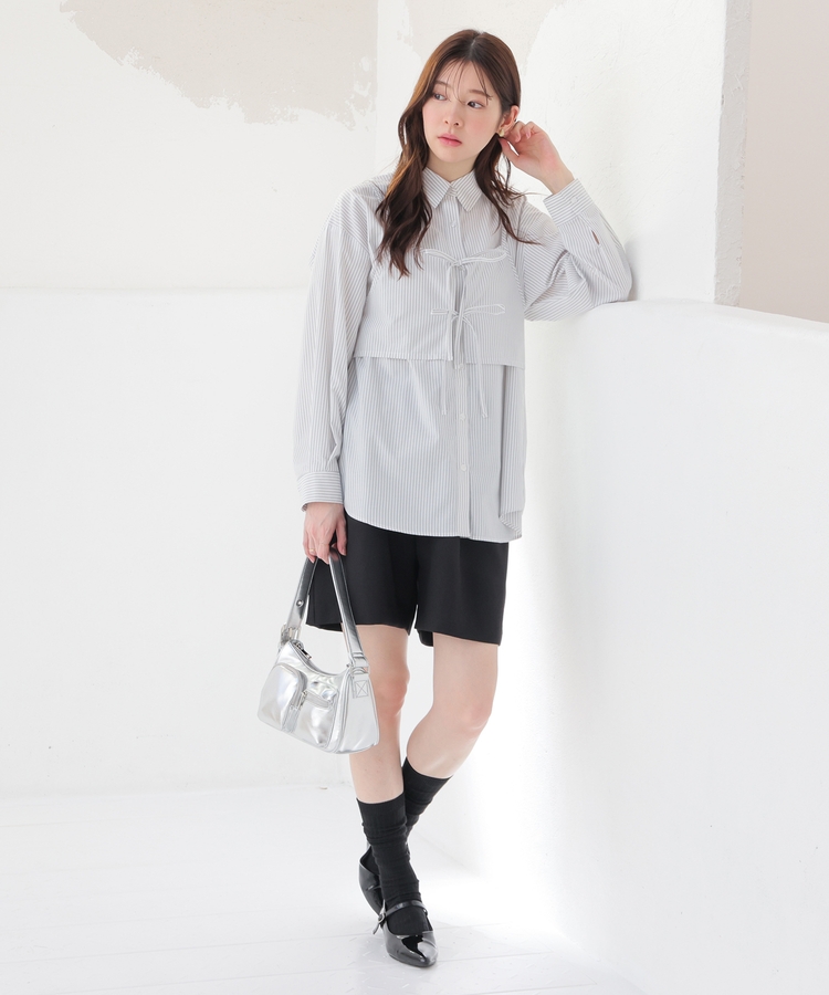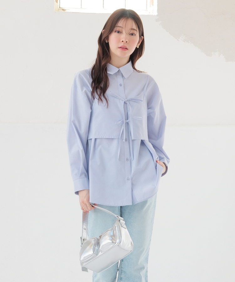 ベーシックなレギュラーカラーのシャツに、さっと重ねるだけでトレンド感がアップするキュートなダブルリボンのビスチェが付いたセット。