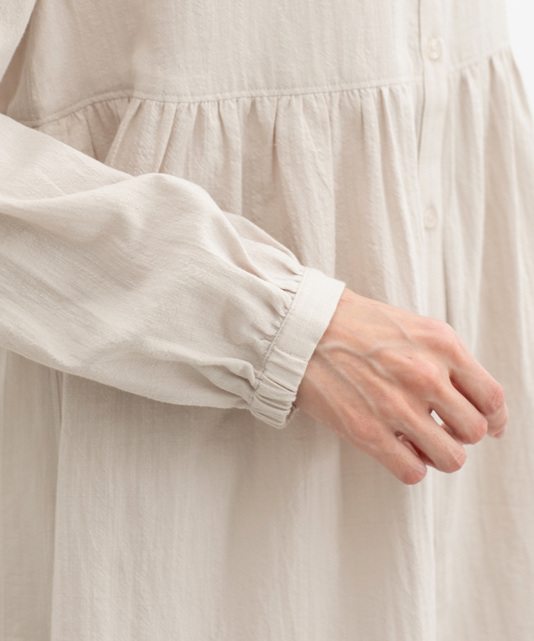 たっぷりギャザーのウエスト切り替えとふんわり袖が大人可愛い、ナチュラルフェミニンなデザイン。